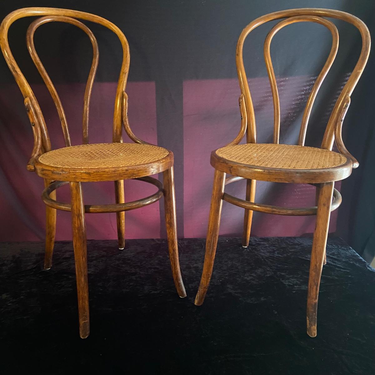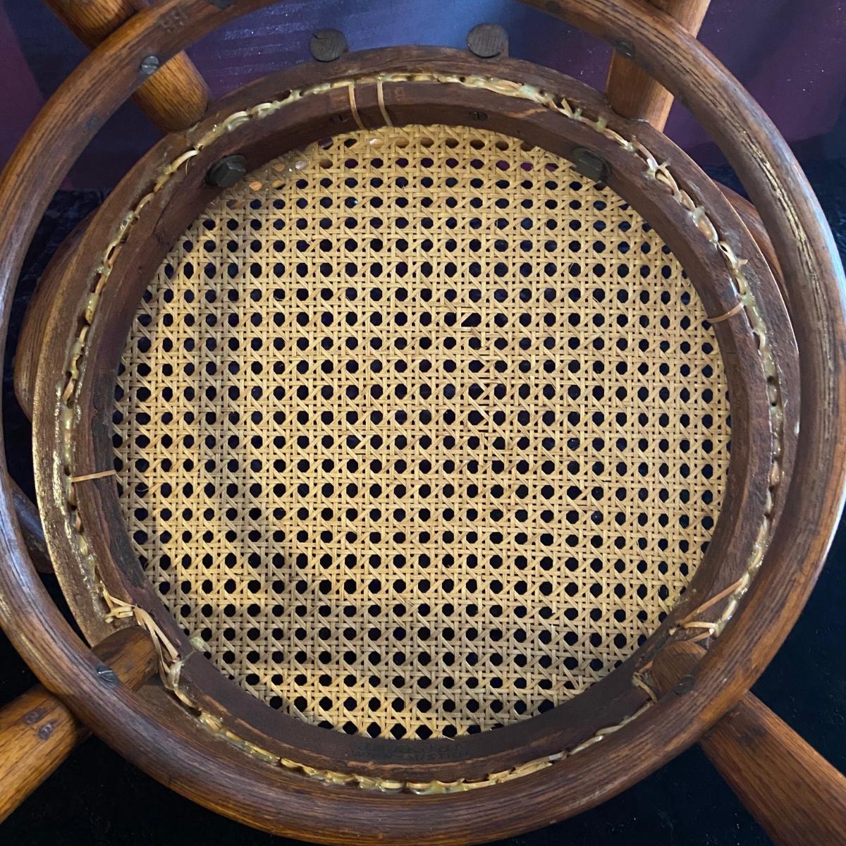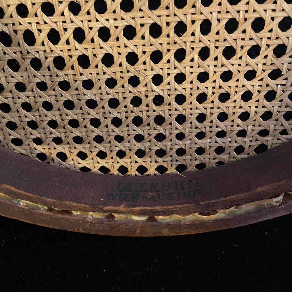 This lot contains a lovely set of wooden and wicker bentwood chairs. The seat is 16”D and the chair stands 35.5”H with a 18.5” seat height. Both are stamped with “J&J Kohn Austria” and are lightweight. On one the backing has popped out of the screw. See pictures for details.