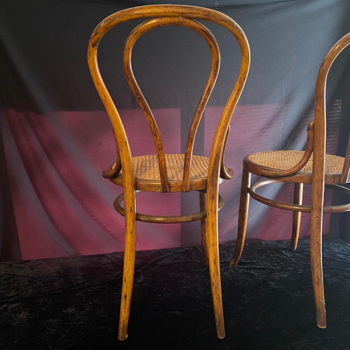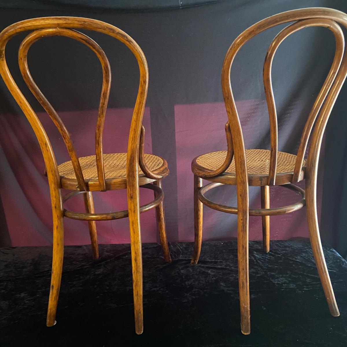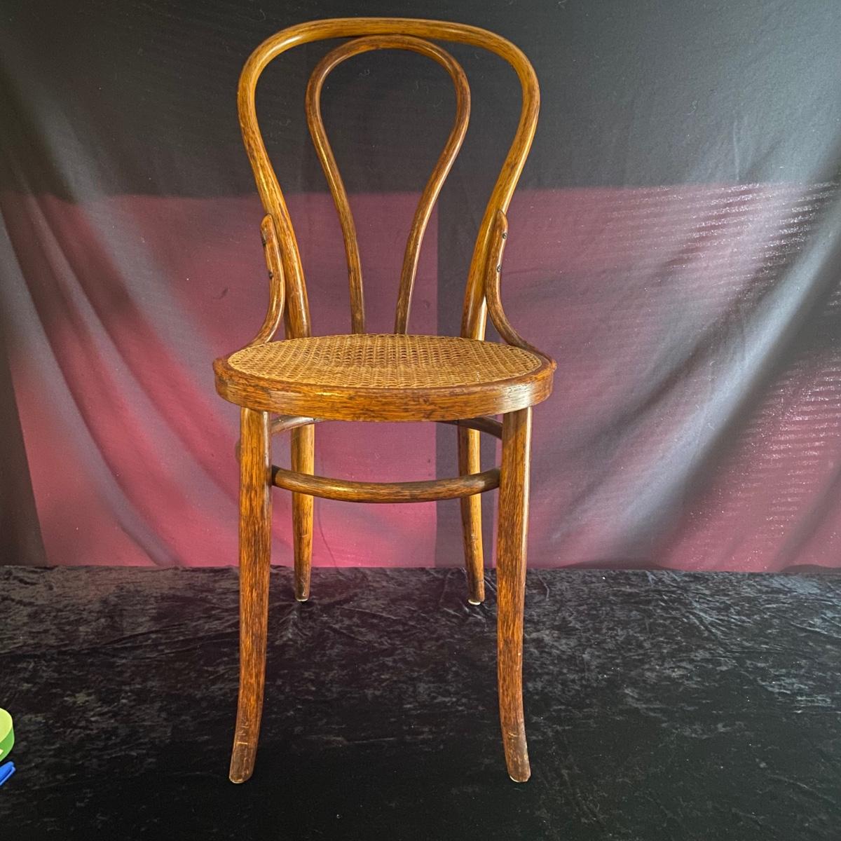 This lot contains a lovely set of wooden and wicker bentwood chairs. The seat is 16”D and the chair stands 35.5”H with a 18.5” seat height. Both are stamped with “J&J Kohn Austria” and are lightweight. On one the backing has popped out of the screw. See pictures for details.