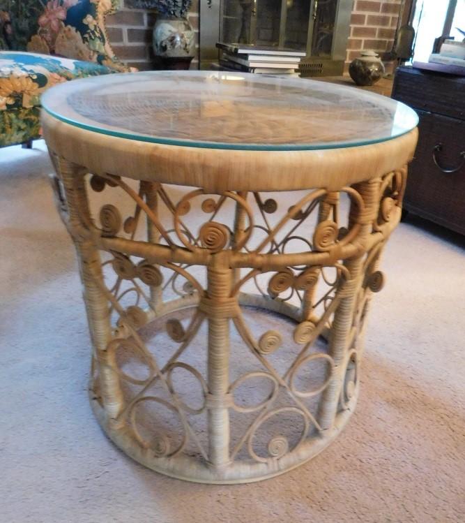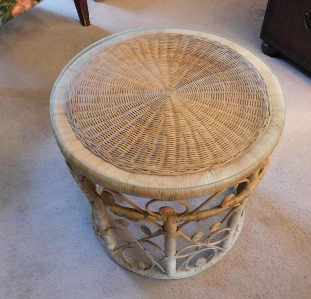 Set of Wicker Glass Top Stands. Bidding on both for one. Condition is good. May need cleaning.