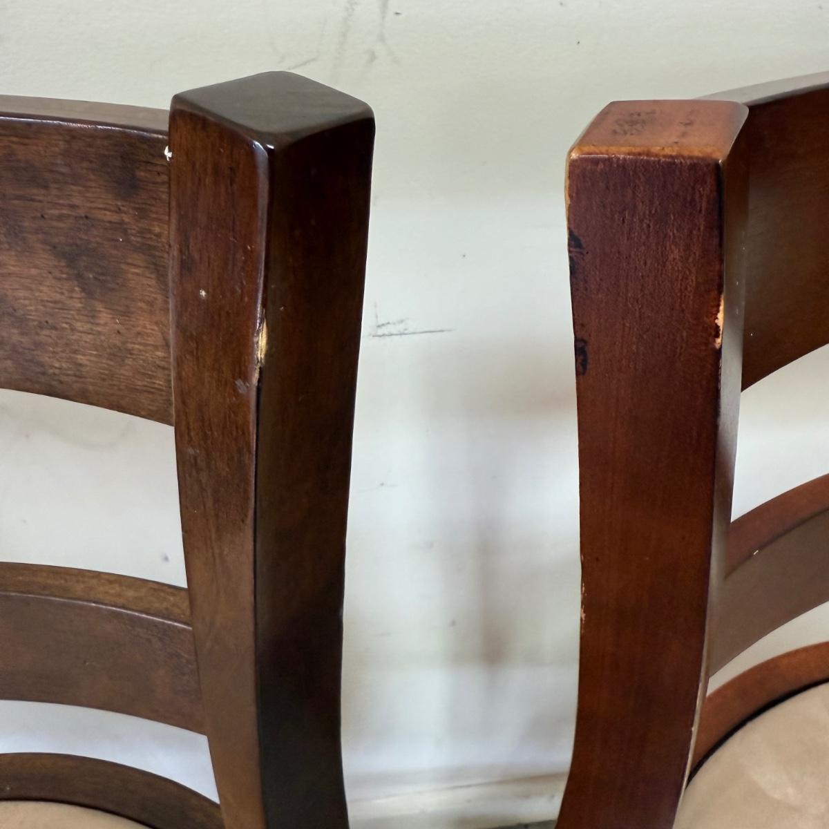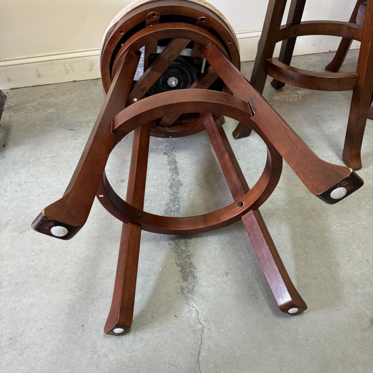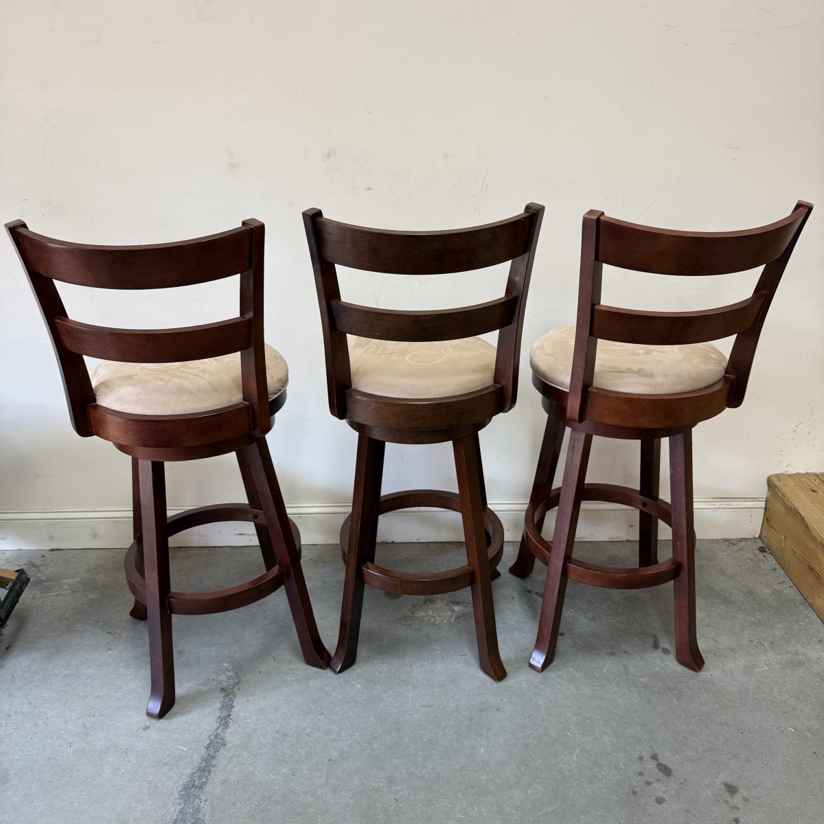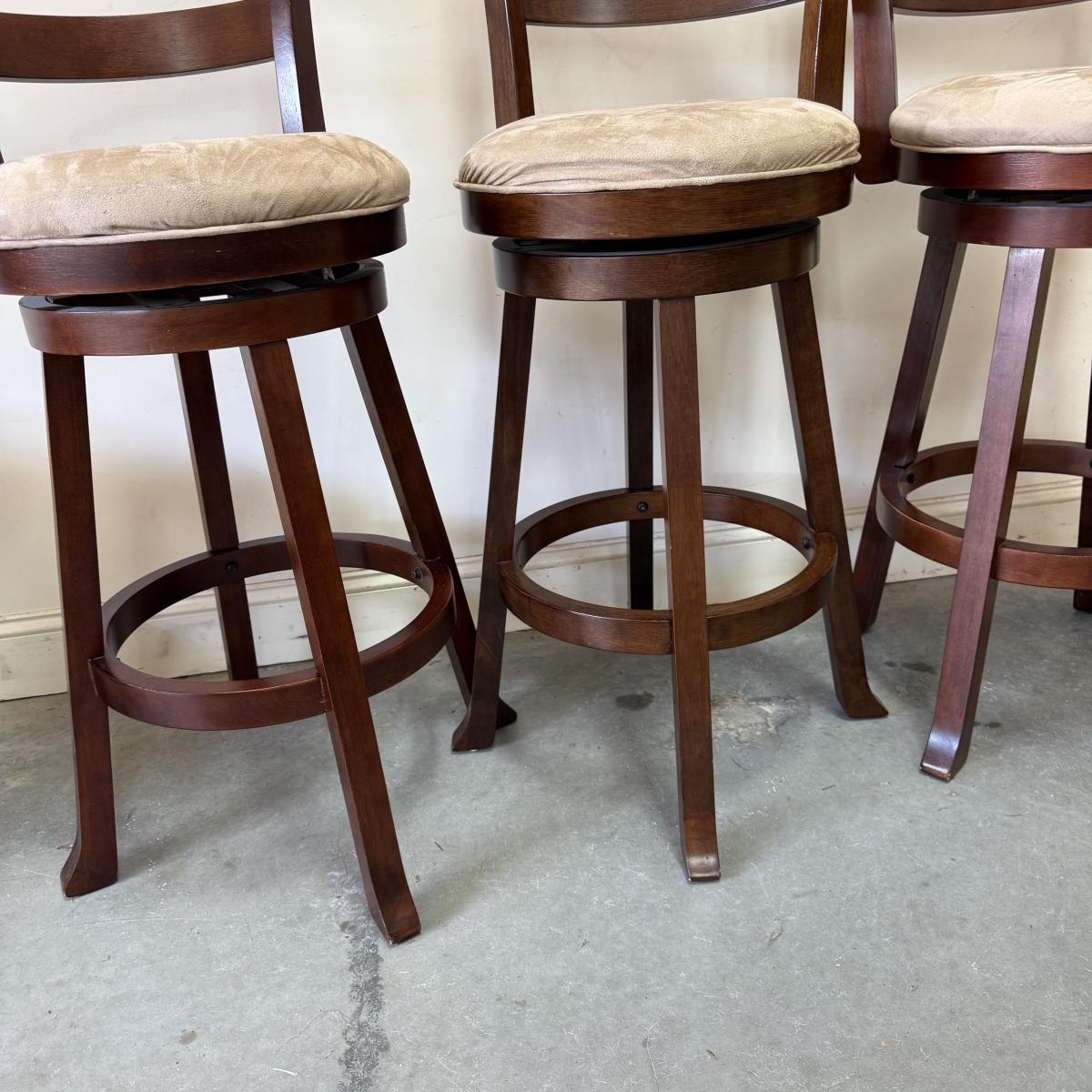 This lot contains a set of three wood bar stools. The cushioned seats appear to have suede upholstery. The seats swivel and each chair measures 18” x 18” x 43”H with a seat height of 30”H. There are a couple of small scuffs on the edges. Local pick up only.