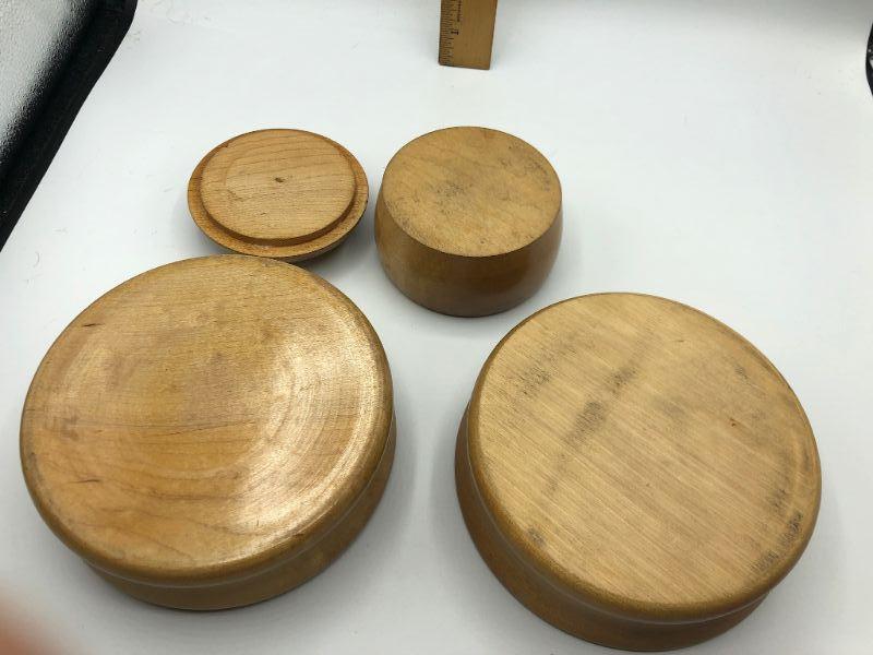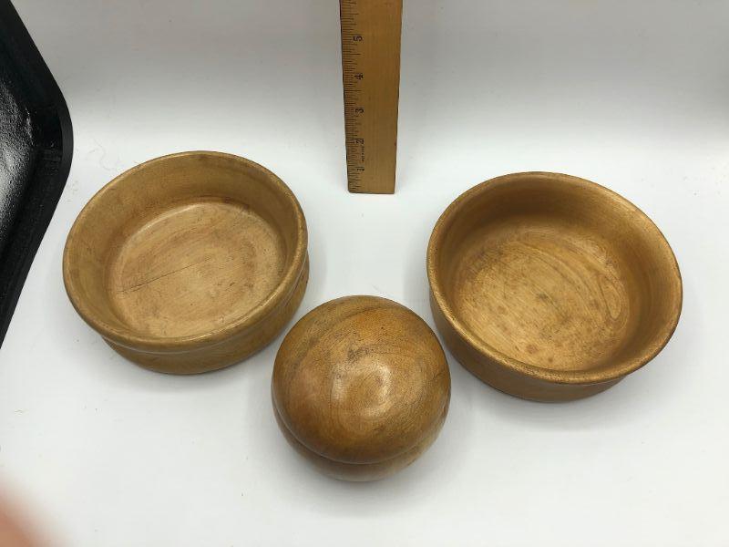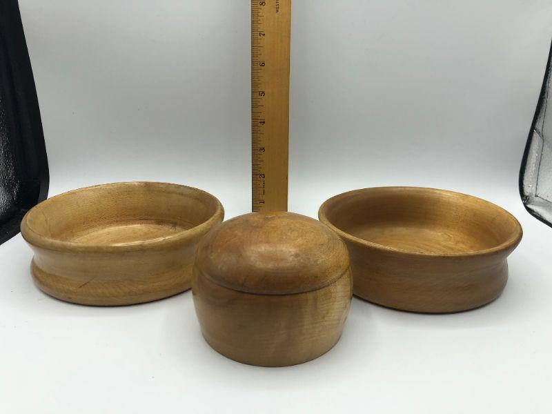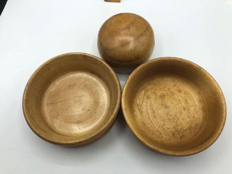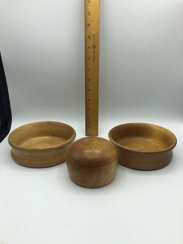 Set of solid wood bowls and a matching lidded trinket box. Light finish. Good used vintage condition.