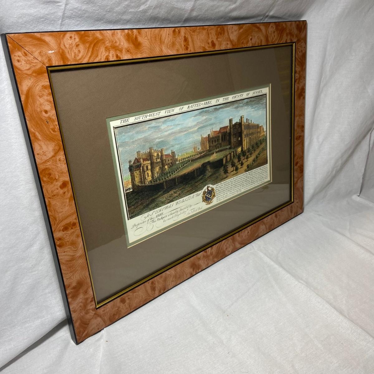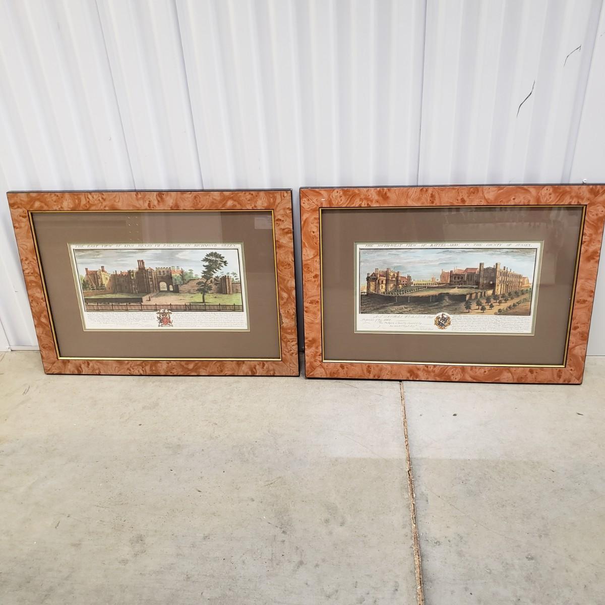 This lot contains two prints both under glass and in what appears to be wooden decorative frames. The images in each piece appear to be of some English historical sites. One is labeled “The south-west view of Battel-Abby, in the county of Sussex”. And the other is labeled “The east view of King Henry VII Palace, on Richmond Green”. They both measure 27.75” x 20”. Shipping available. Shipping can be costly. We suggest contacting our preferred local shipping provider, Postage Express, with dimensions and getting an estimate before bidding: (828) 255-9250 or shipping@postageexpressnc.com.