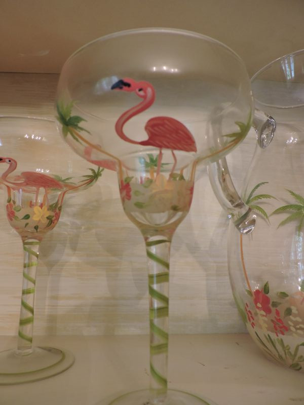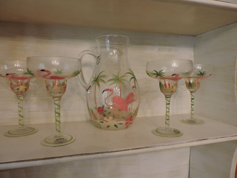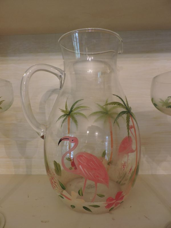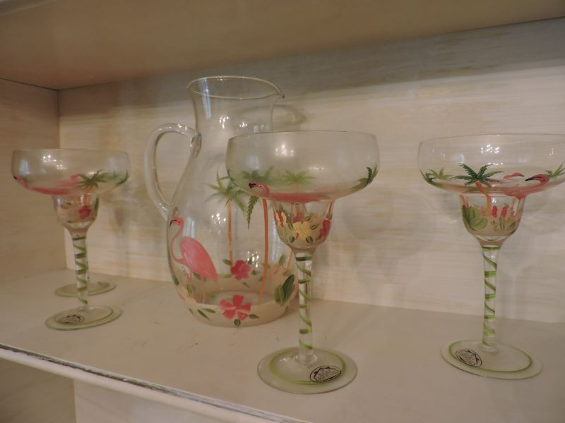 Cute set of hand-painted flamingo margarita glasses (4) and pitcher. Just in time for summer parties! Pitcher stands 10.5” and glasses are 7.5”.