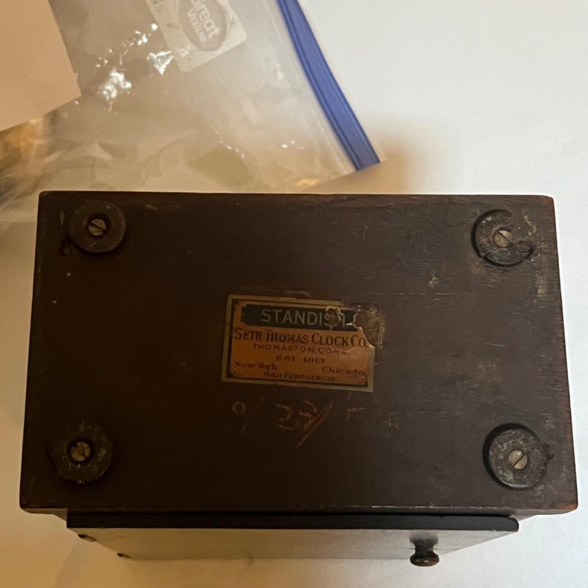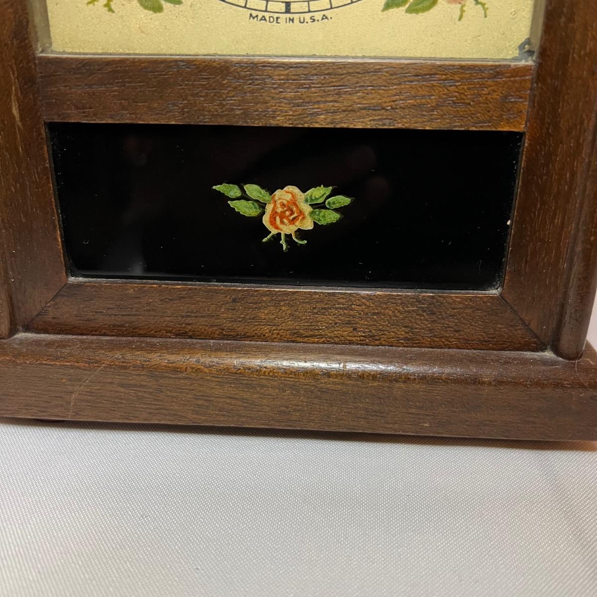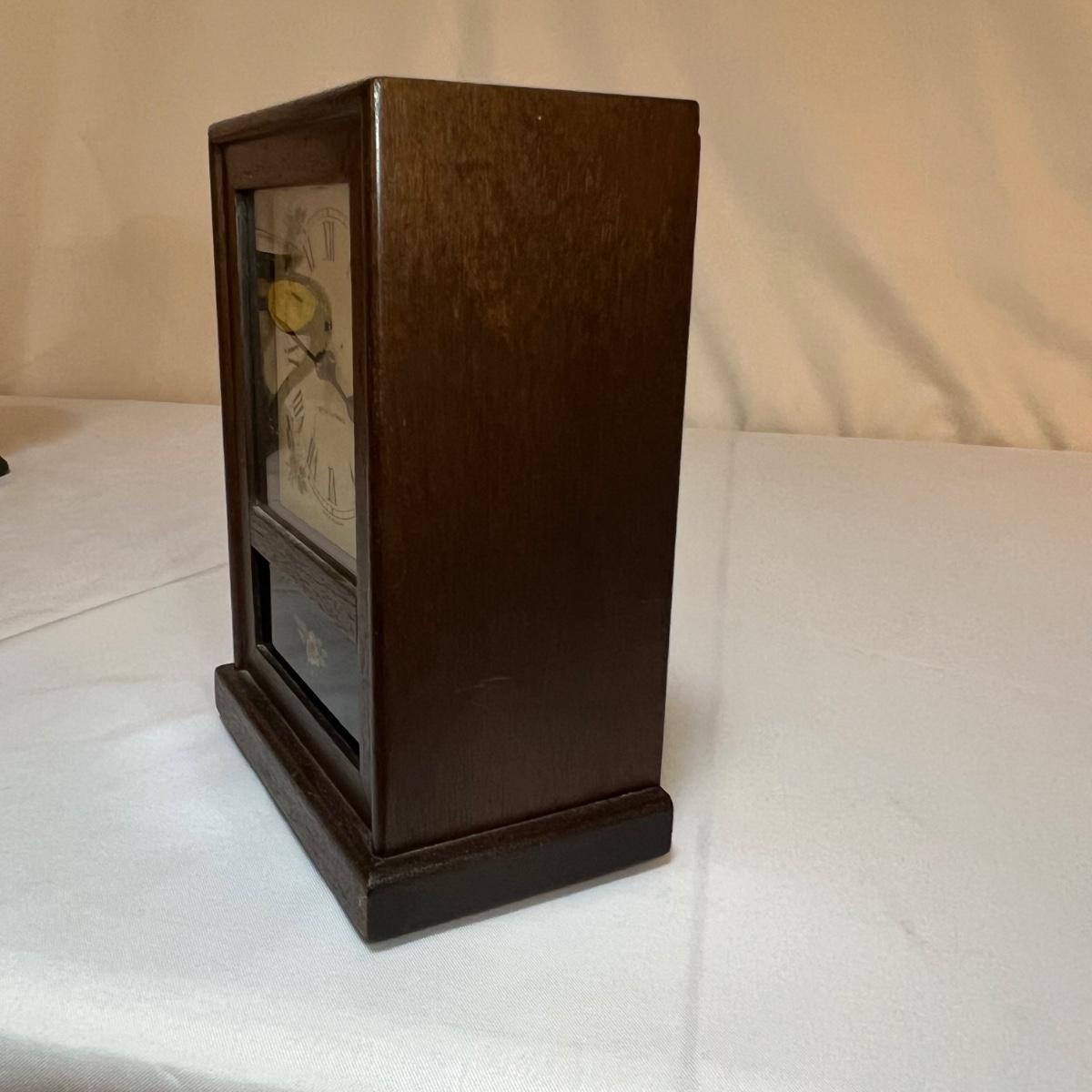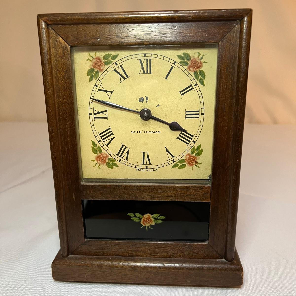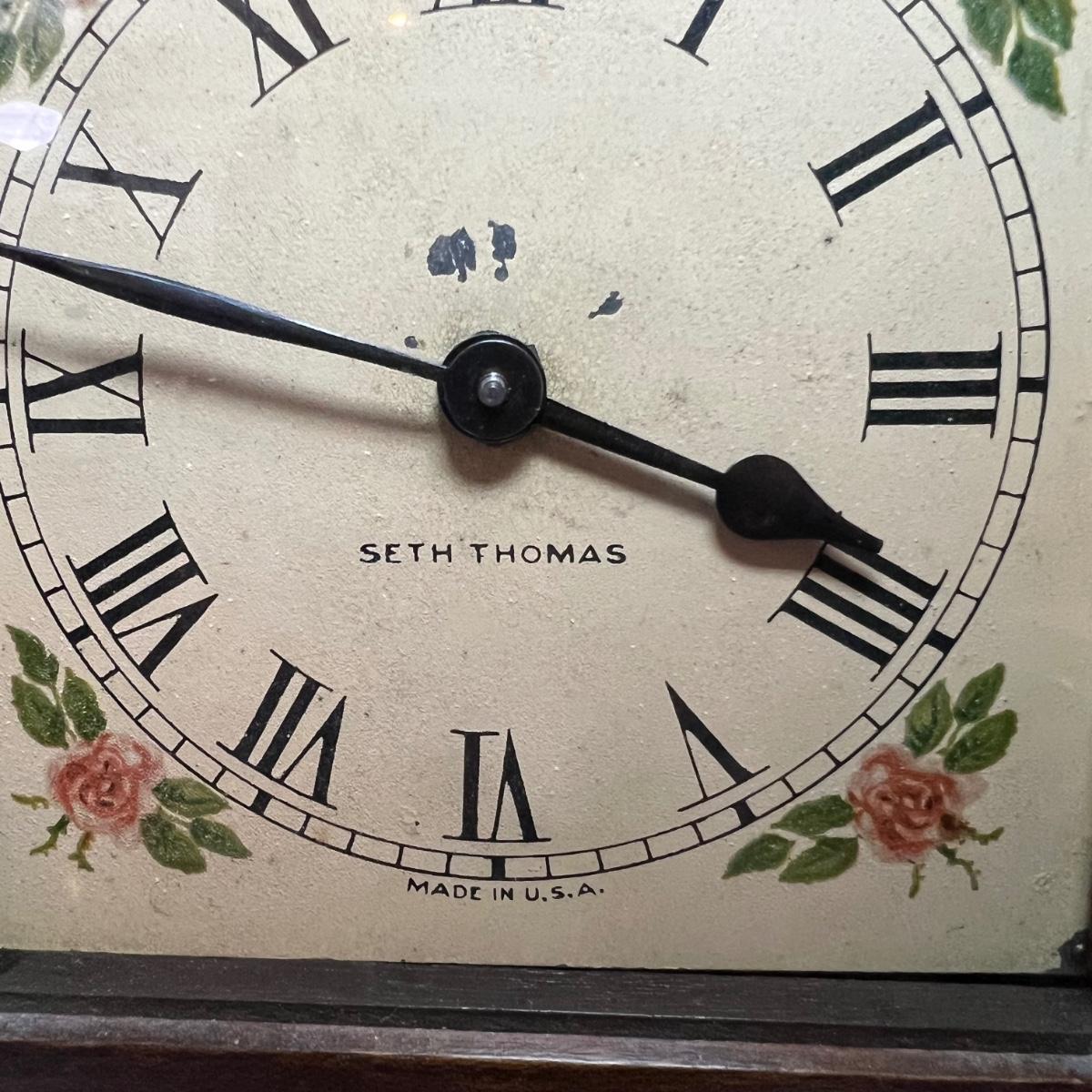 This lovely wooden mantle clock made by Seth Thomas is an automatic 8 Day alarm clock. Note that clock was not tested. Measures 6” x 4” x 8.5”H.
