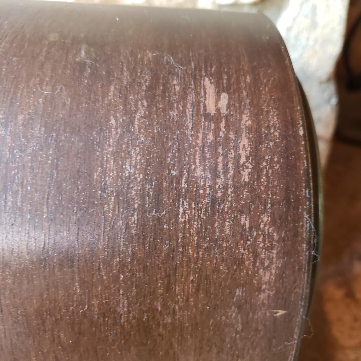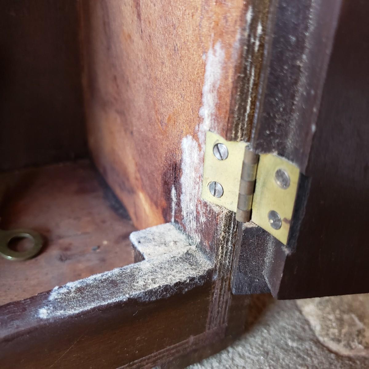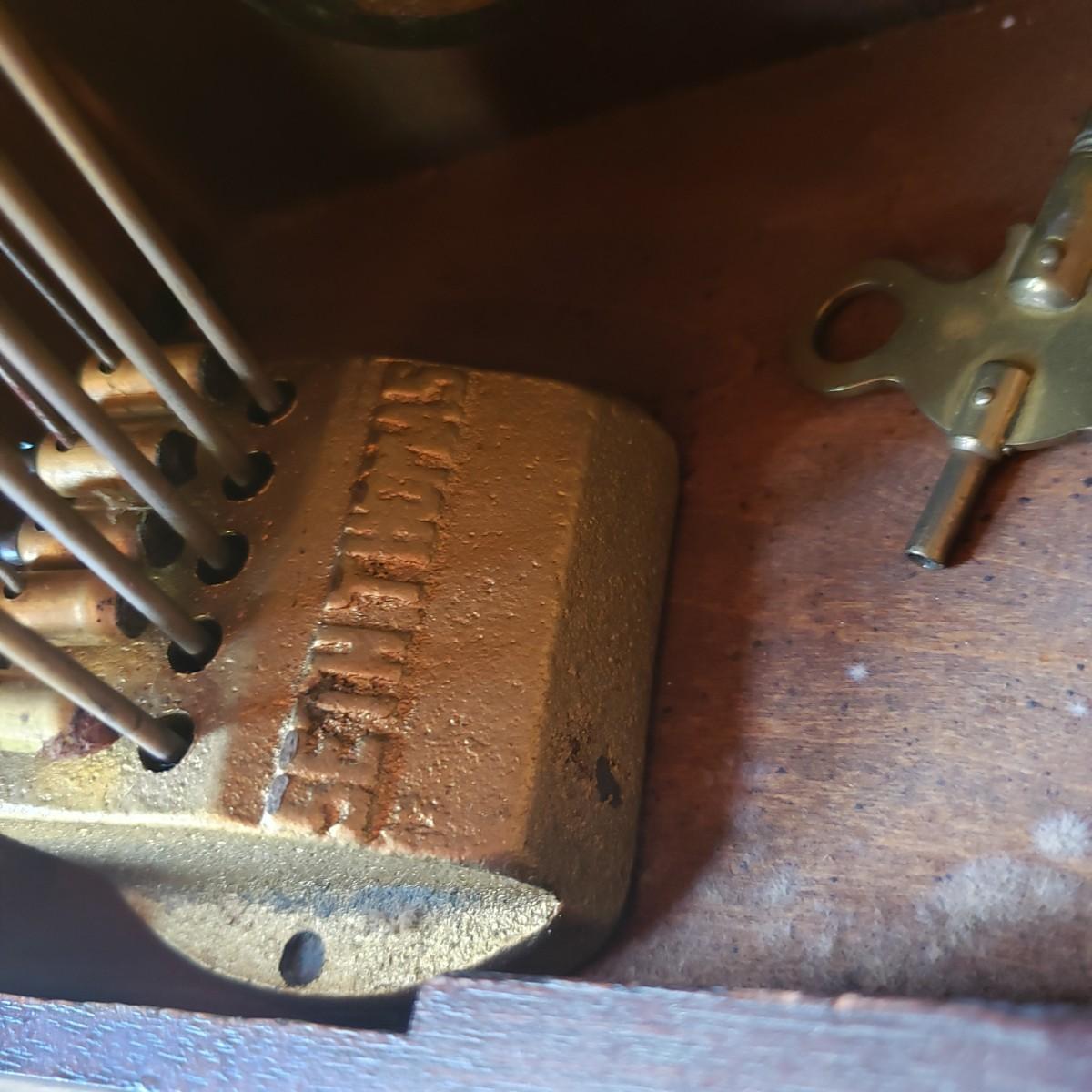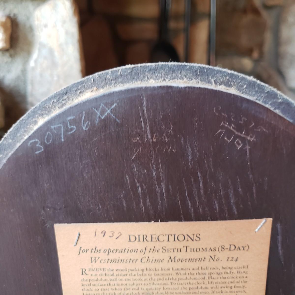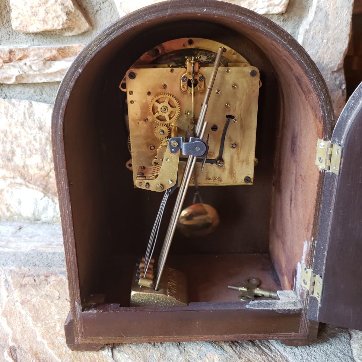 This exquisite mantel clock was made by Seth Thomas. There is two toned wood with a scalloped type bottom. Inside the door is some what appears to be mold, yet feel it could be washed off. Comes with original paper and key. Clock measures 8" x 5" x 11"H.