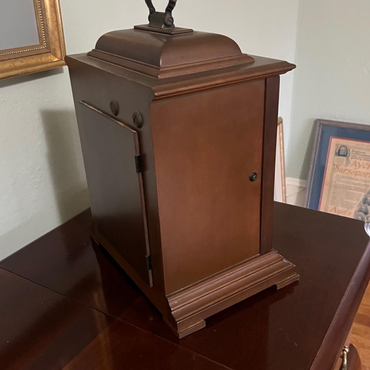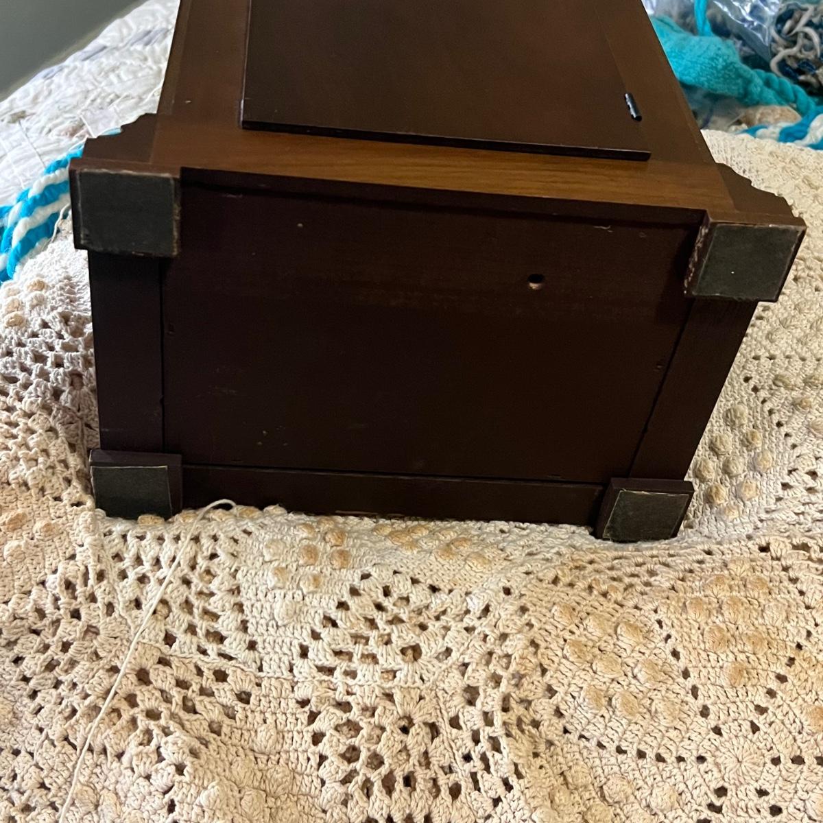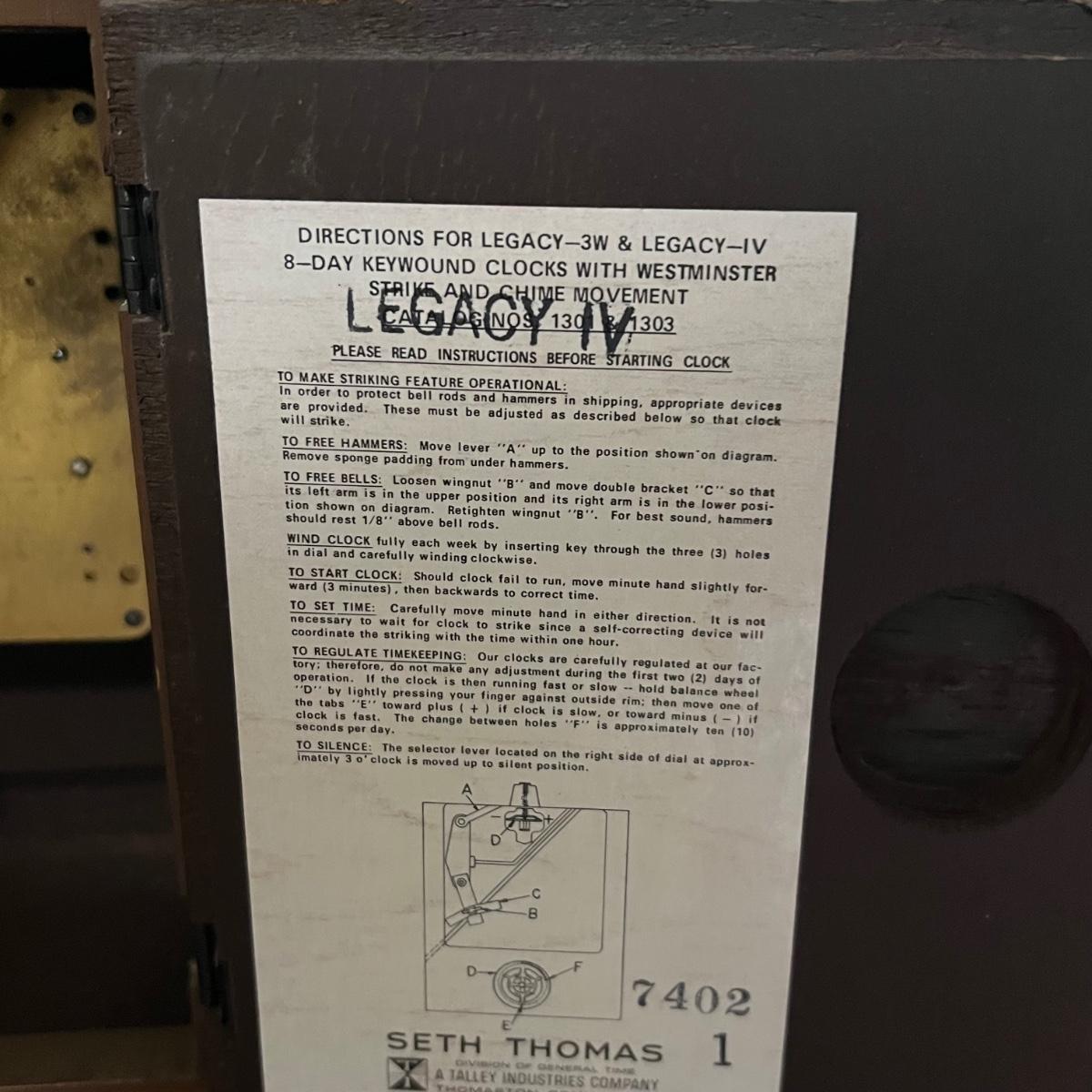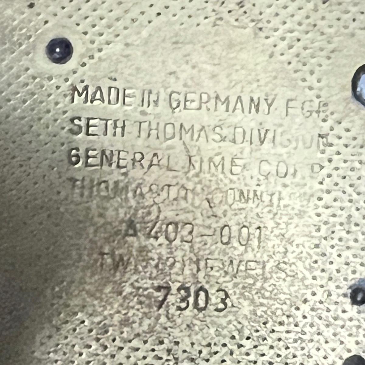 This Seth Thomas clock has a wooden casing with metal handle. See photos for more information on model and mechanisms. No key is included.