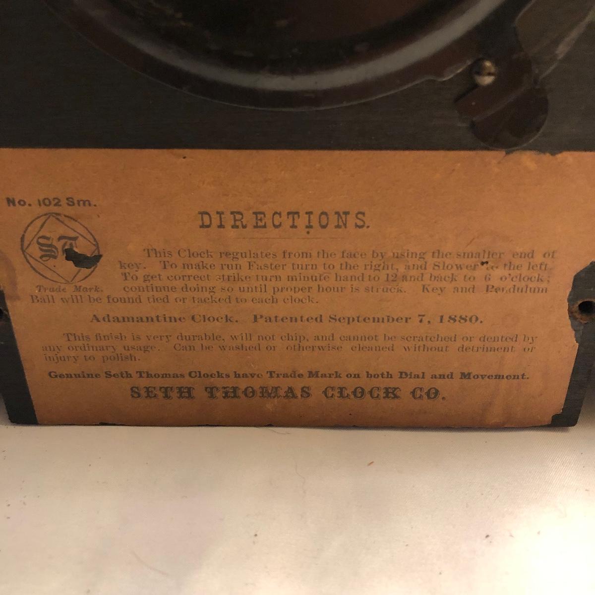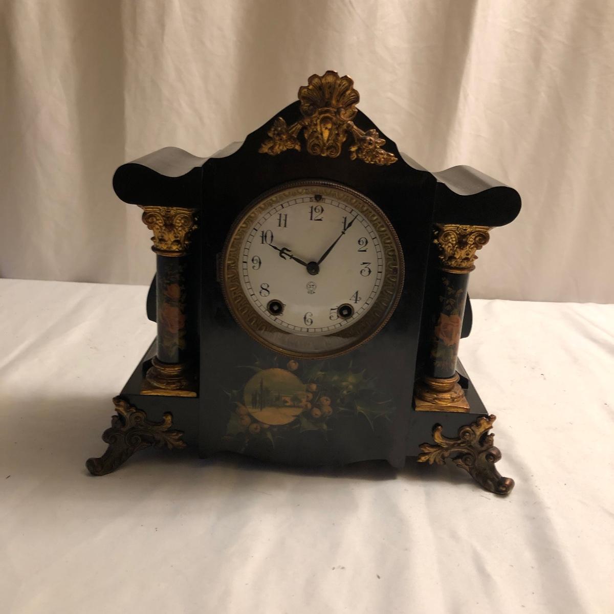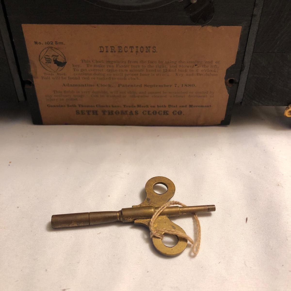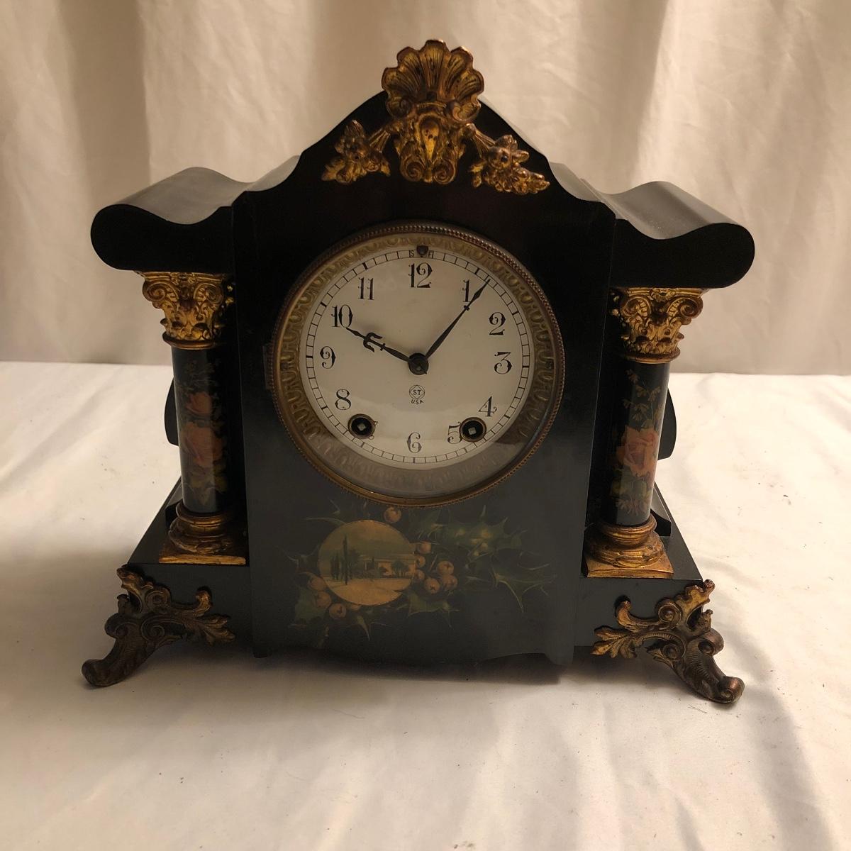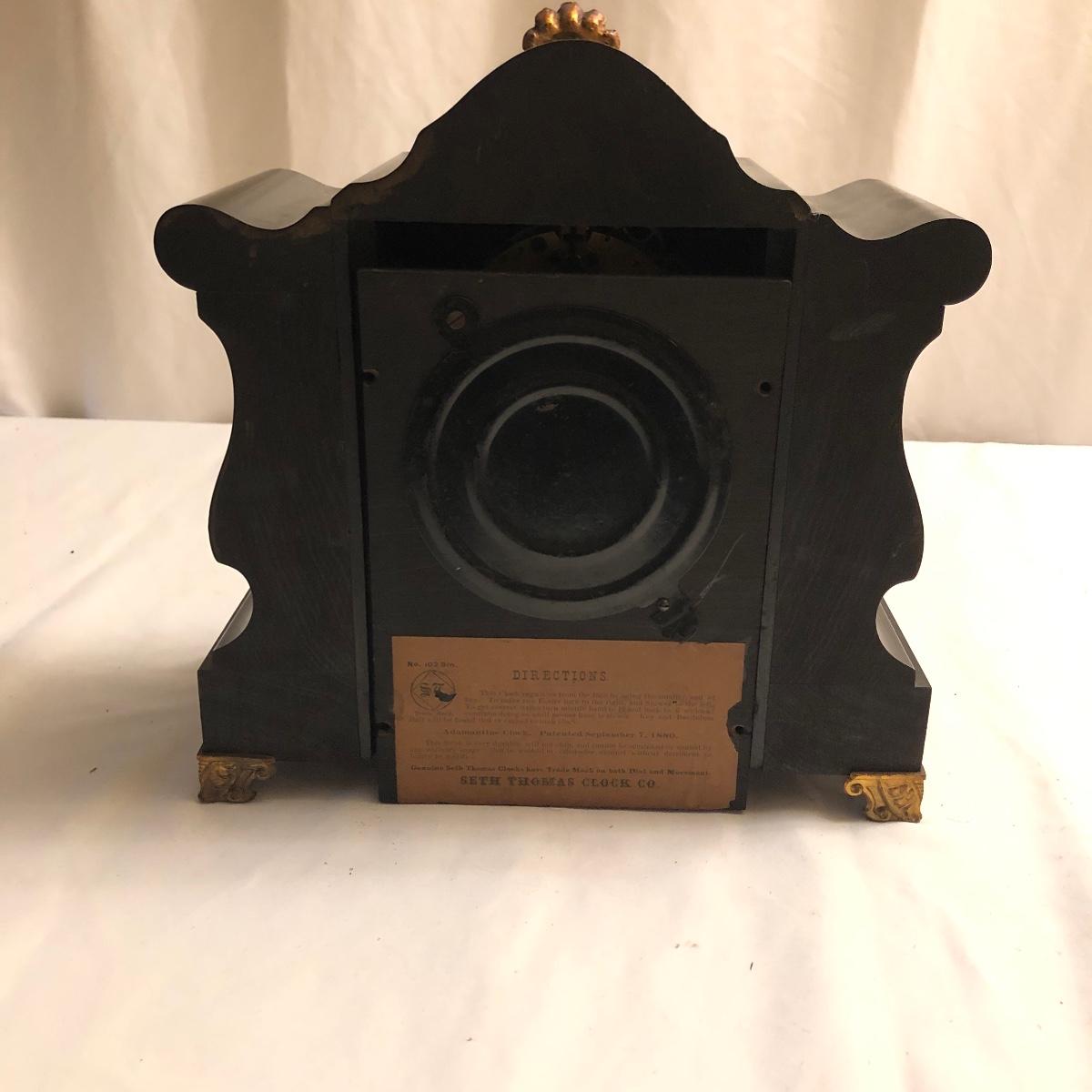Lot includes wooden Seth Thomas Mantle Clock with metal feet, adornments and key. Clock worked when tested. Clock measures 6” x 11” x 11”. Clock is missing the screws for back cover.