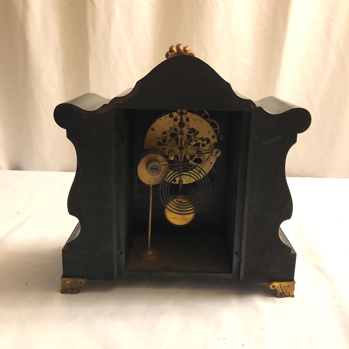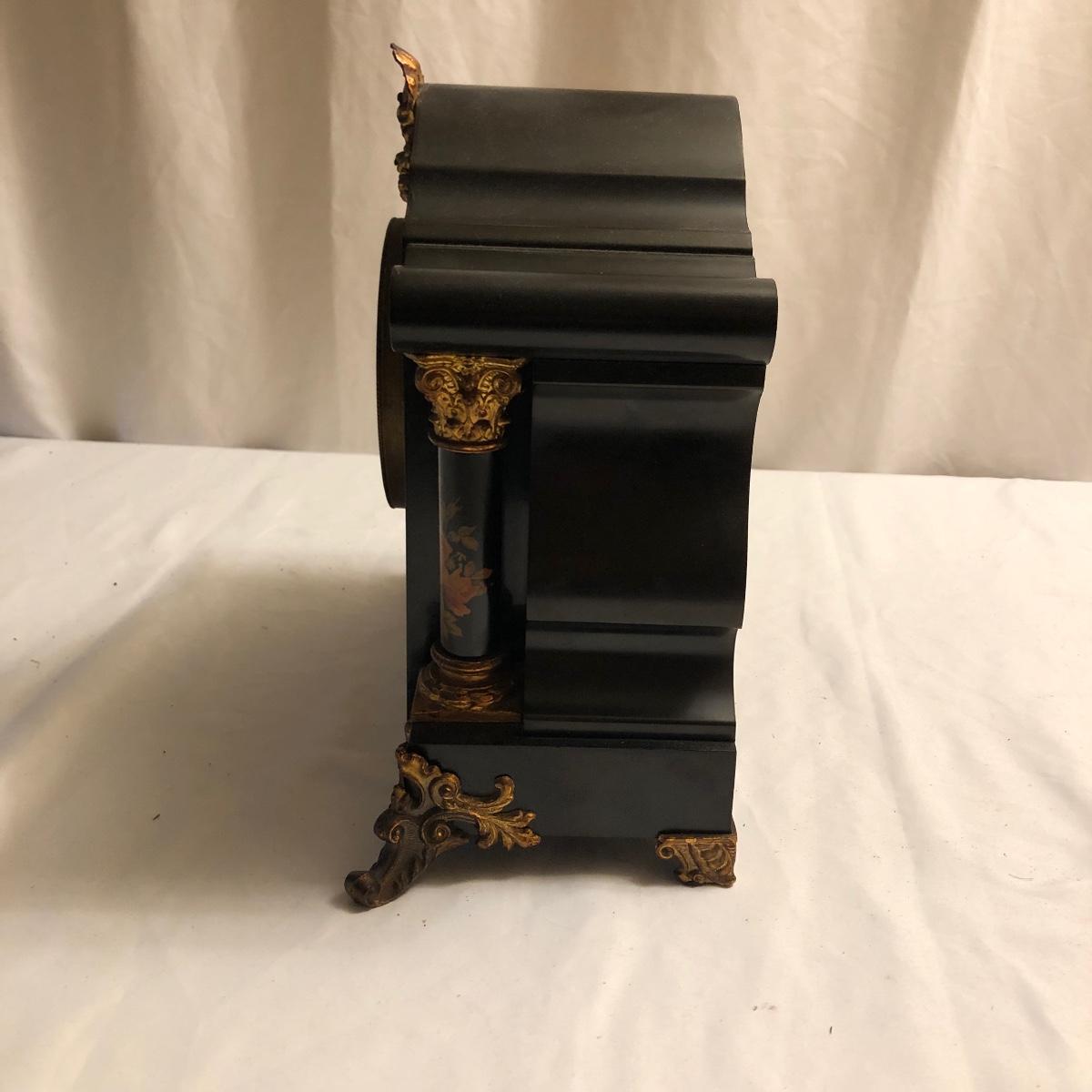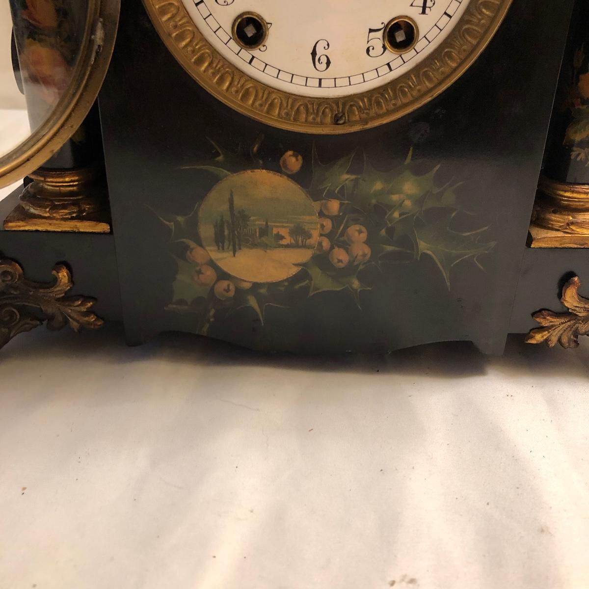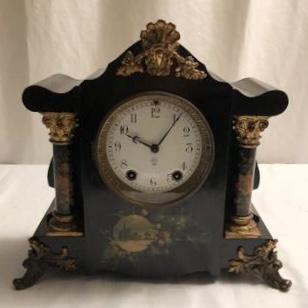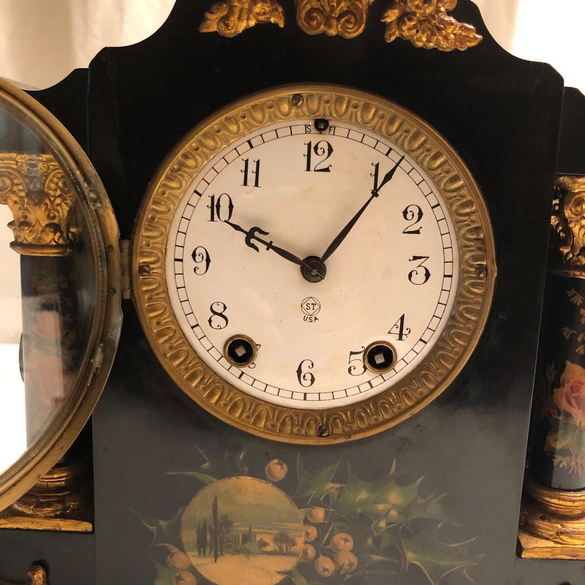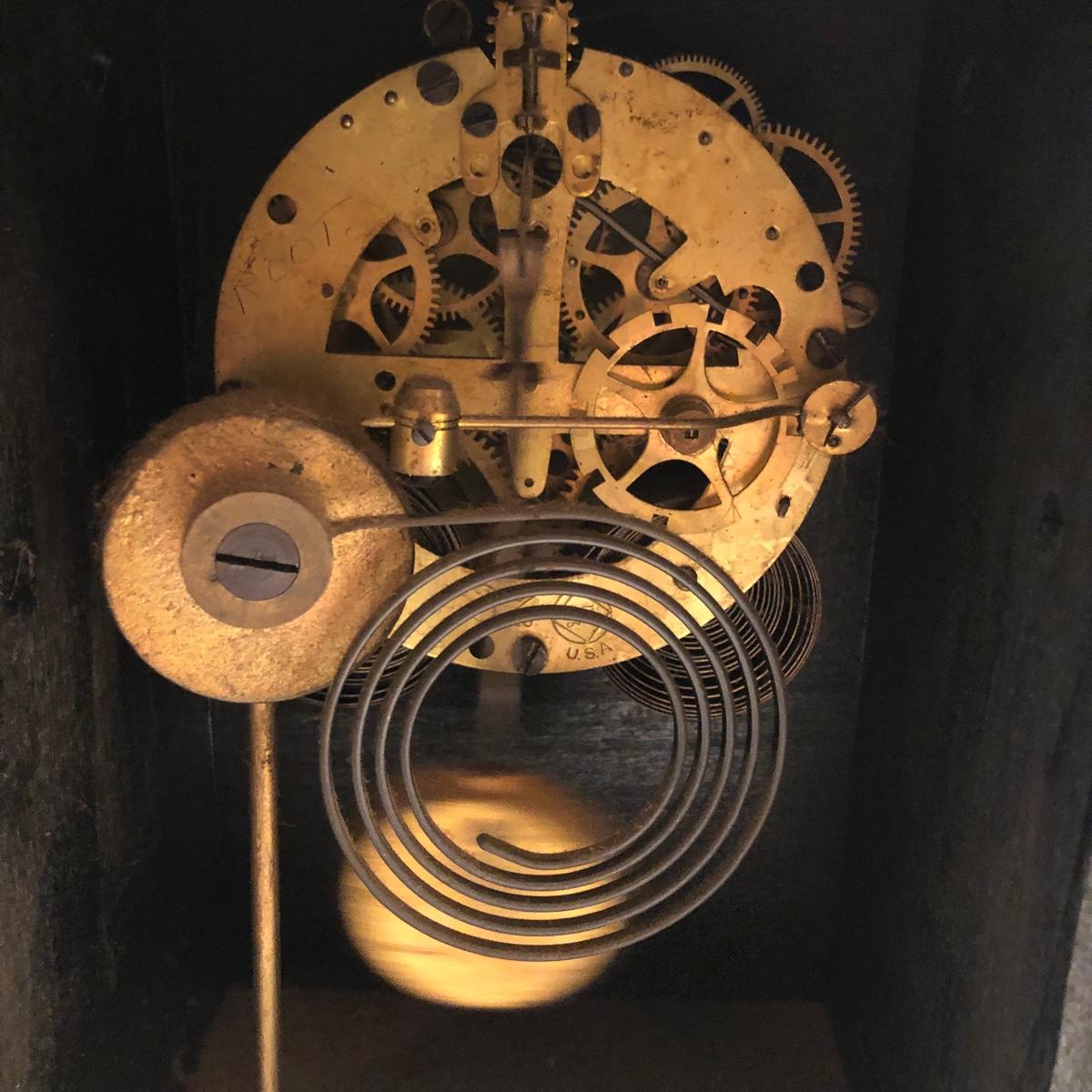 Lot includes wooden Seth Thomas Mantle Clock with metal feet, adornments and key. Clock worked when tested. Clock measures 6” x 11” x 11”. Clock is missing the screws for back cover.