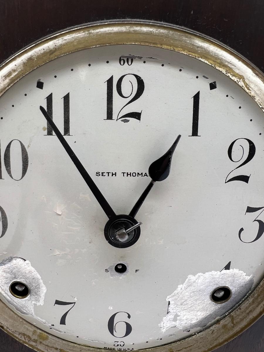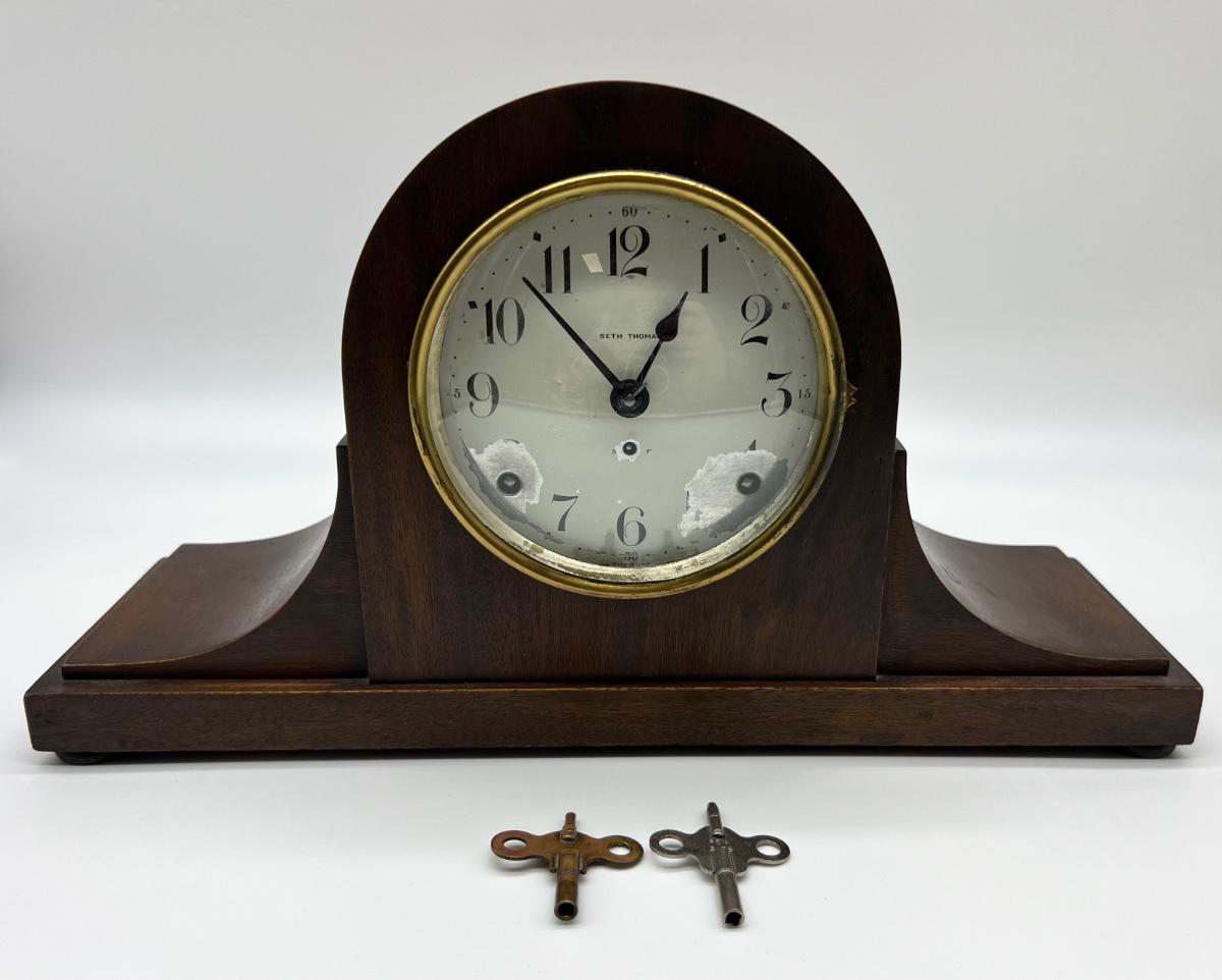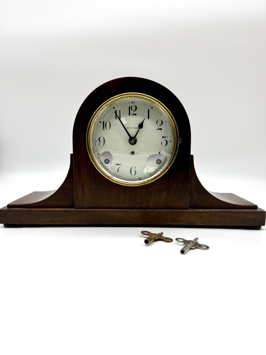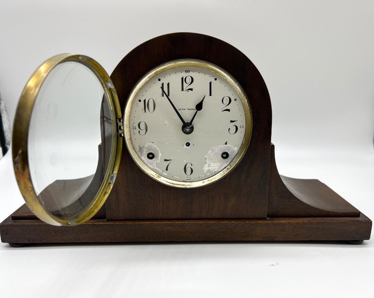 SETH THOMAS Tambour Mantle Clock Measures 9 inches tall, 16 1/2 inches wide and 6 inches deep. This clock was serviced last in 2018. Clock chimes loudly but may need to be serviced. Two keys are included. See pictures as numbers 4,5 and 8 show lots of wear from key use. Selling as is.