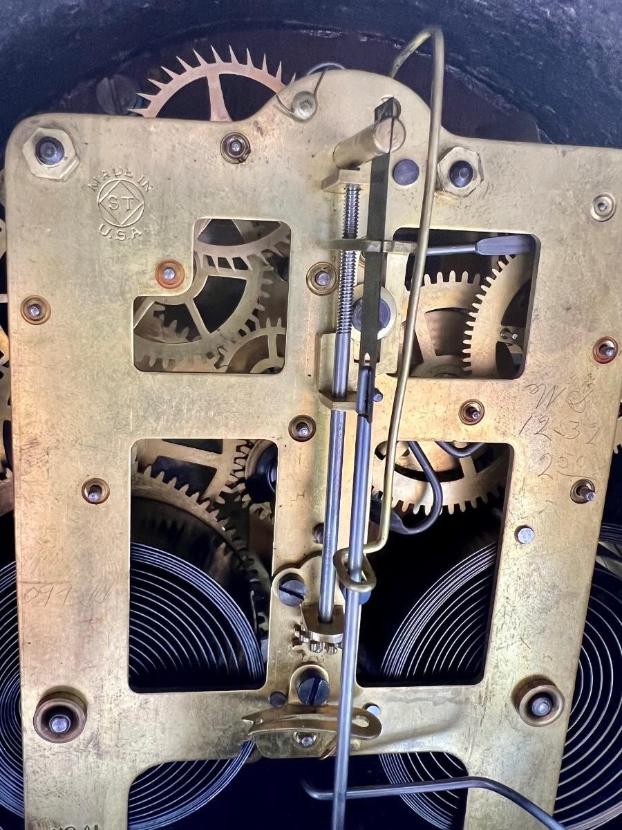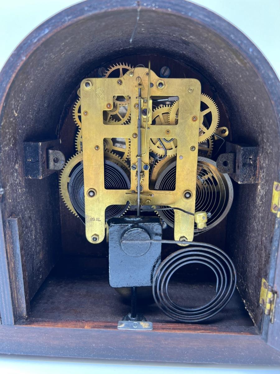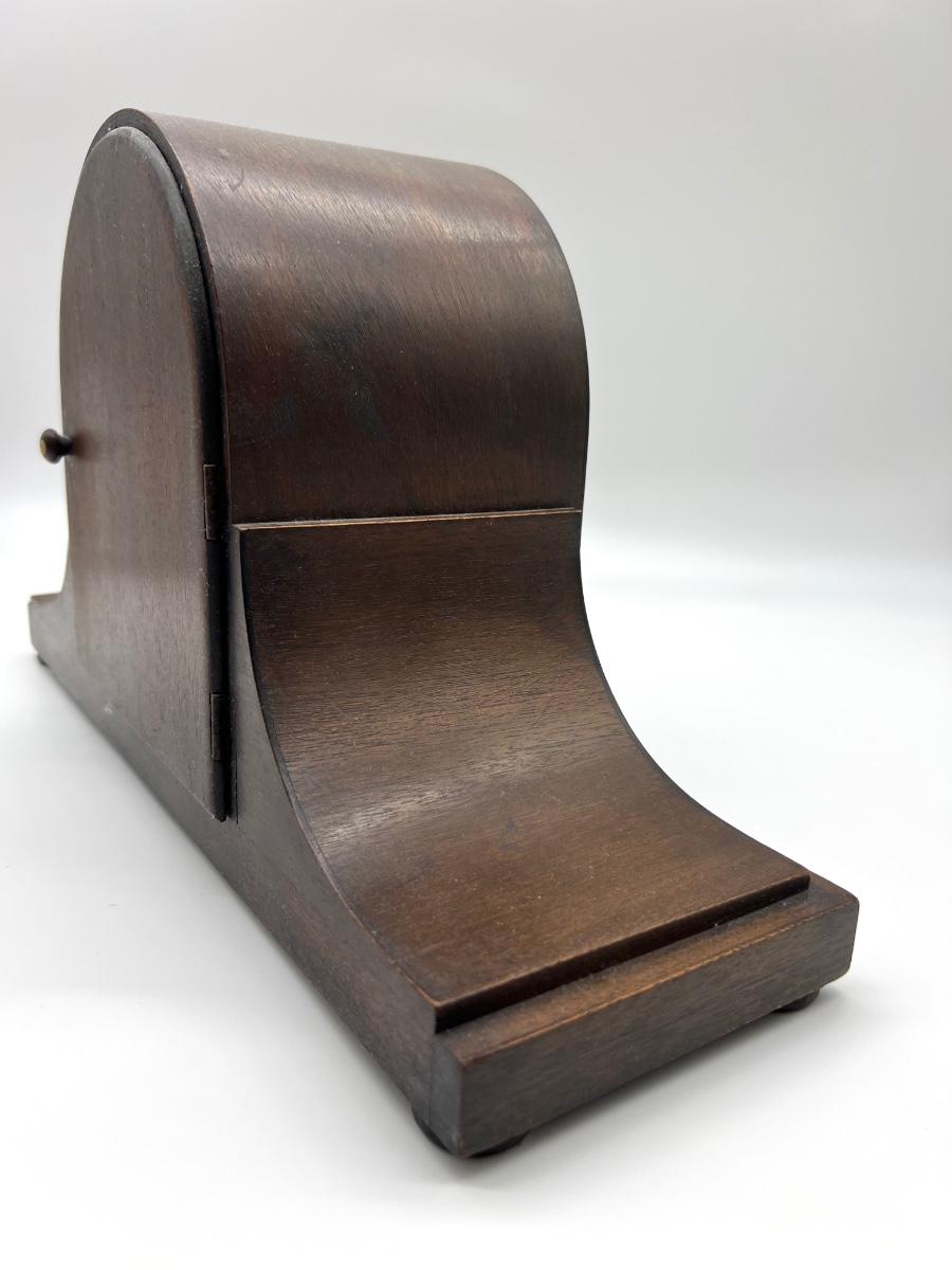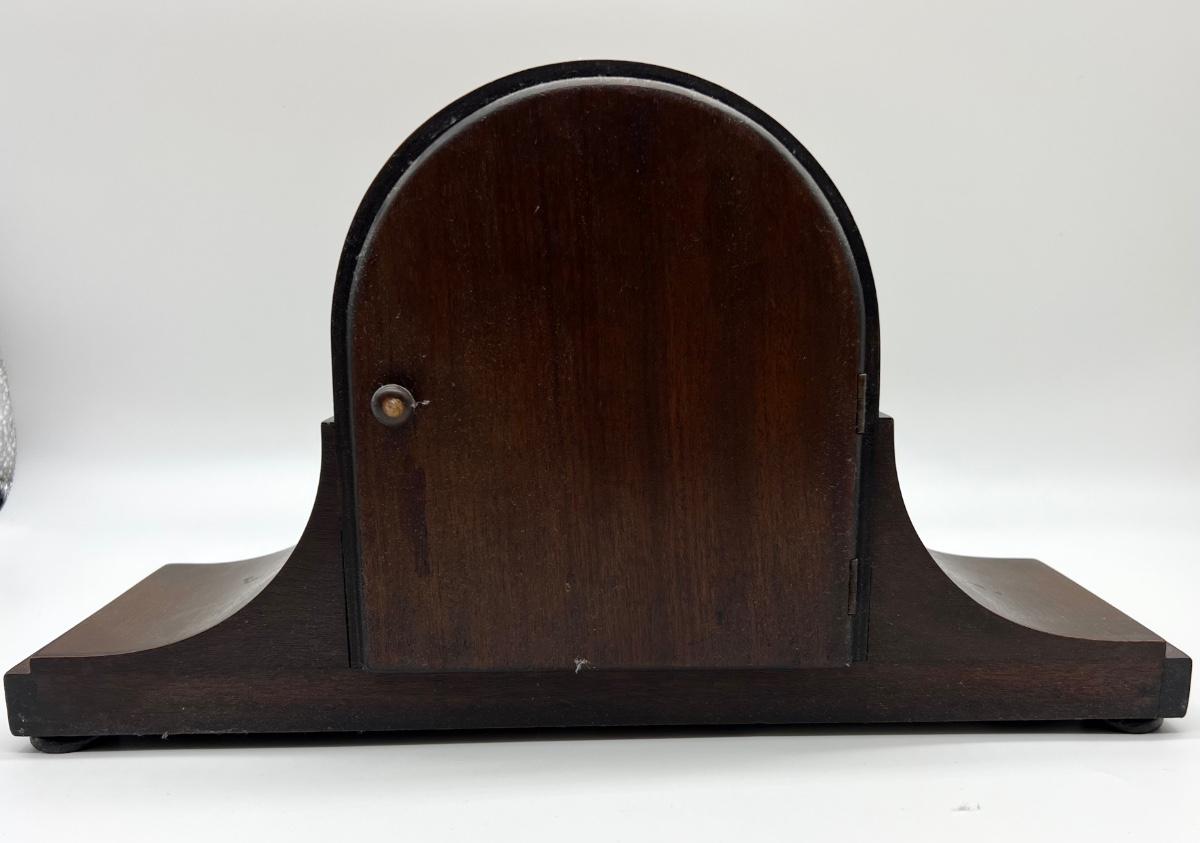 SETH THOMAS Tambour Mantle Clock Measures 9 inches tall, 16 1/2 inches wide and 6 inches deep. This clock was serviced last in 2018. Clock chimes loudly but may need to be serviced. Two keys are included. See pictures as numbers 4,5 and 8 show lots of wear from key use. Selling as is.
