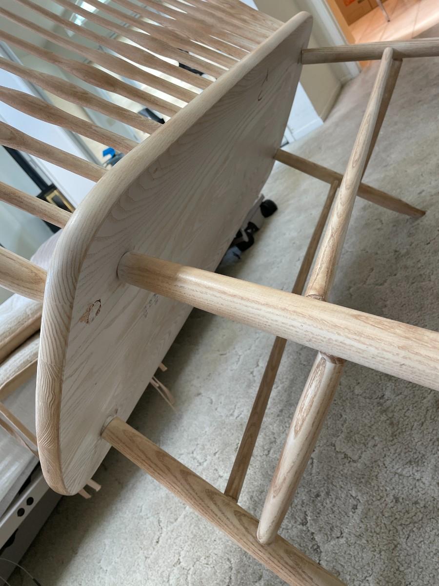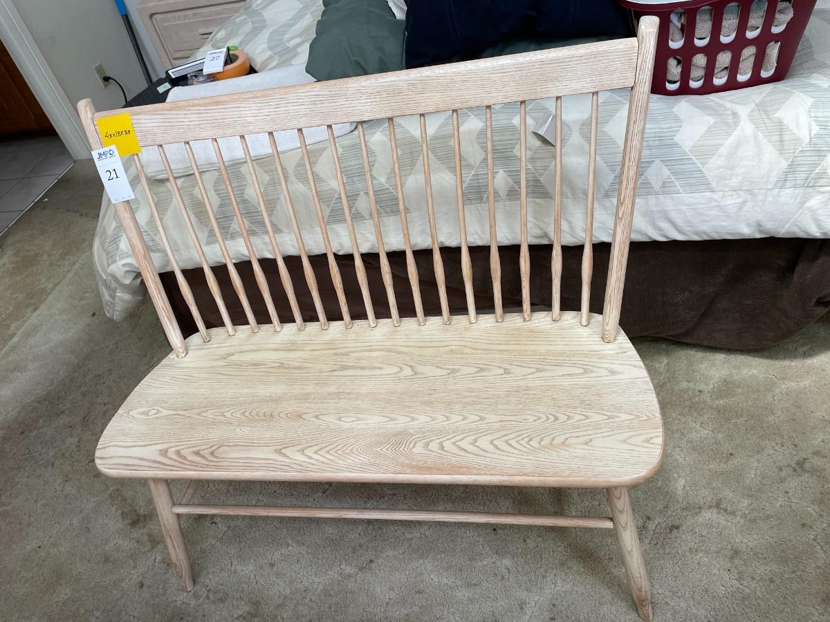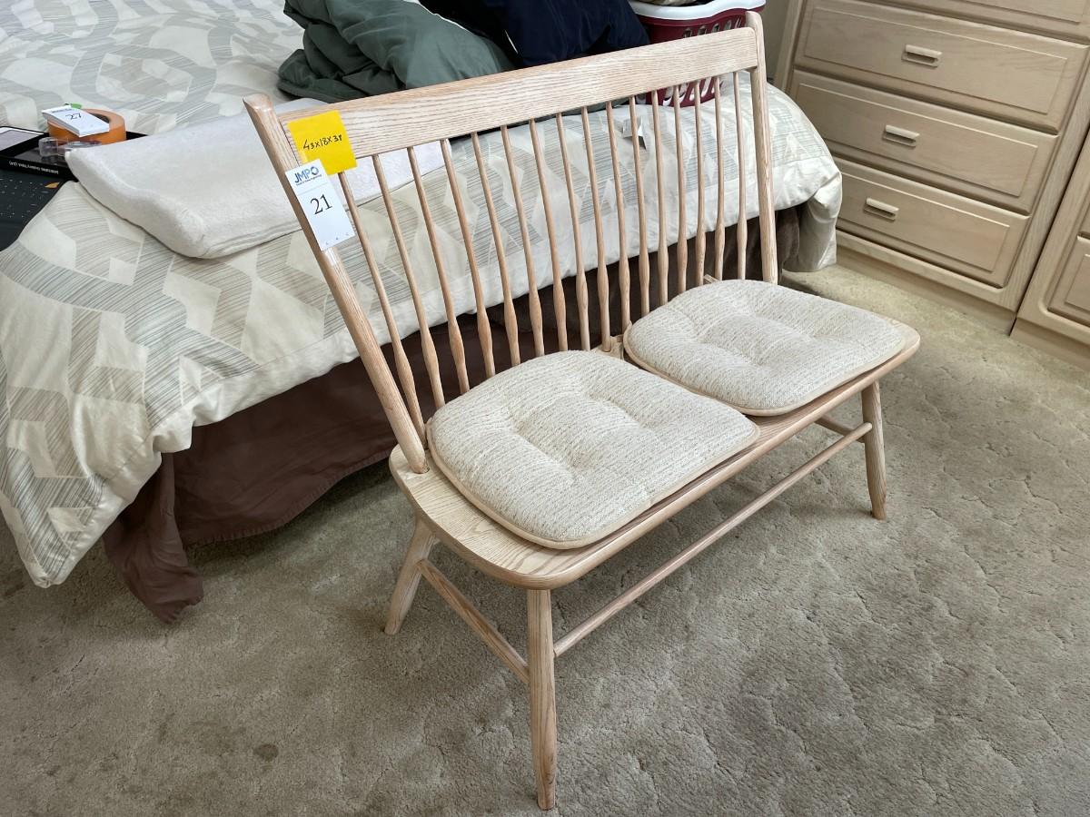 Light colored solid wood. Two-seater Windsor style bench/settee includes cushions