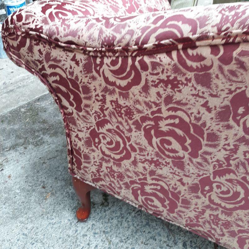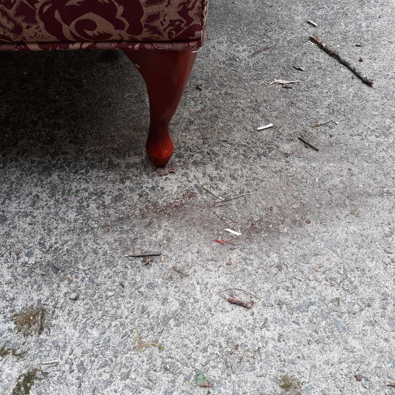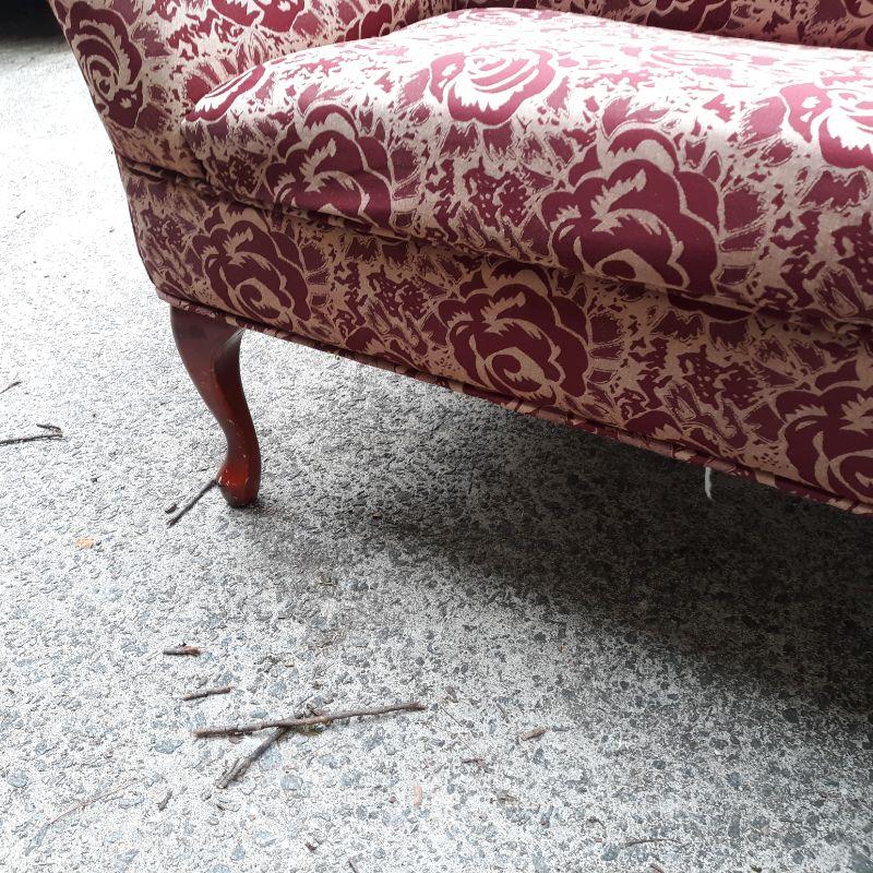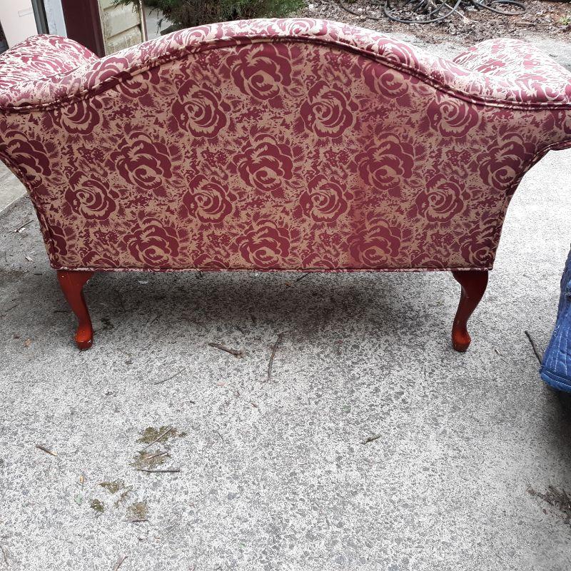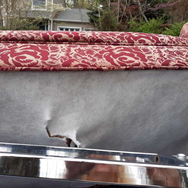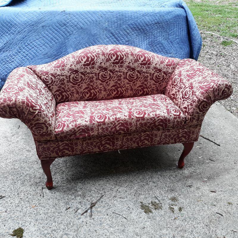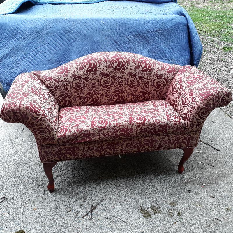 Settee Bench. The legs have a few scuffs and need to be screwed in tighter. A tear in the bottom of the protective covering, underneath. Look at the pictures.