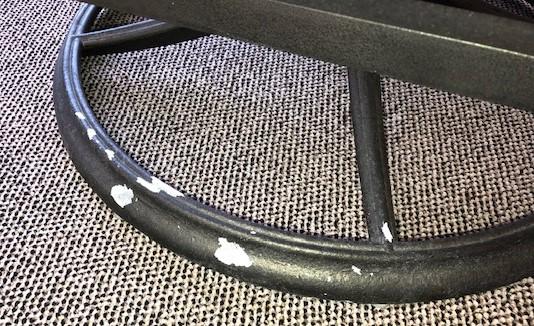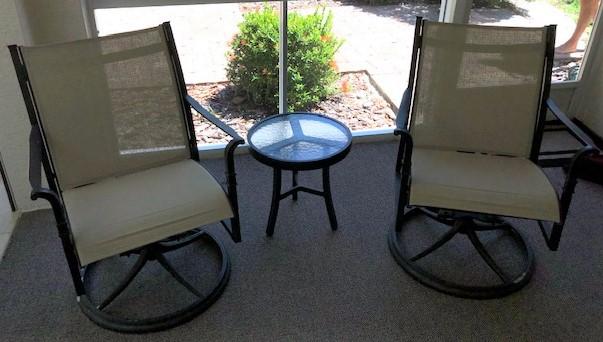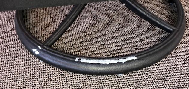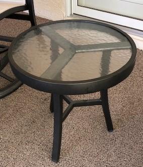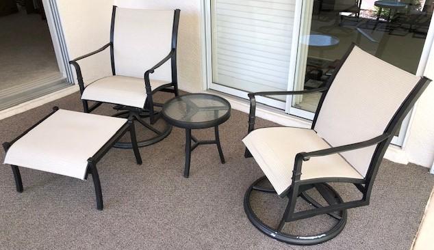The only condition issue(s) to this set is some paint loss on the bases of this furniture. This is a seven piece set (4 chairs), (two side tables, & (one ottoman. All of the cloth areas are in excellent and intact condition.