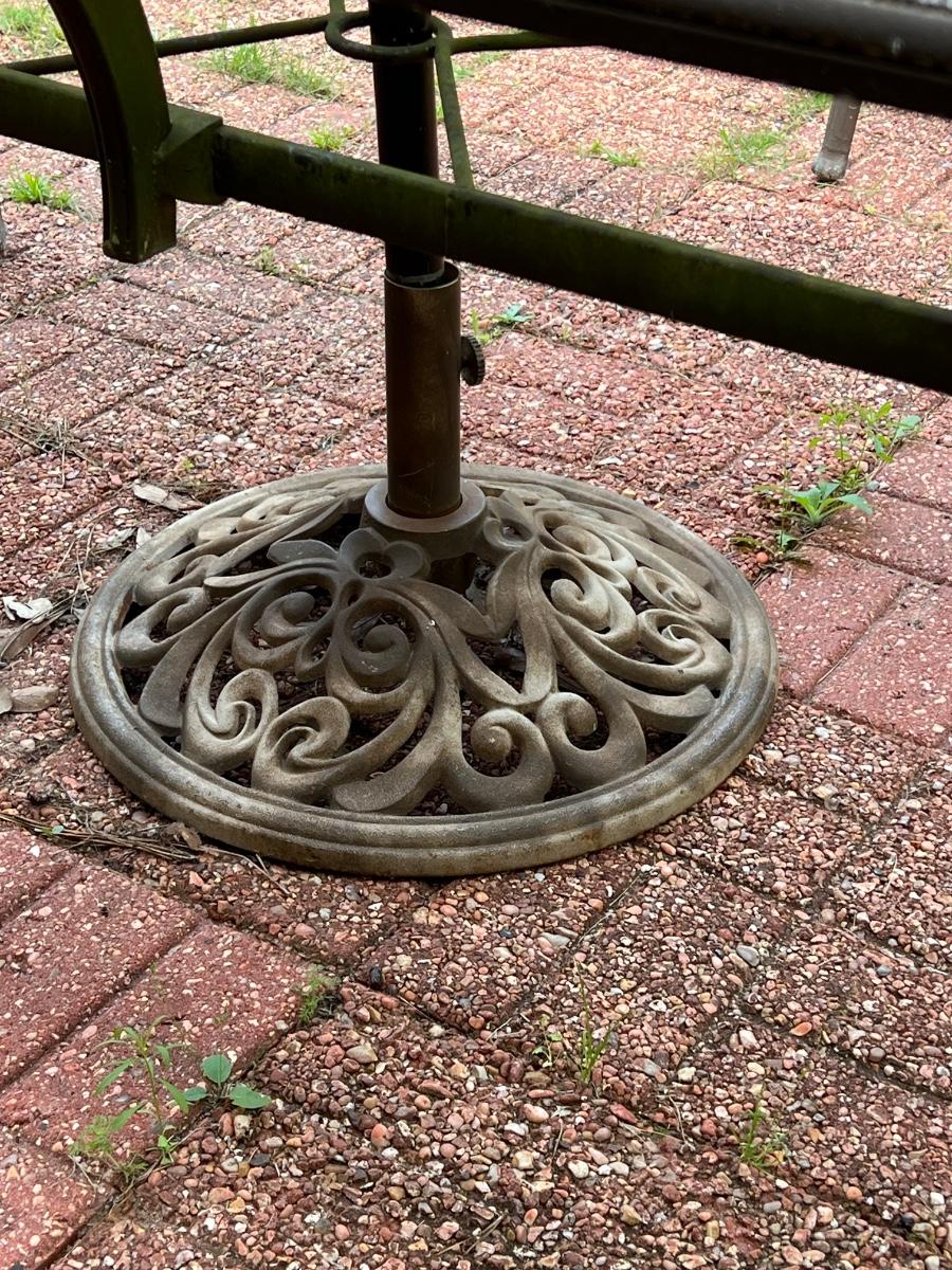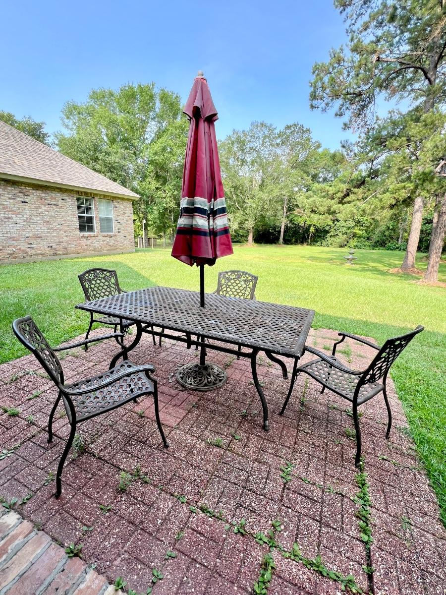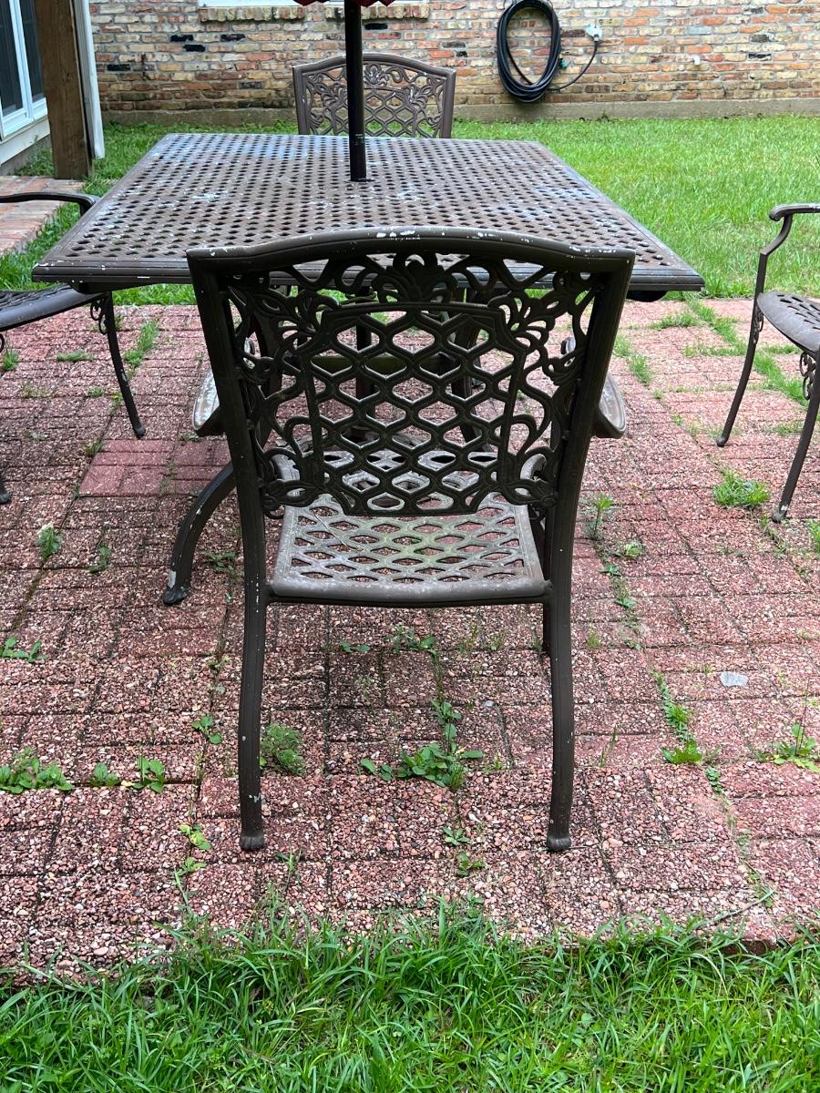 Set includes: table, 4 chairs, umbrella, & stand ~ Possibly needs paint job and/or sandblasting ~ Has minor surface rust on umbrella / stand ~ Table = 28.5” H x 75” W x 45” D