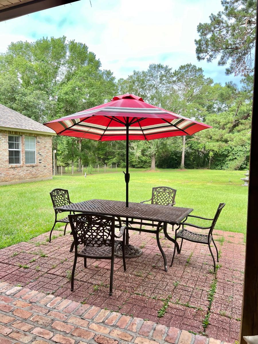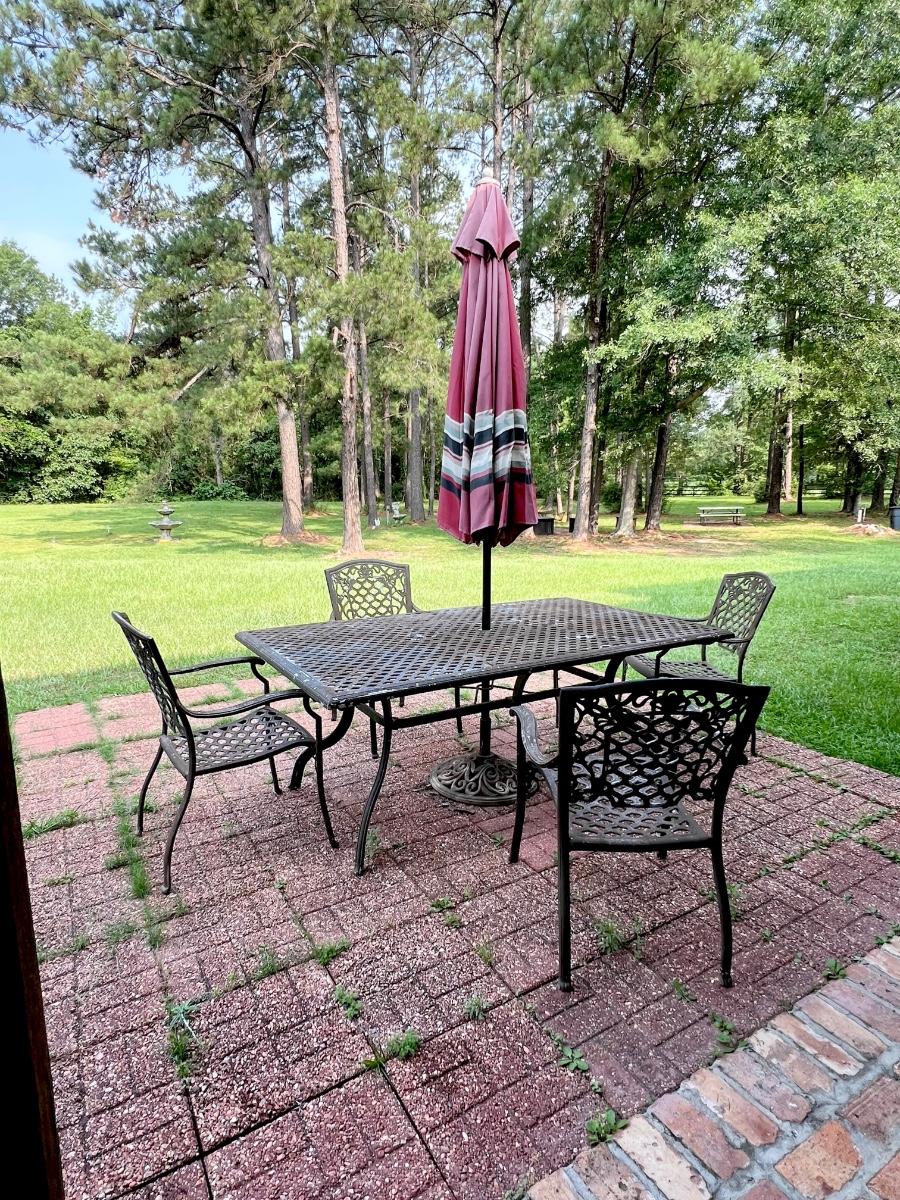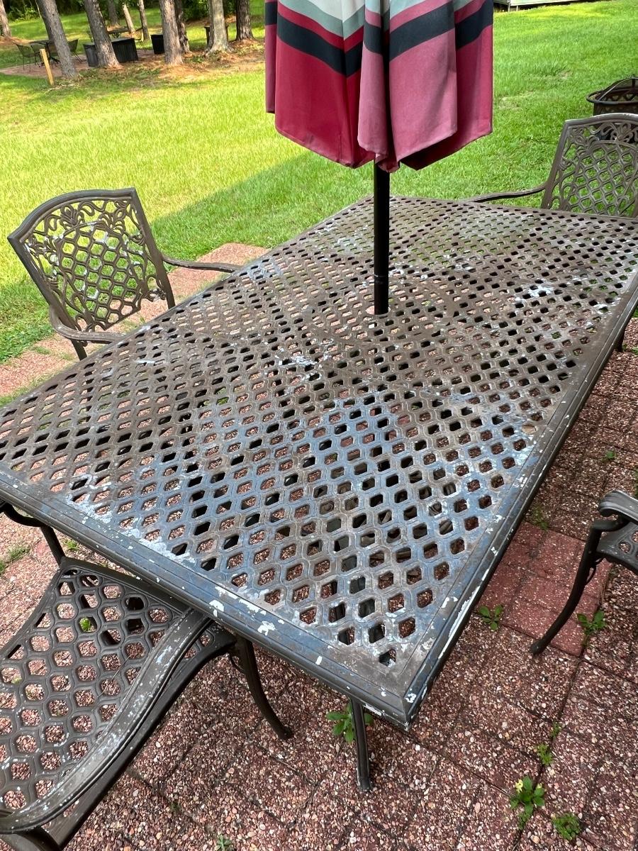Set includes: table, 4 chairs, umbrella, & stand ~ Possibly needs paint job and/or sandblasting ~ Has minor surface rust on umbrella / stand ~ Table = 28.5” H x 75” W x 45” D