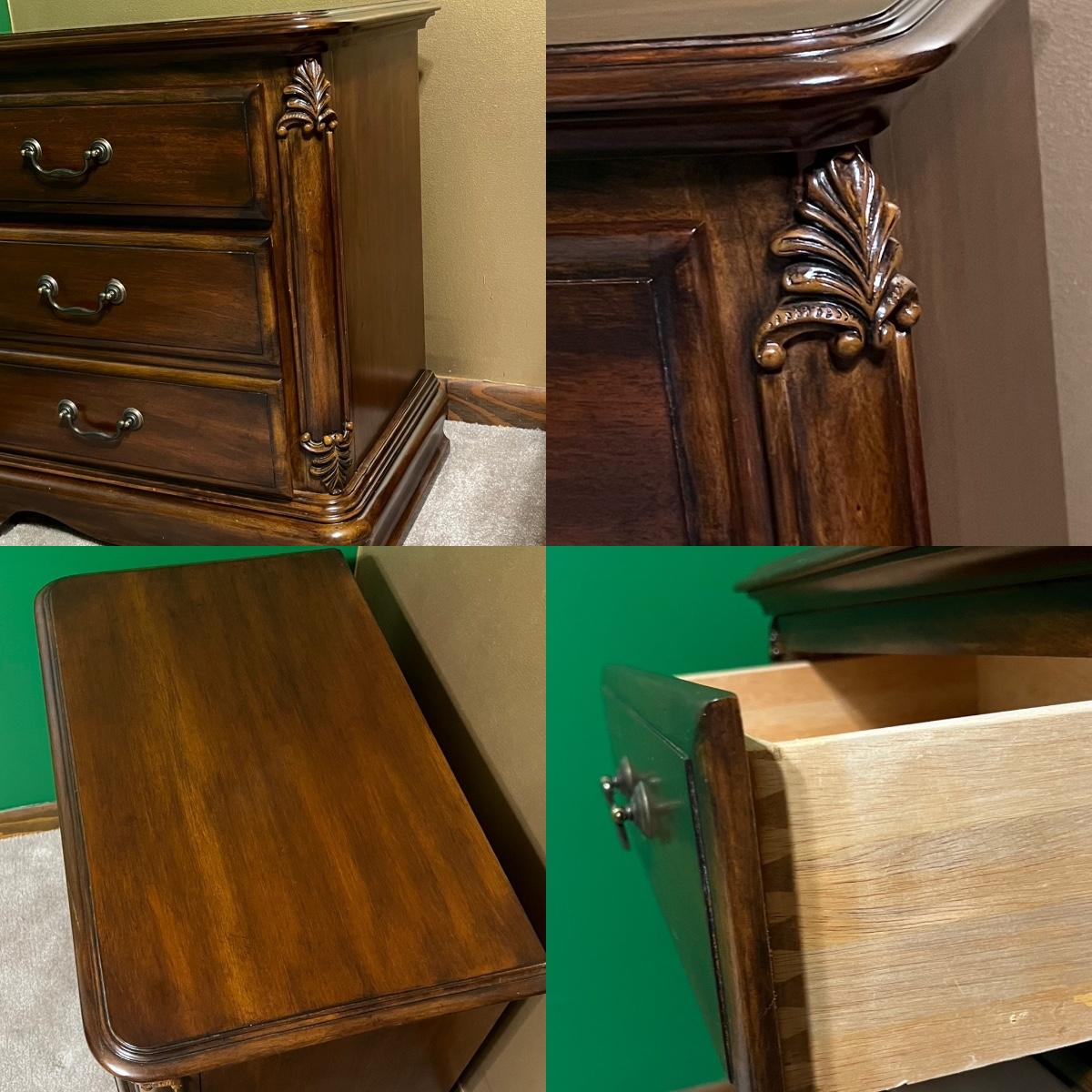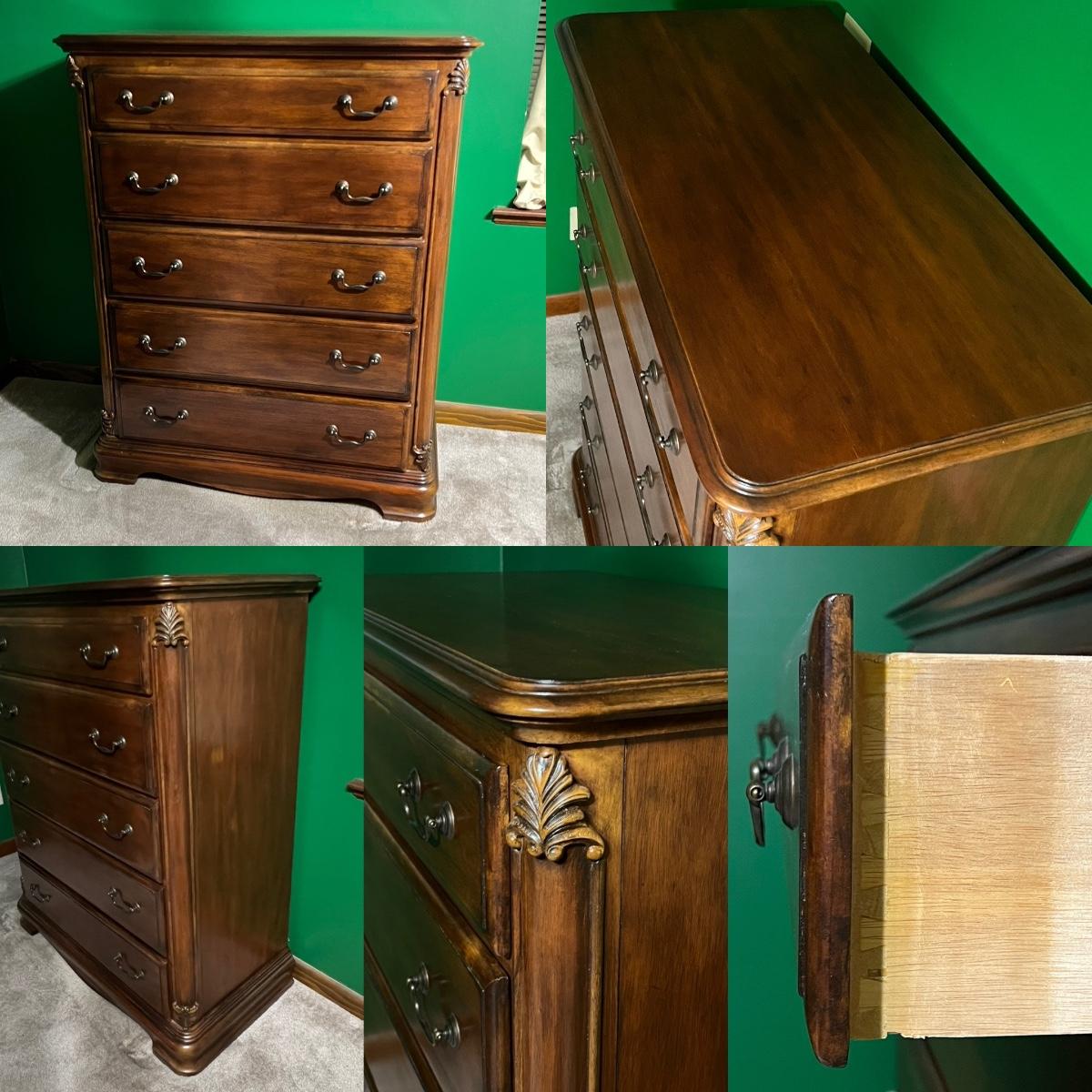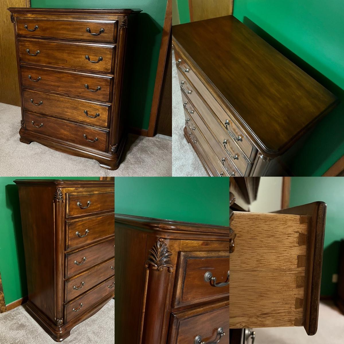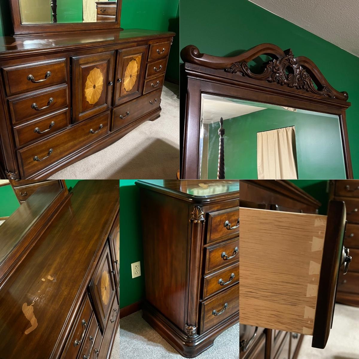 Suite includes: 1 Queen bed ~ 1 mirrored dresser ~ 2 chest of drawers ~ 2 night stands ~ 1 blanket chest. The bed and also be for a full. No brand name found. Headboard = 84” H ~ Dresser = 37” H x 68” W x 20” D ~ Beveled Mirror = 48” H ~ both nightstands = 28.5” H x 28.5” W x 17.5” D ~ blanket chest = 22.5” H x 36” W x 23” D ~ Both chest of drawers = 50.5” H x 40” W x 20” D. Dresser does have minor damage on the top, see photos.
