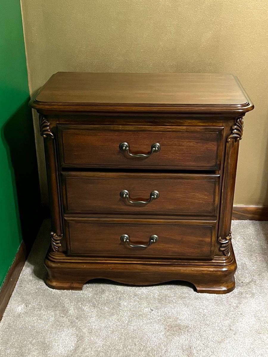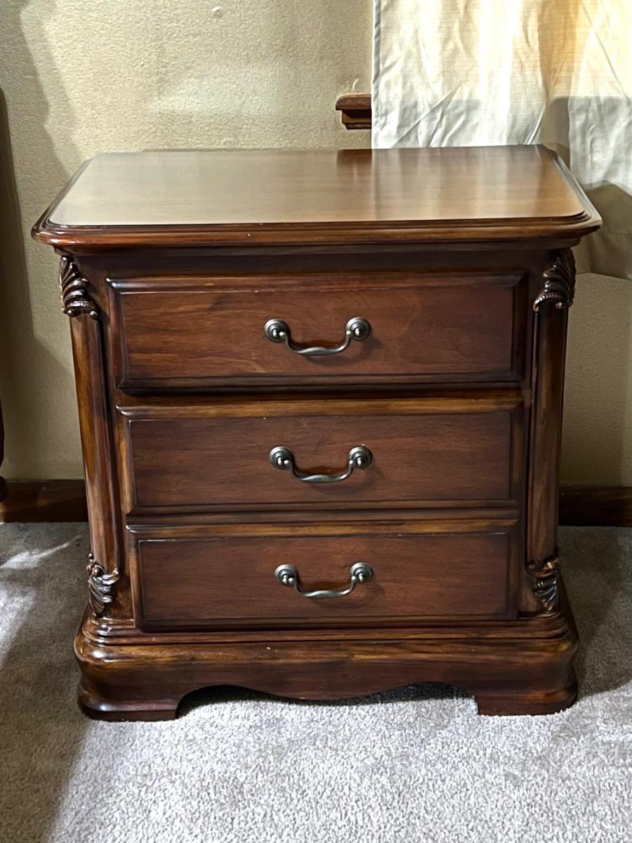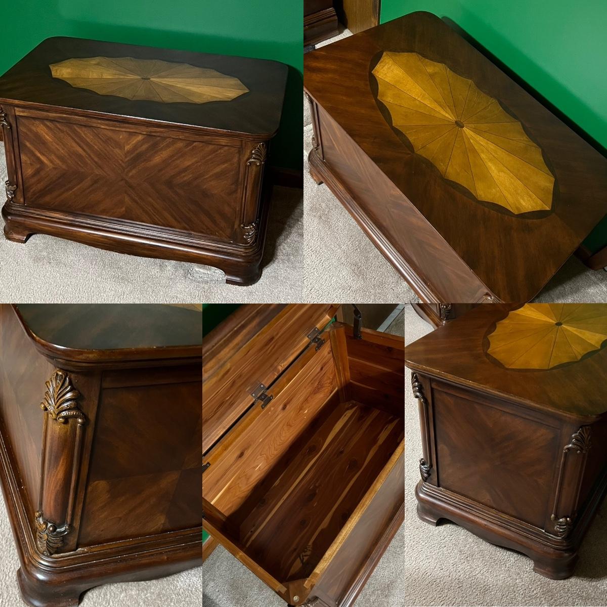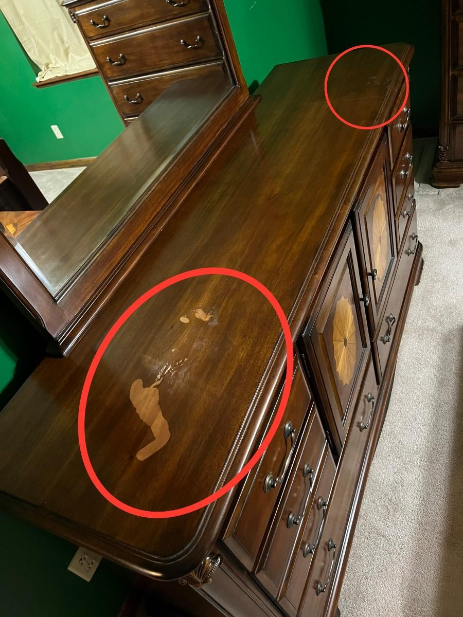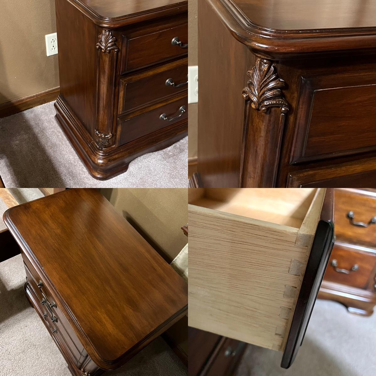 Suite includes: 1 Queen bed ~ 1 mirrored dresser ~ 2 chest of drawers ~ 2 night stands ~ 1 blanket chest. The bed and also be for a full. No brand name found. Headboard = 84” H ~ Dresser = 37” H x 68” W x 20” D ~ Beveled Mirror = 48” H ~ both nightstands = 28.5” H x 28.5” W x 17.5” D ~ blanket chest = 22.5” H x 36” W x 23” D ~ Both chest of drawers = 50.5” H x 40” W x 20” D. Dresser does have minor damage on the top, see photos.