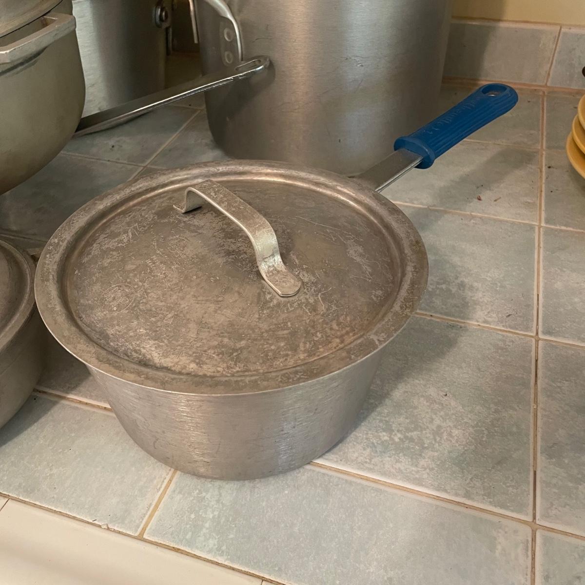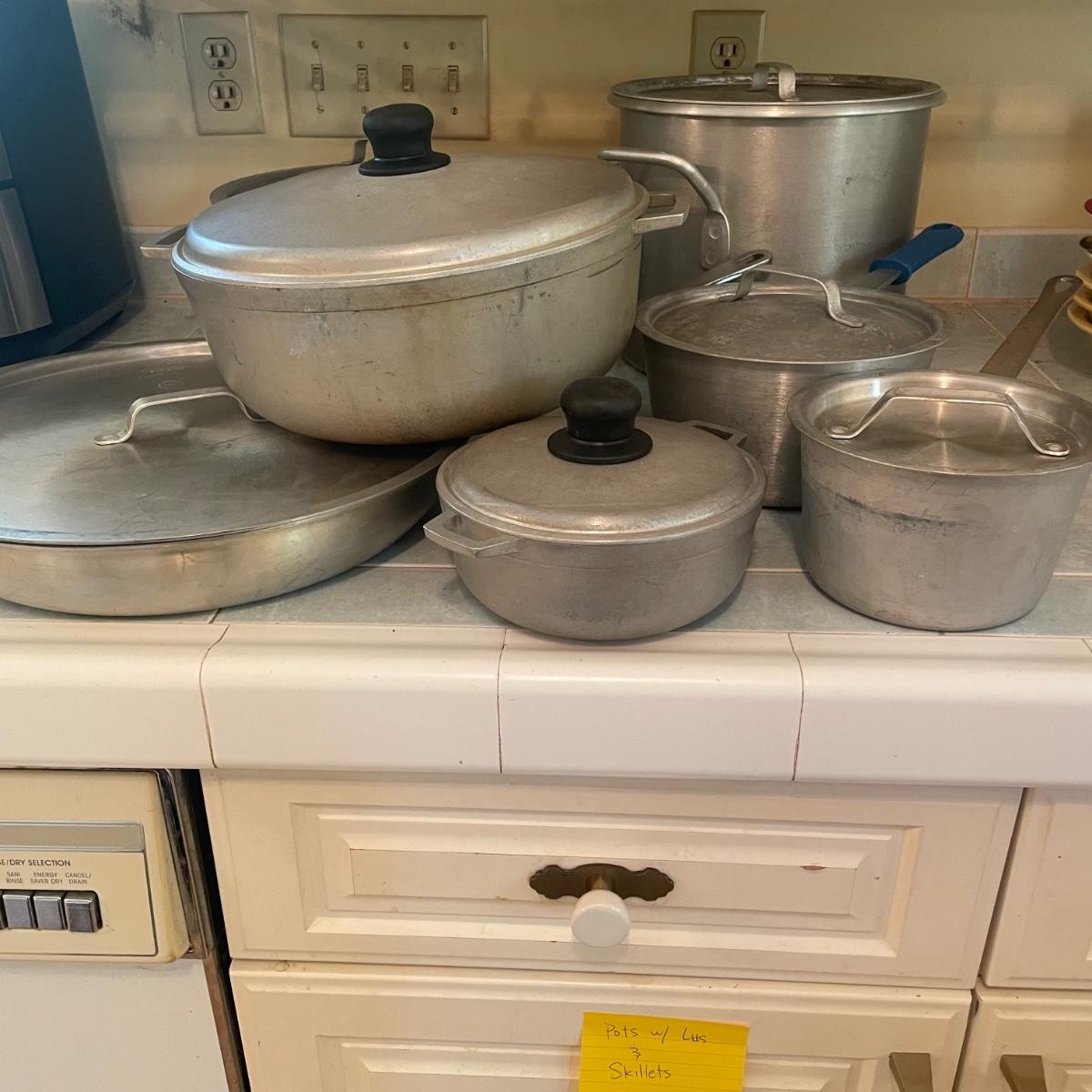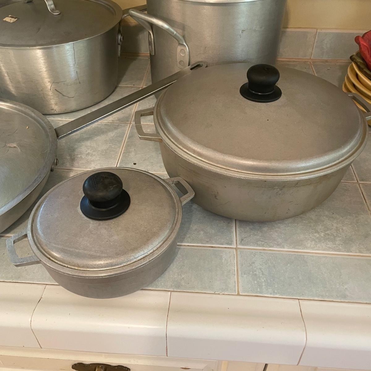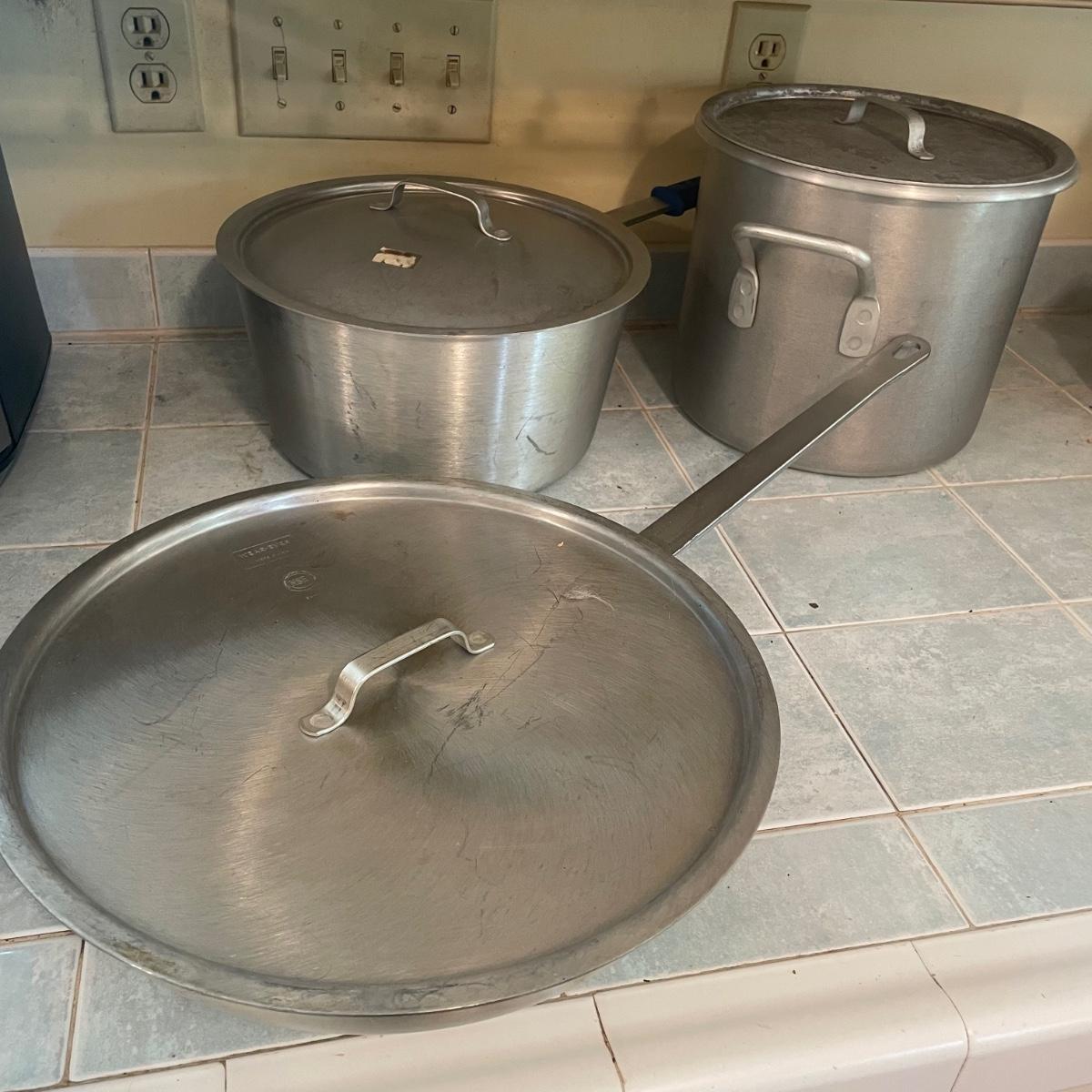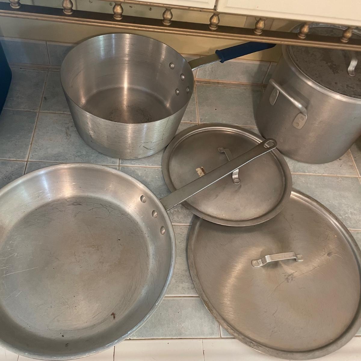 Great quality assortment of aluminum commercial style cooking pots and pans. All have lids. Brand names are Wear-Ever, NSF, IMUSA and WINCO. All pans are in good condition but all show typical wear and tear from use.