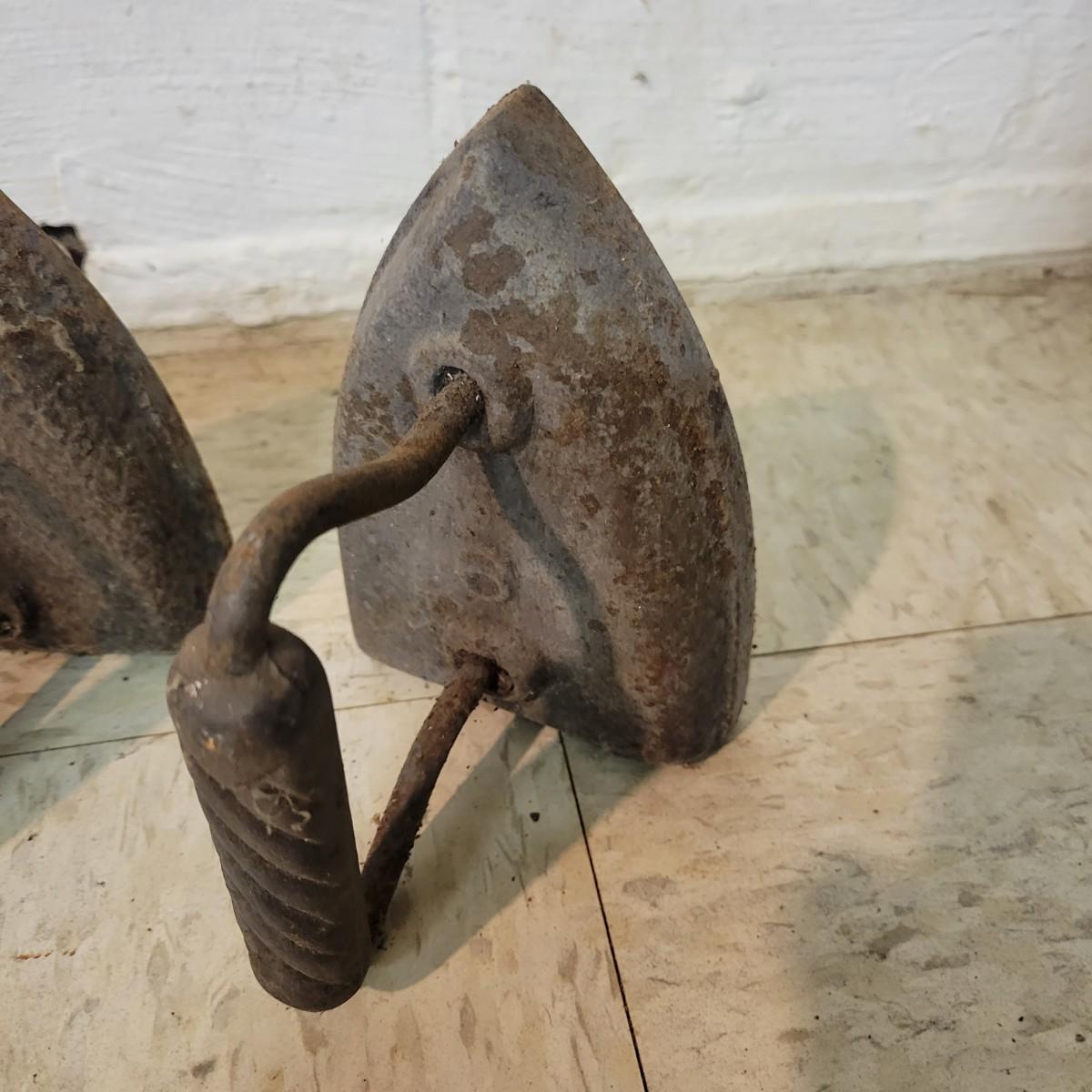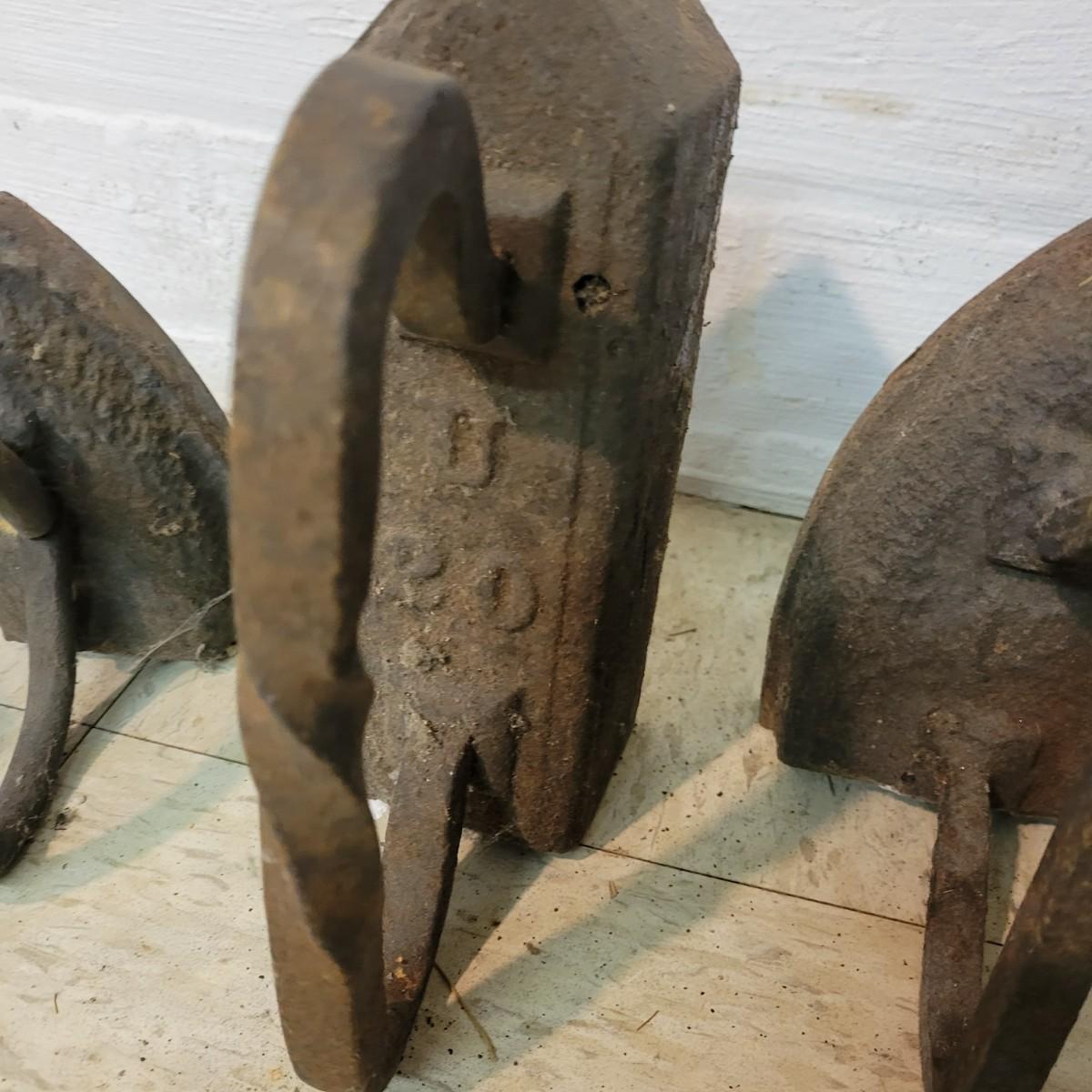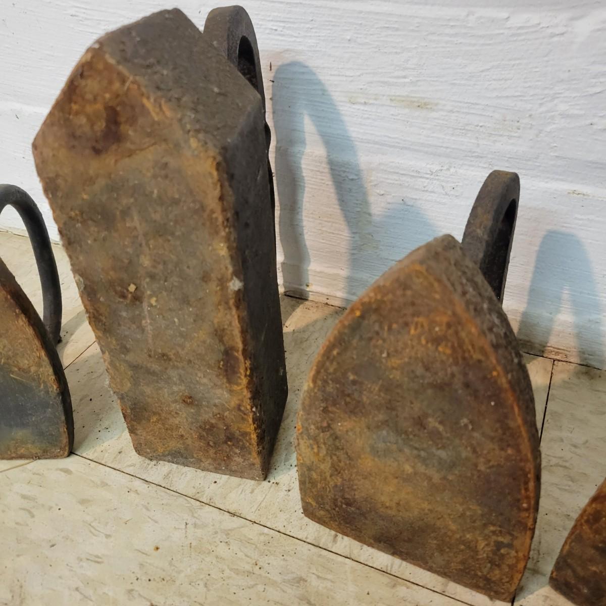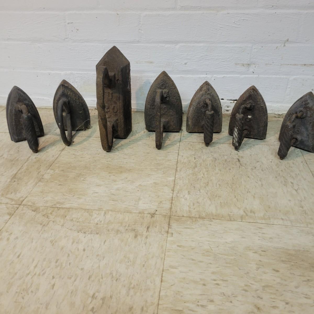 Seven cast iron irons in good condition structurally, with a coating of rust typical of iron pieces this age. A variety of sizes with the largest weighing approximately 20lbs and measures approximately 3" x 9.5" x 7". Local pickup only.
