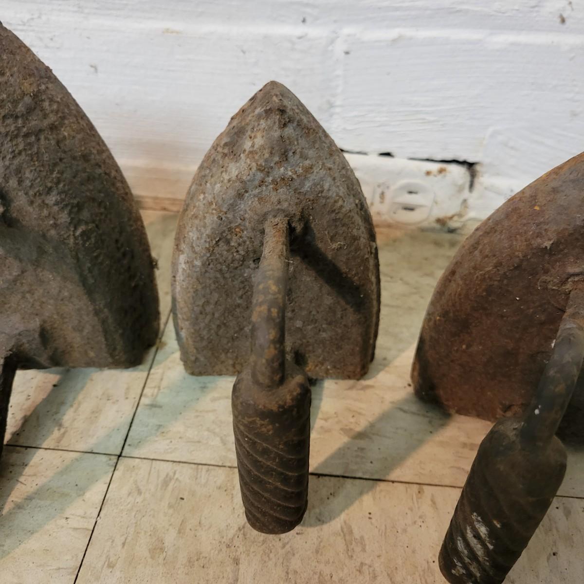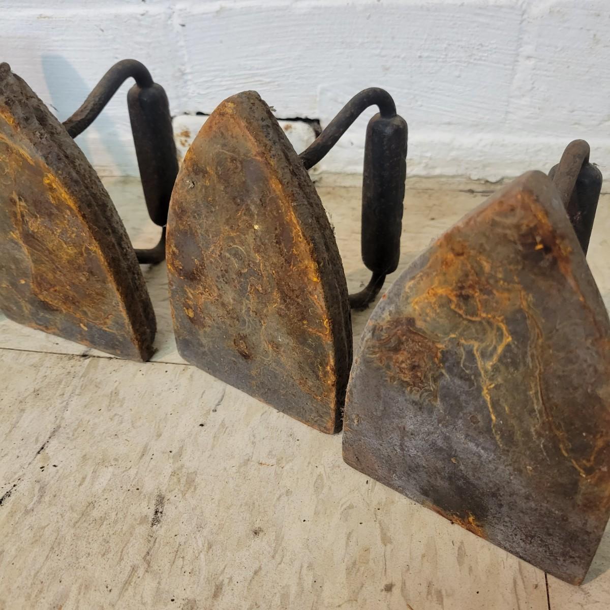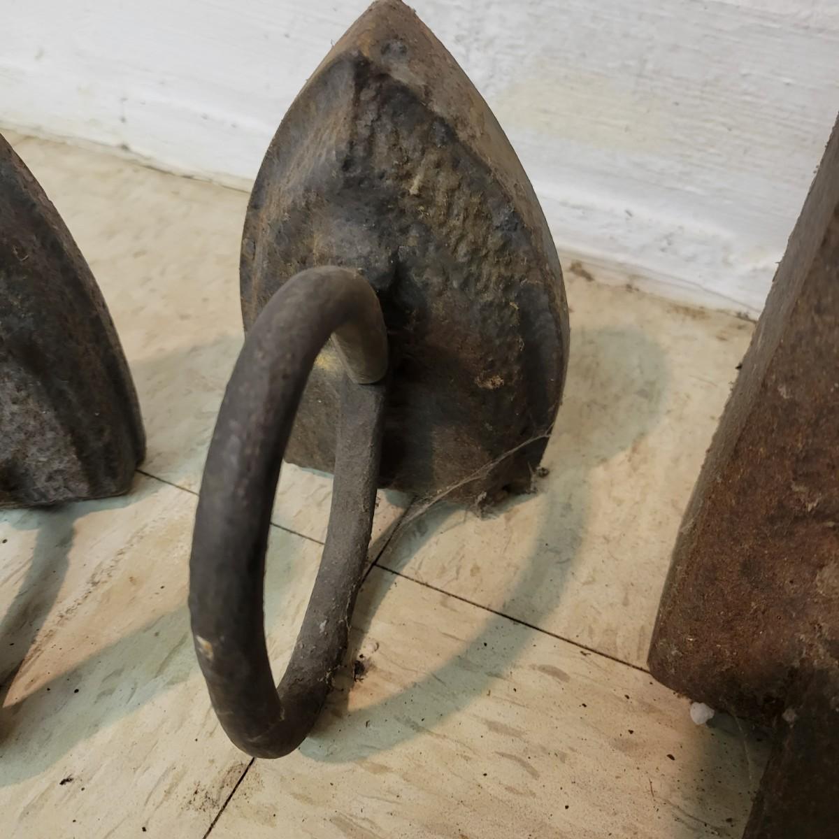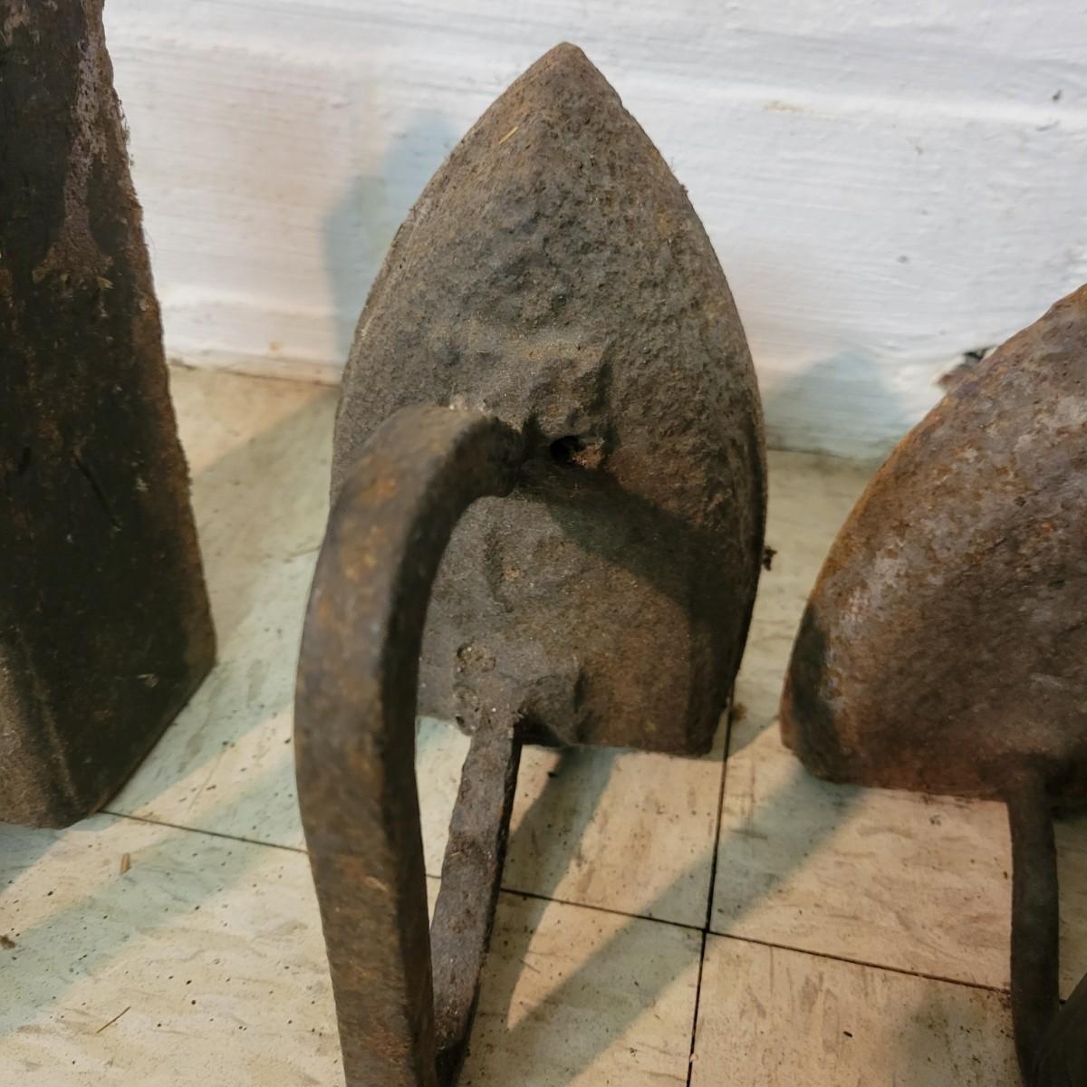 Seven cast iron irons in good condition structurally, with a coating of rust typical of iron pieces this age. A variety of sizes with the largest weighing approximately 20lbs and measures approximately 3" x 9.5" x 7". Local pickup only.