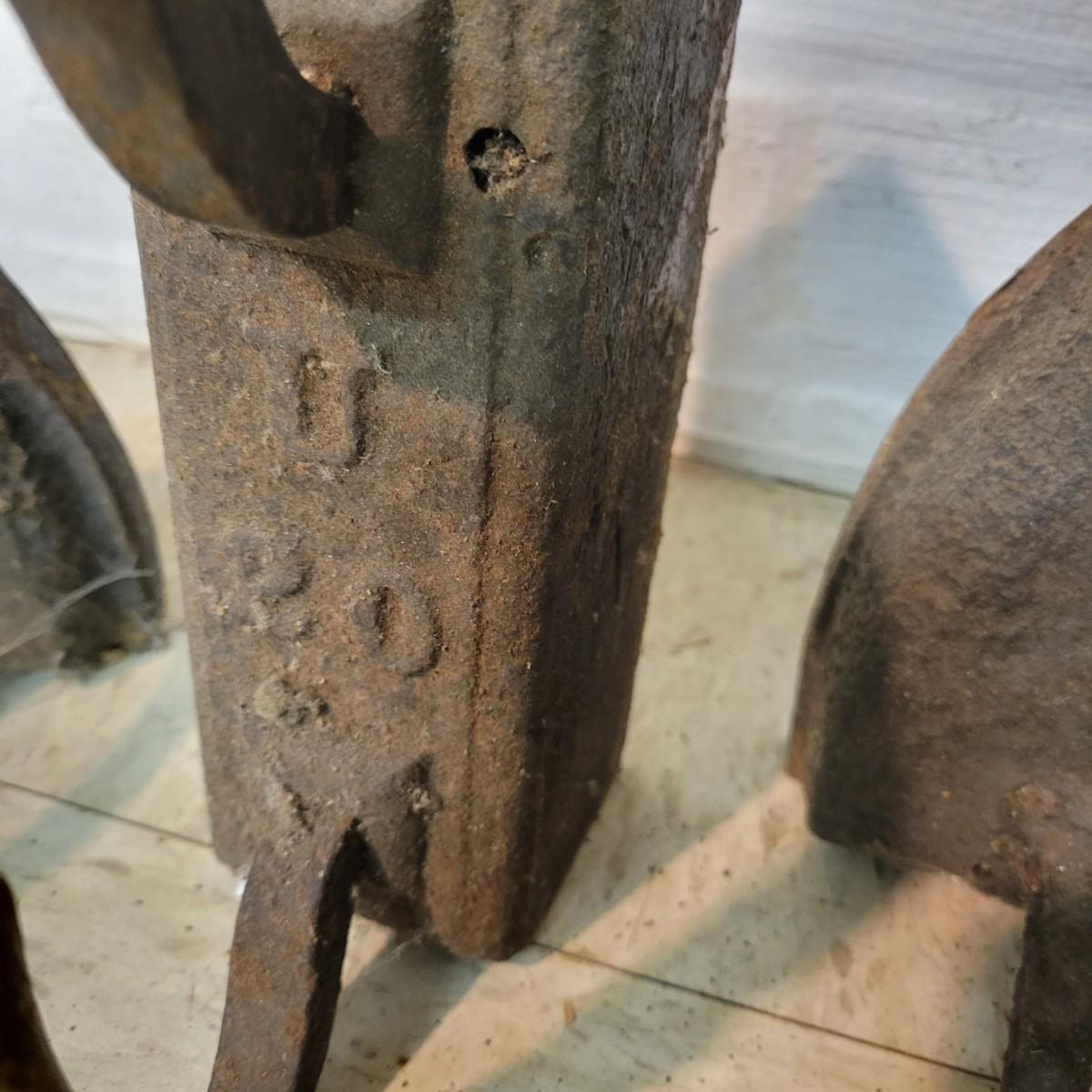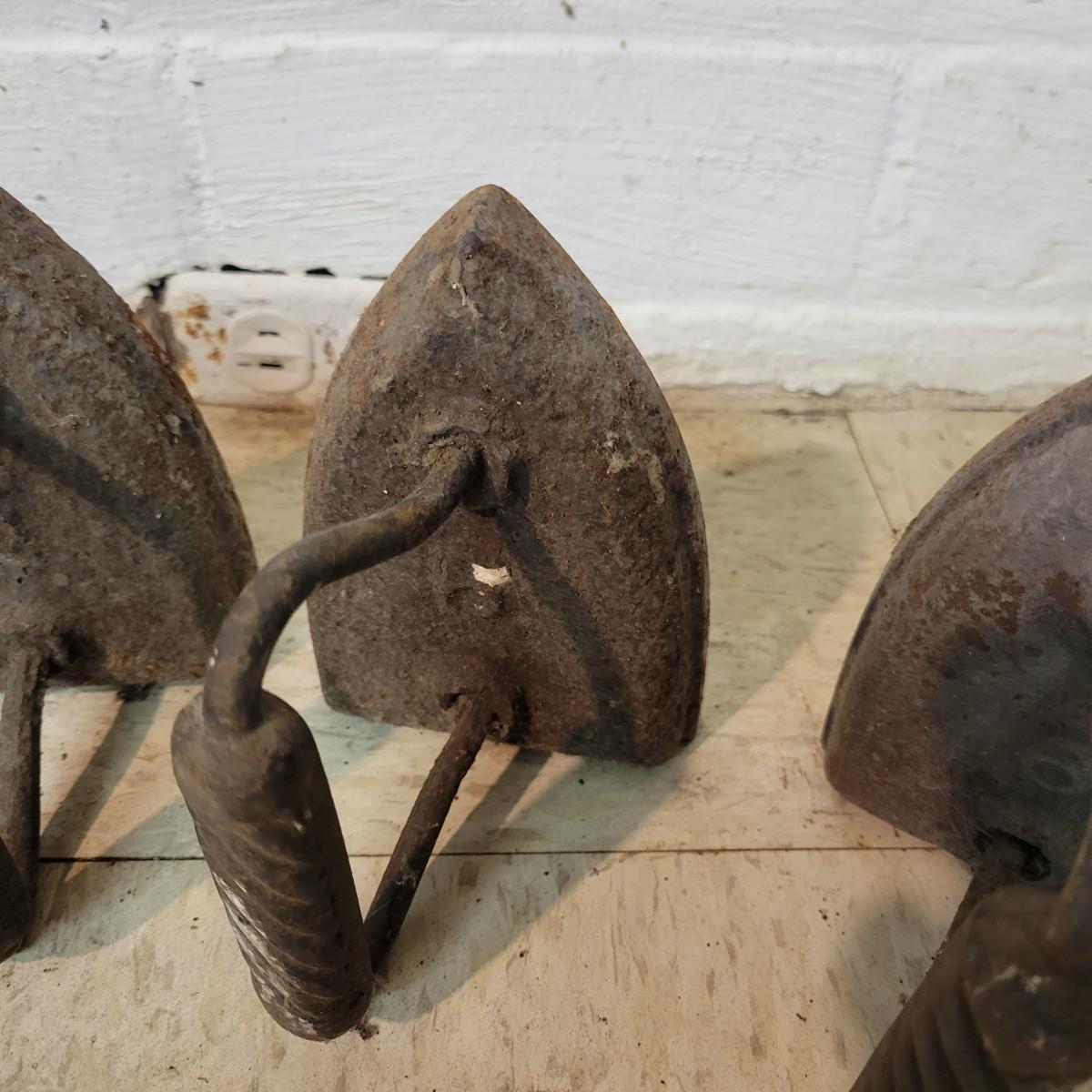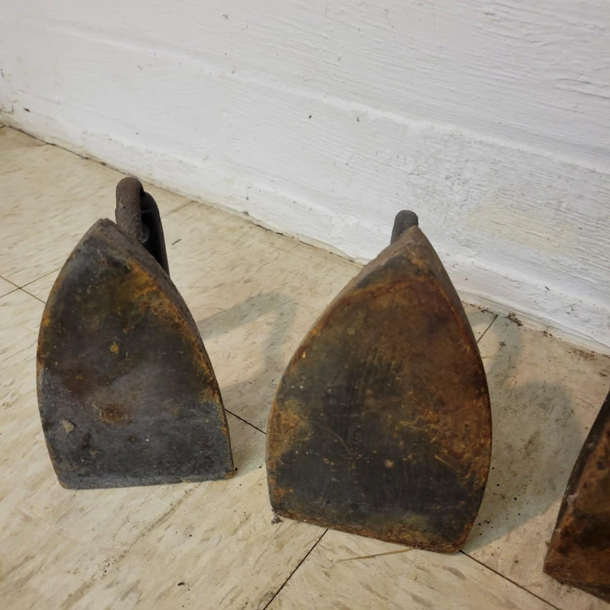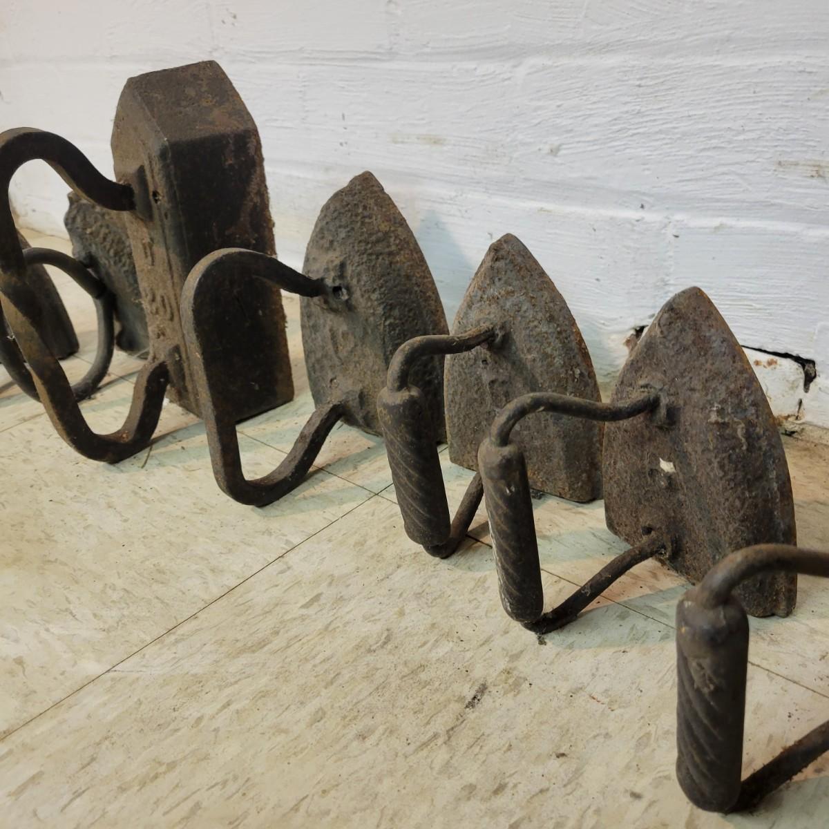 Seven cast iron irons in good condition structurally, with a coating of rust typical of iron pieces this age. A variety of sizes with the largest weighing approximately 20lbs and measures approximately 3" x 9.5" x 7". Local pickup only.
