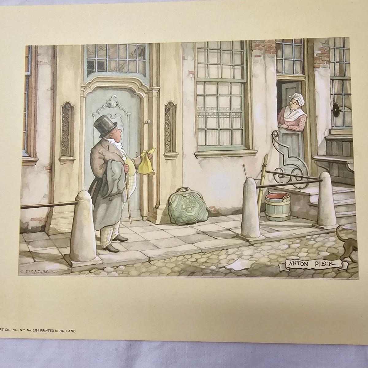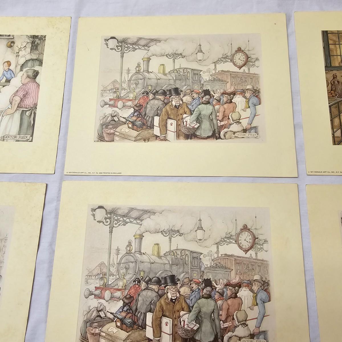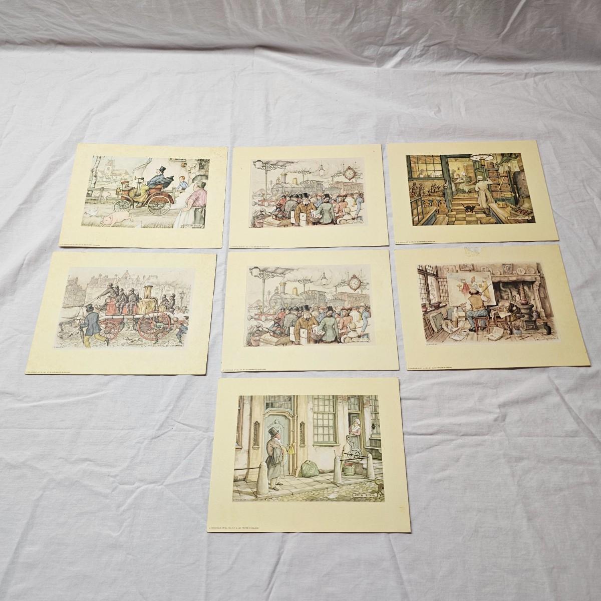 Seven colorful small prints of life appearing to be in Holland. Prints show day to day activities and more each piece measures 9"W x 7"H. There is some discoloration on sides and edges. See photos for details. Shipping available.