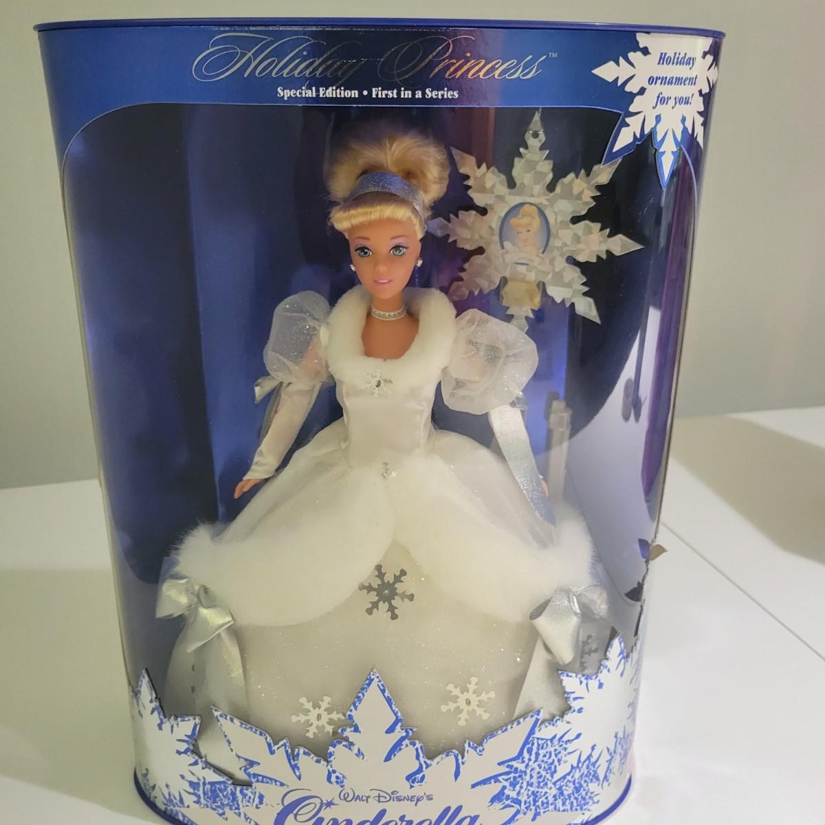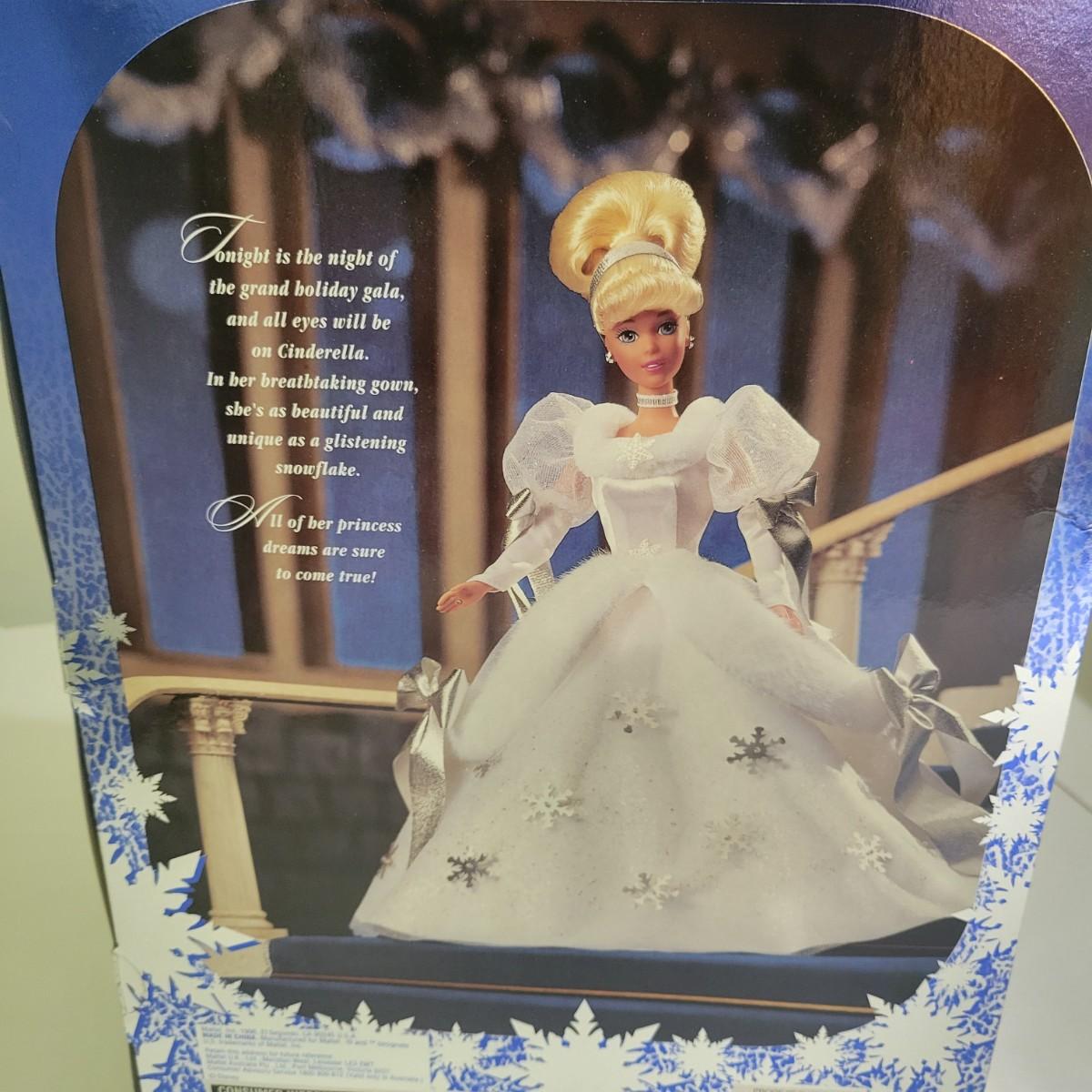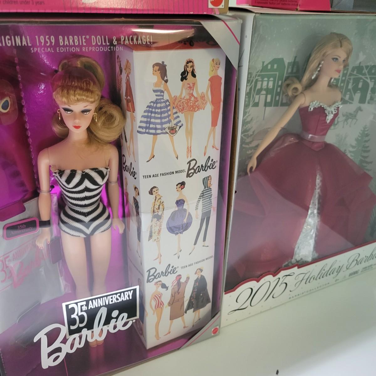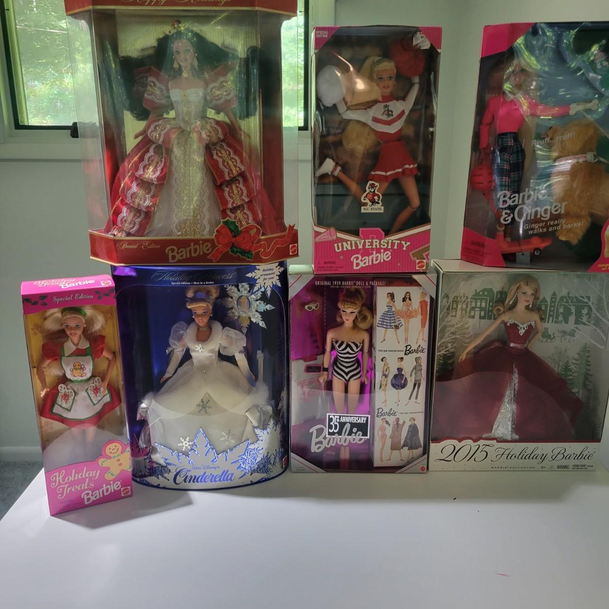 A collection of seven collectable Barbies that are in excellent condition with no damage. Boxes are also in excellent condition with no damage. Lot includes three holiday Barbies, a Cinderella Barbie, University Barbie, Barbie and Ginger and 35th anniversary Barbie. Largest box measures approximately 12" x 4" x 14" Shipping available