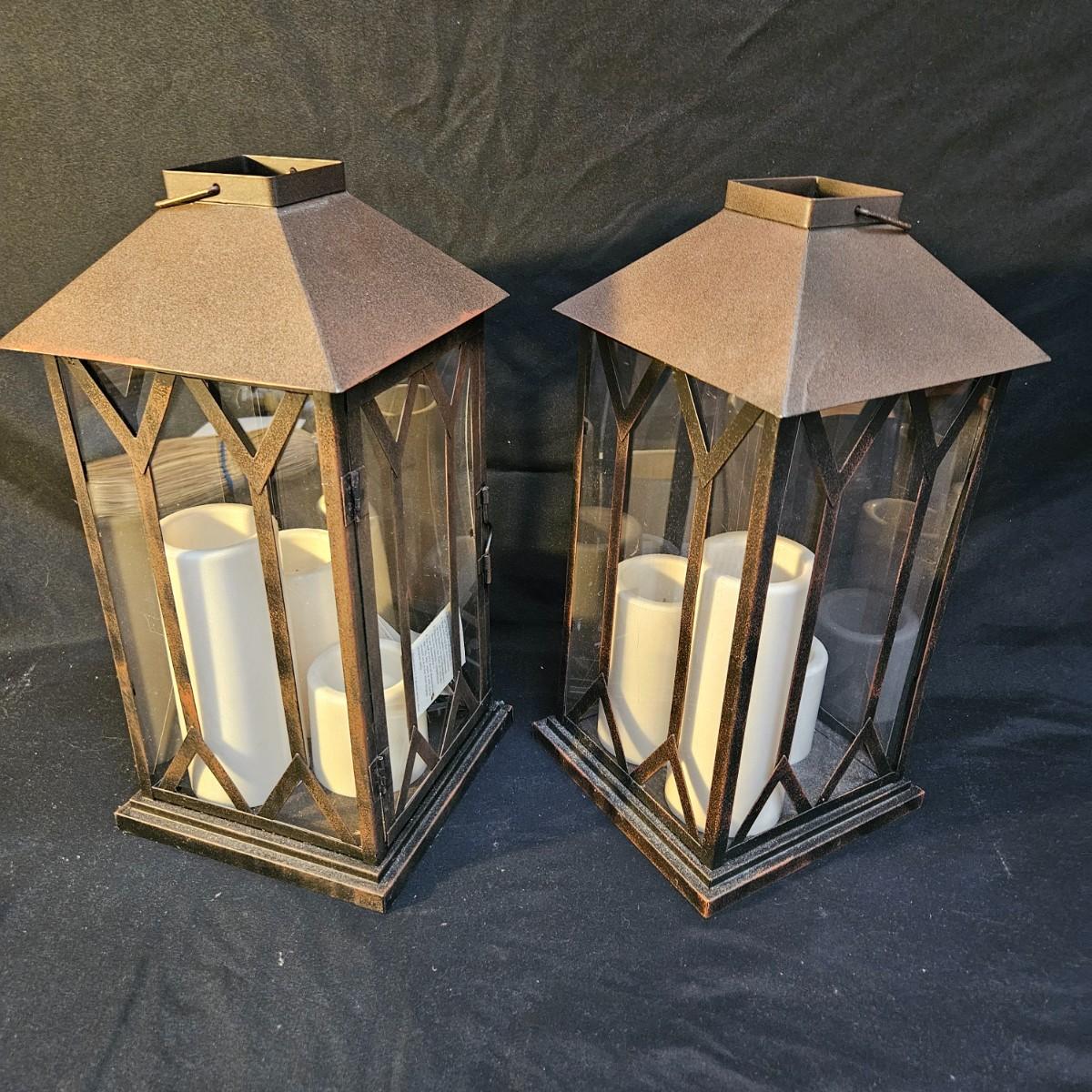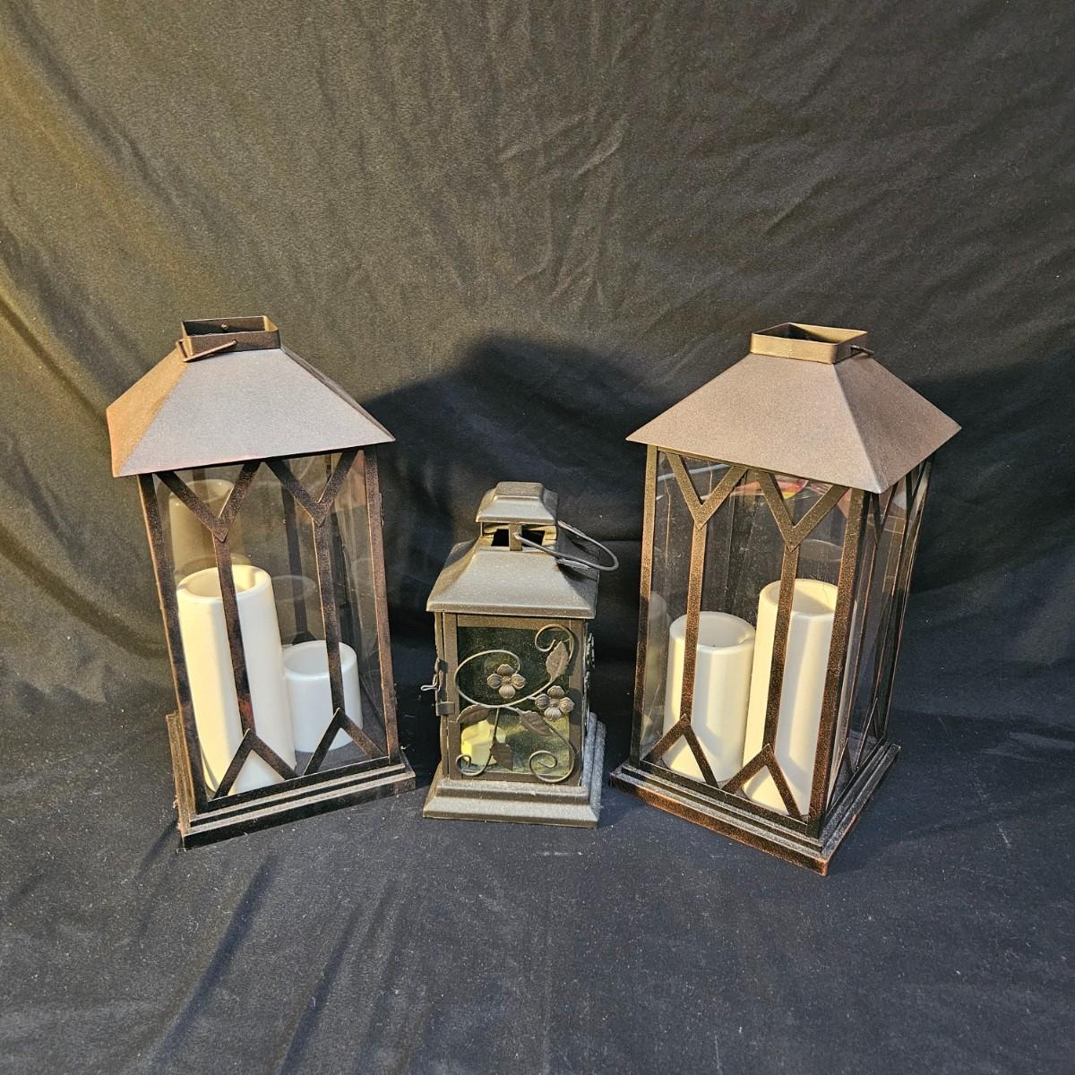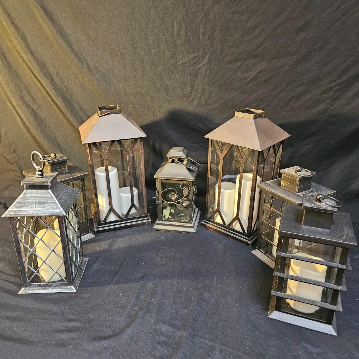 An assortment of seven battery powered lanterns that are a mix of metal and plastic frames. All lamps but the two largest ones were powered on. Four of the smaller lanterns have plastic frames and the two larger lanterns and the small one with the flowers have metal frames. The two larger lanterns measure approximately 7.5" x 7.5" x 15.5"H. Shipping available