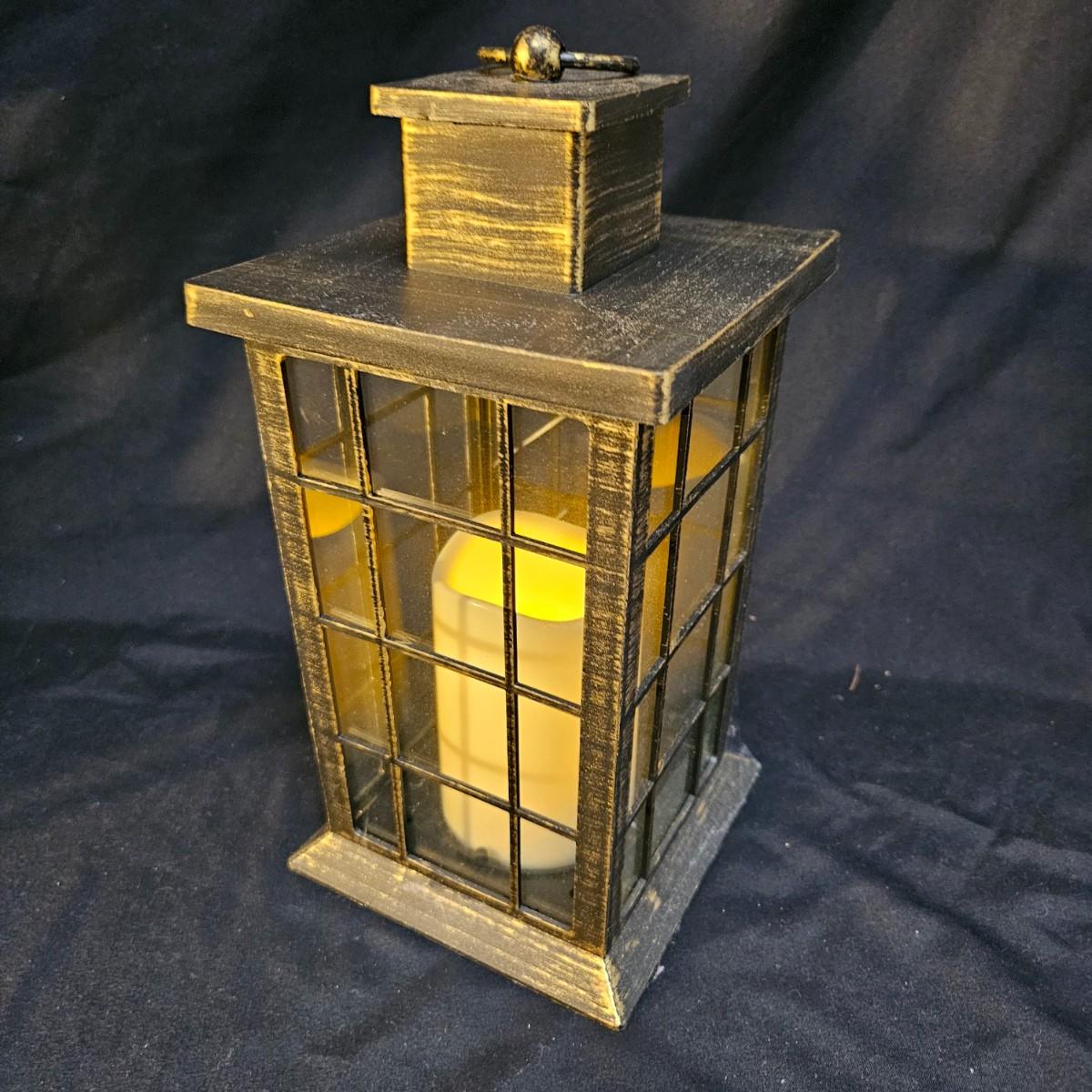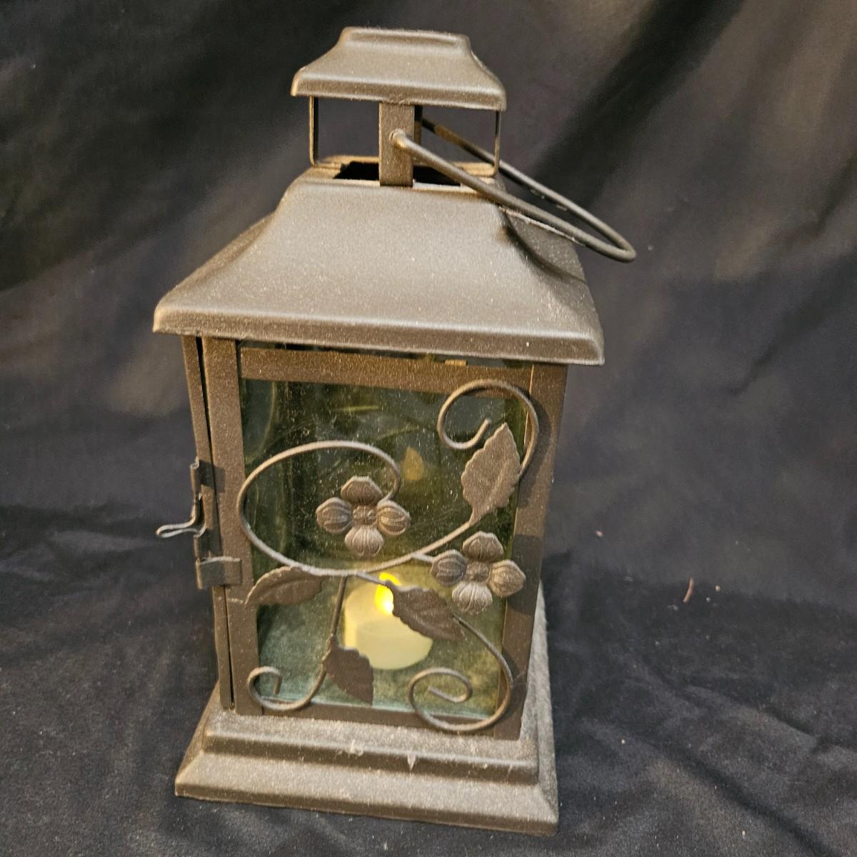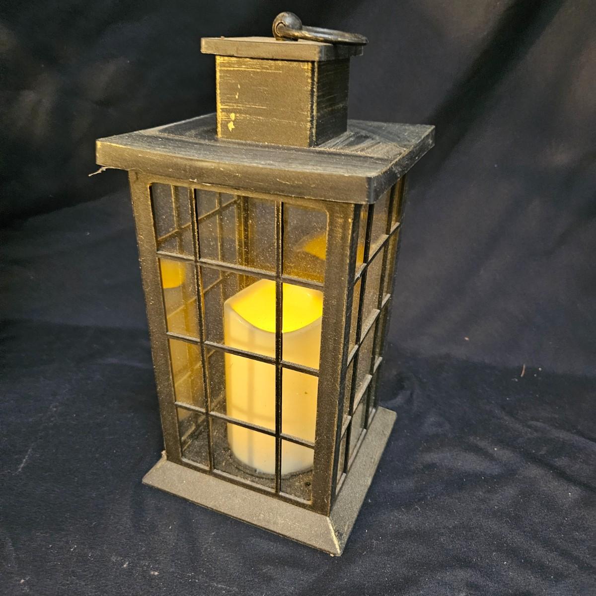 An assortment of seven battery powered lanterns that are a mix of metal and plastic frames. All lamps but the two largest ones were powered on. Four of the smaller lanterns have plastic frames and the two larger lanterns and the small one with the flowers have metal frames. The two larger lanterns measure approximately 7.5" x 7.5" x 15.5"H. Shipping available