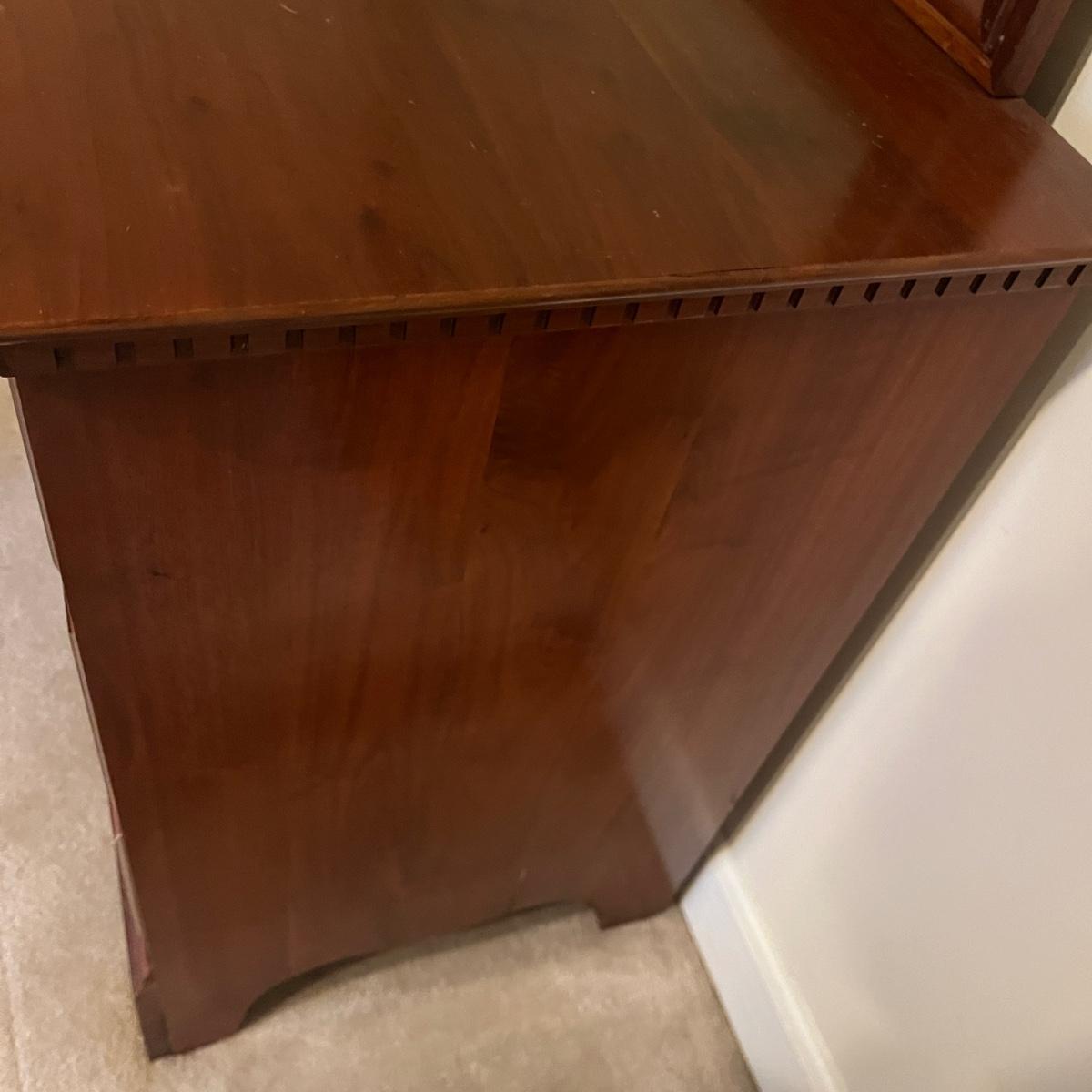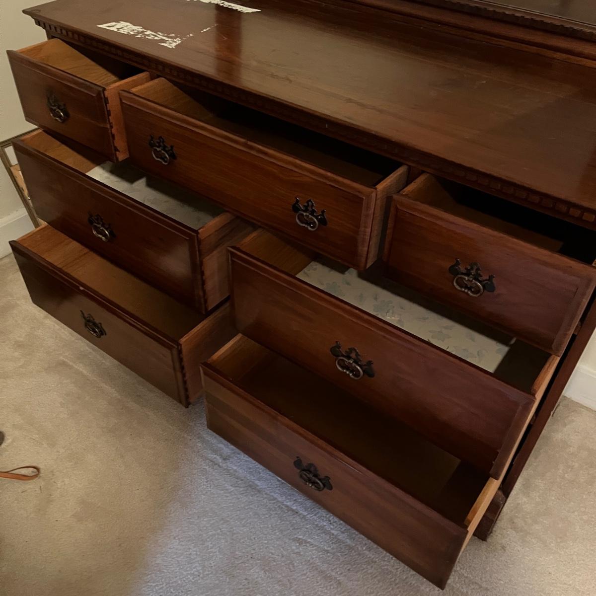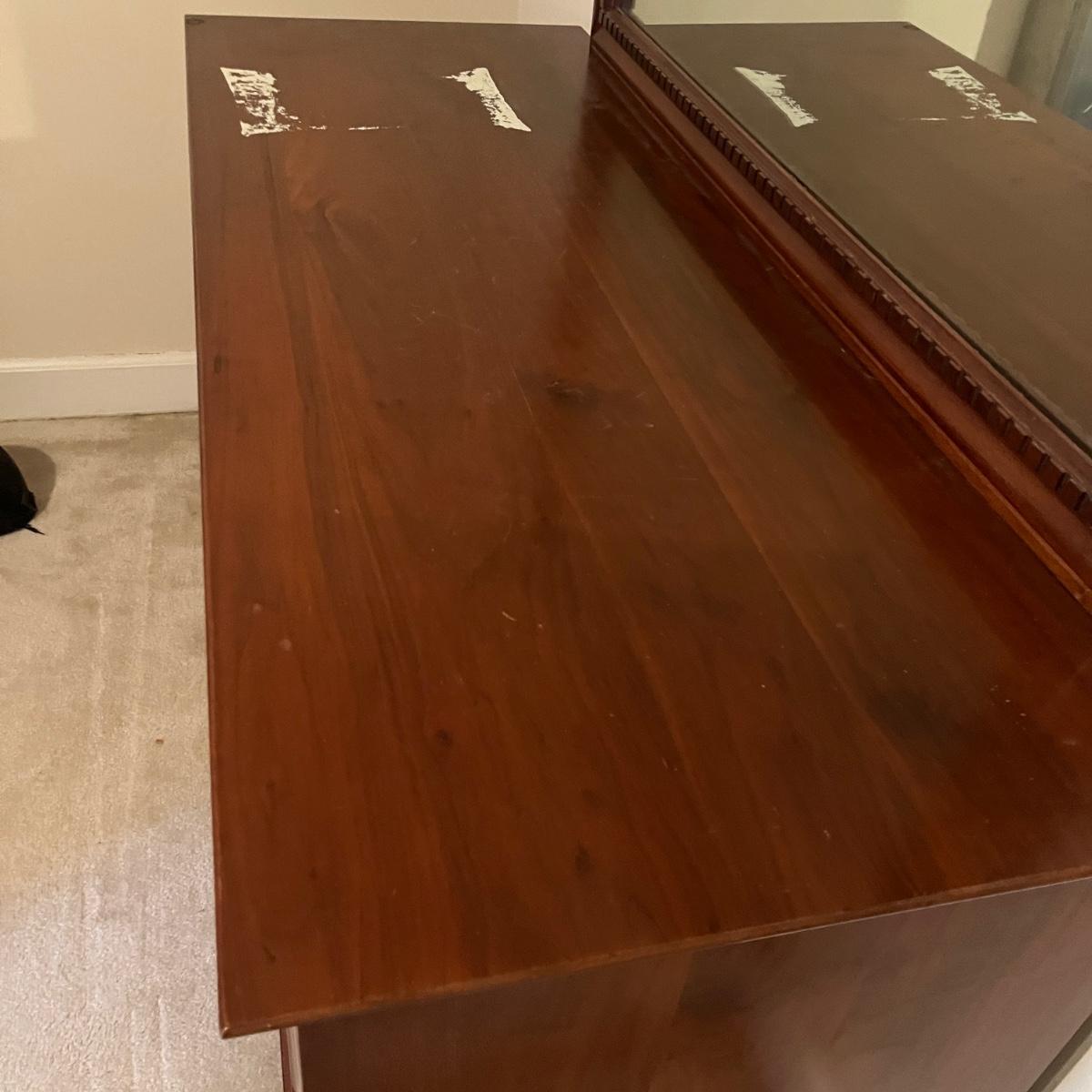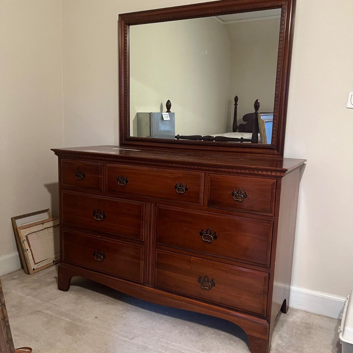 Lot includes a seven dovetailed drawer dresser with attached mirror. Dresser measures 20” x 52” x 33”H and mirror measures 43” x 33”H. Mirror is removable; winning bidder will need to bring appropriate tools to disassemble. Top of dresser has some white residue on it that appear to be removable, see pictures. Item is up one flight of stairs.
