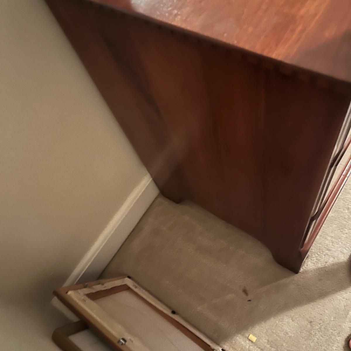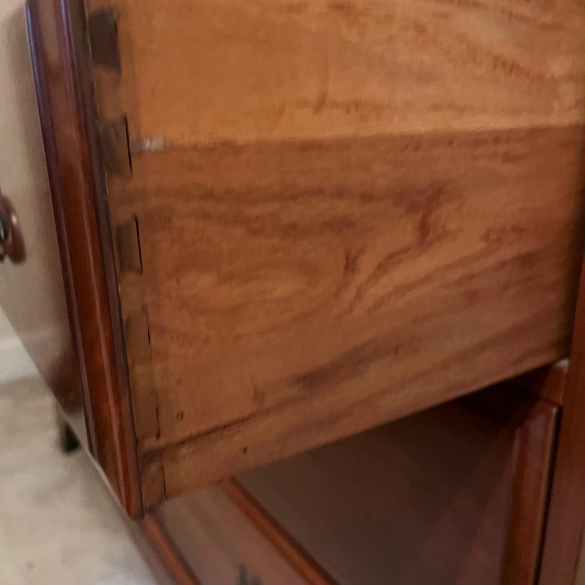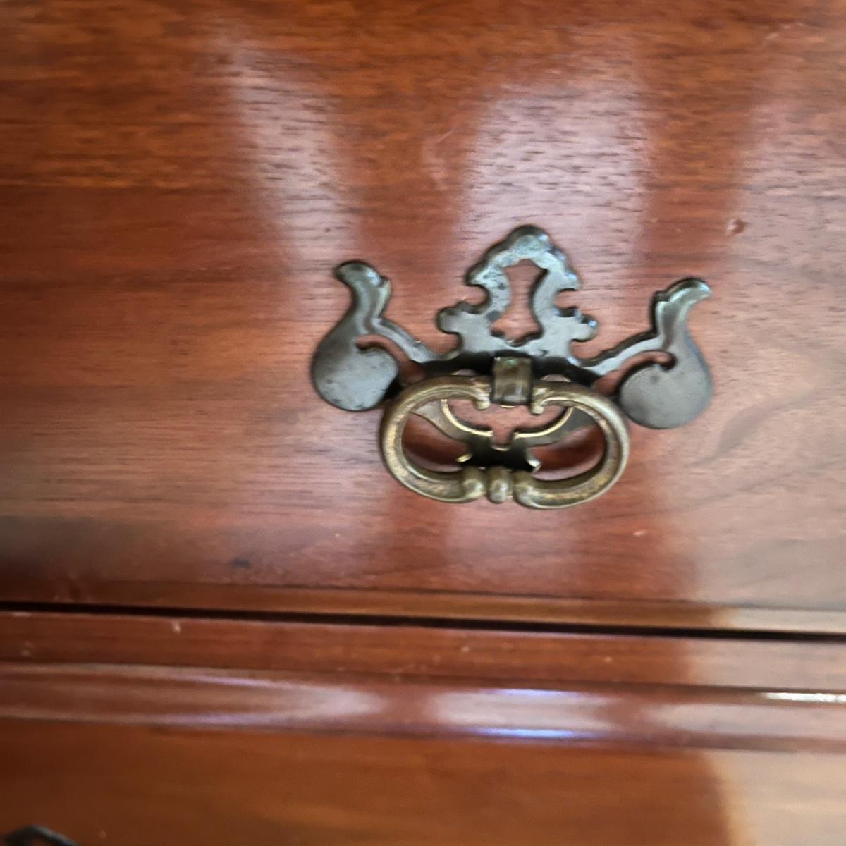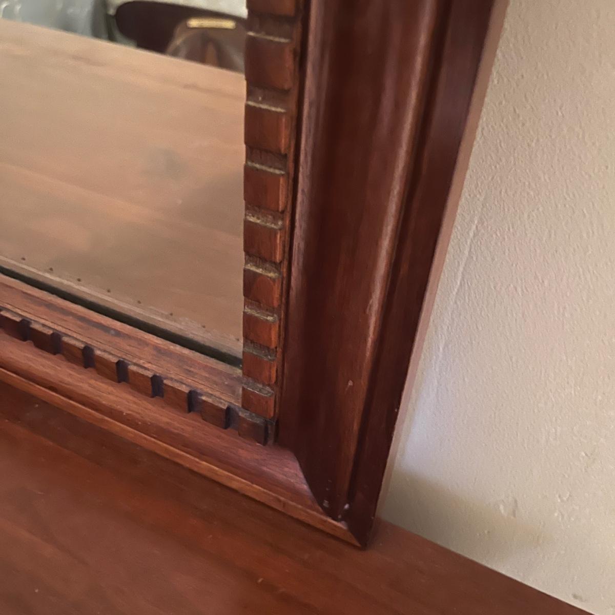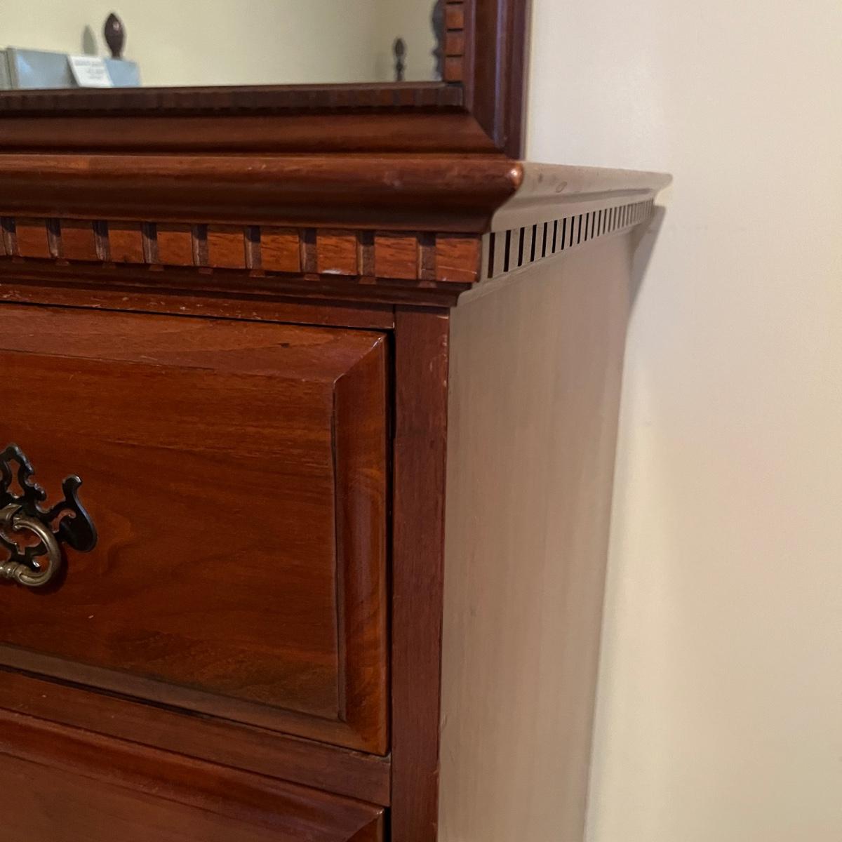 Lot includes a seven dovetailed drawer dresser with attached mirror. Dresser measures 20” x 52” x 33”H and mirror measures 43” x 33”H. Mirror is removable; winning bidder will need to bring appropriate tools to disassemble. Top of dresser has some white residue on it that appear to be removable, see pictures. Item is up one flight of stairs.