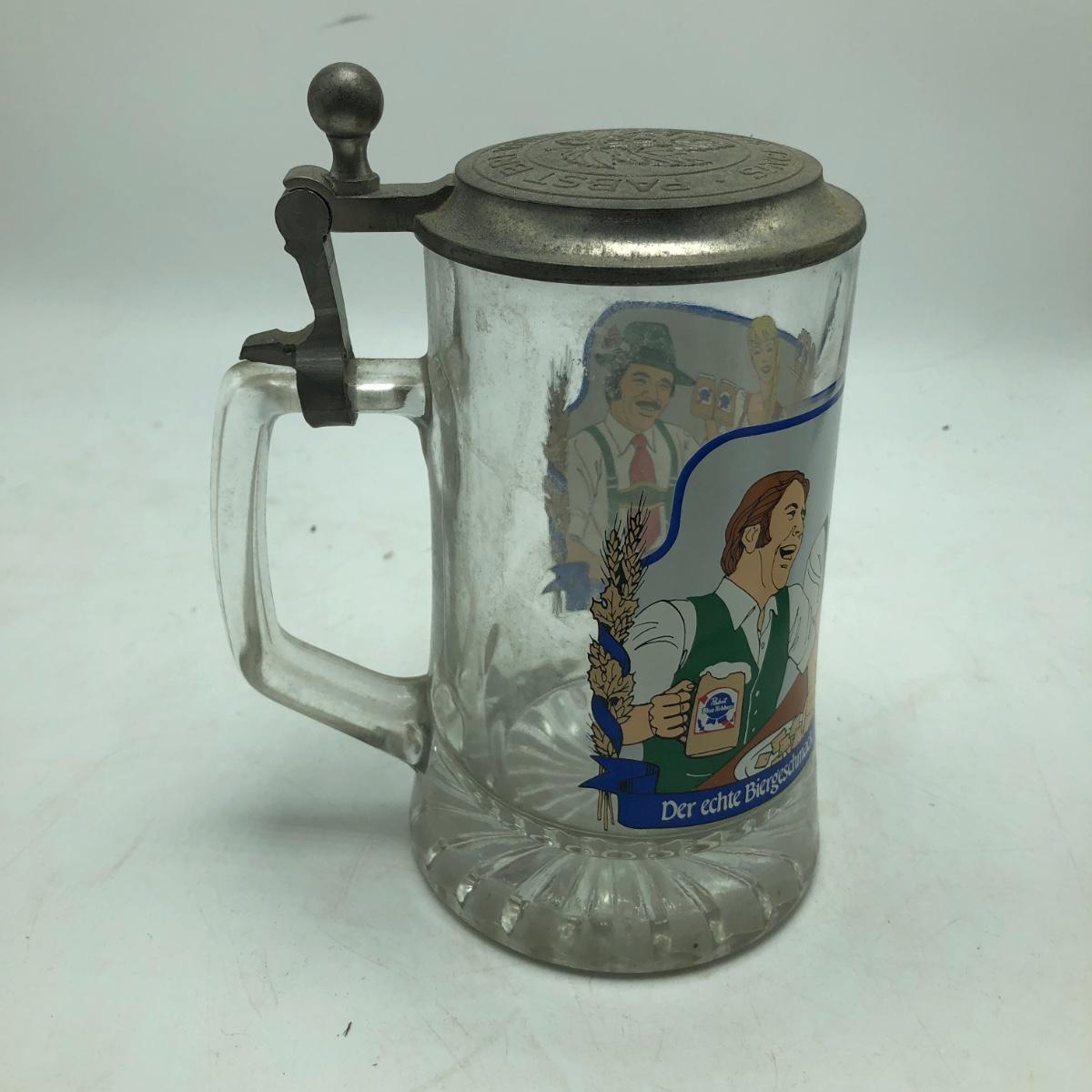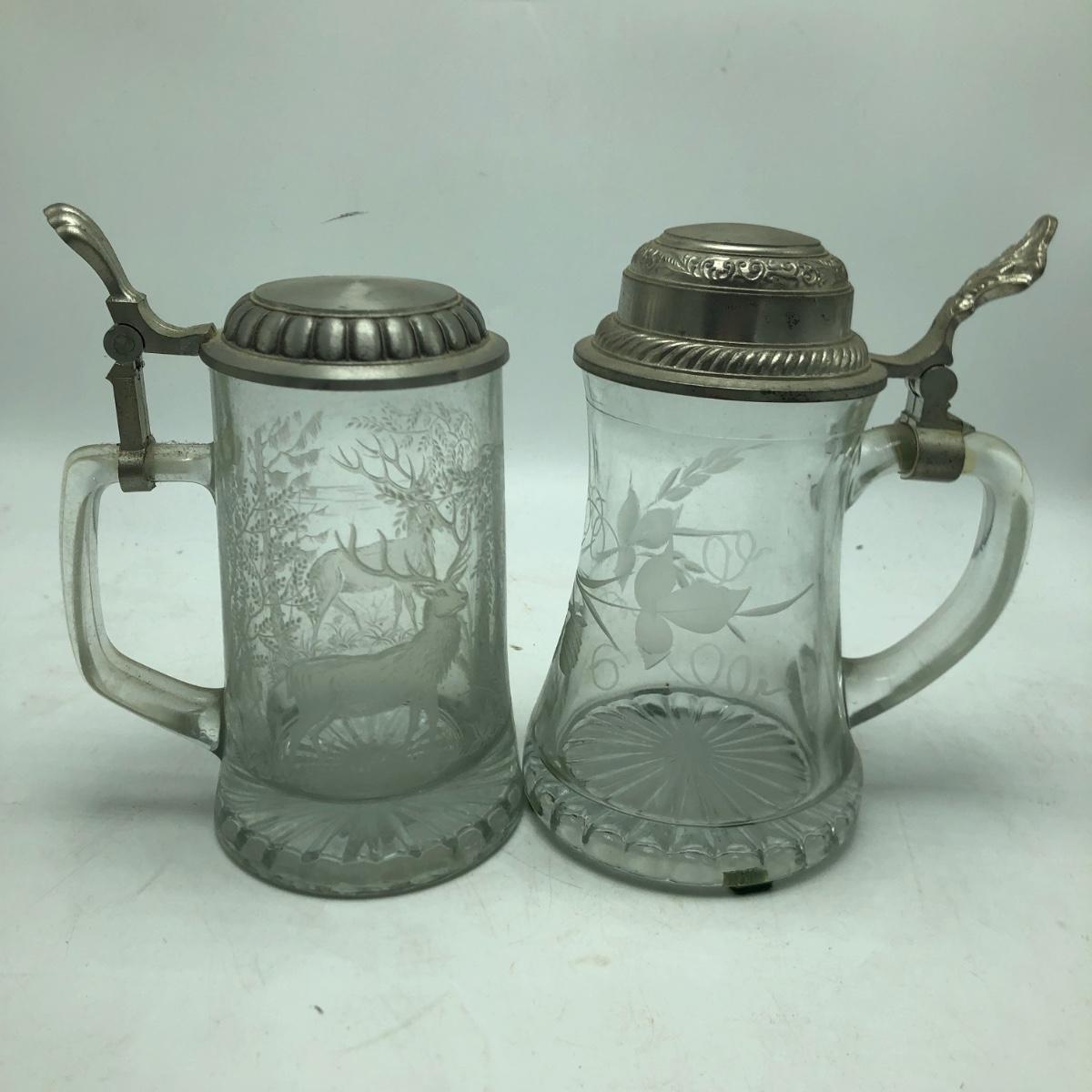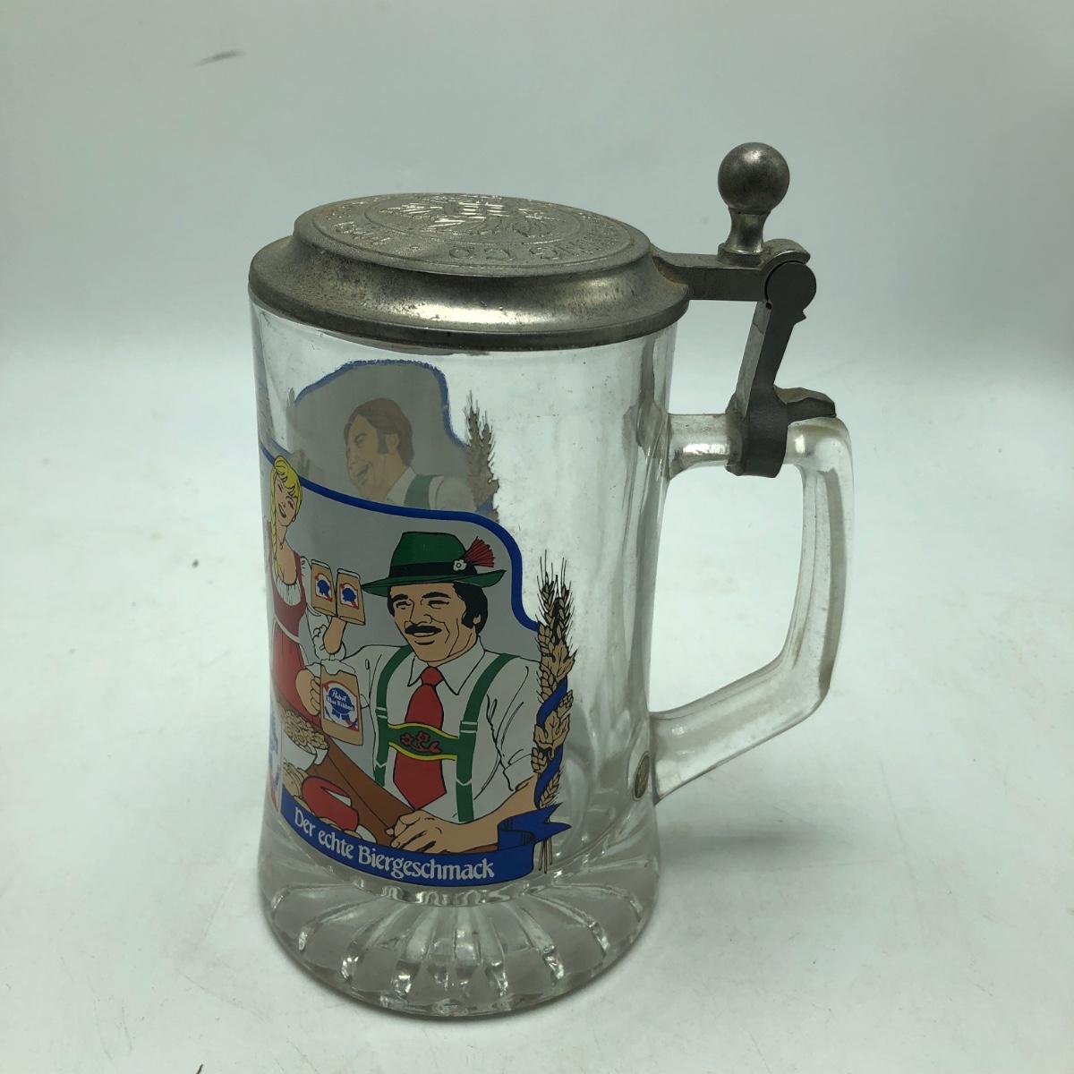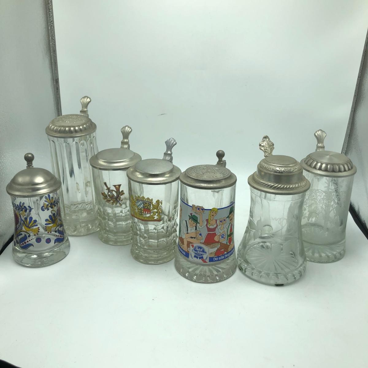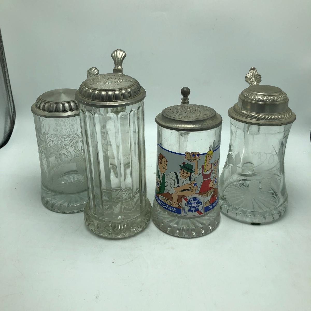 Lot contains two etched glass steins, Pabst and Miller stein and three with decals. The one with Bayern decal has top broken off, see pictures. Tallest stein measures 3.5” x 5” x 8.5”.