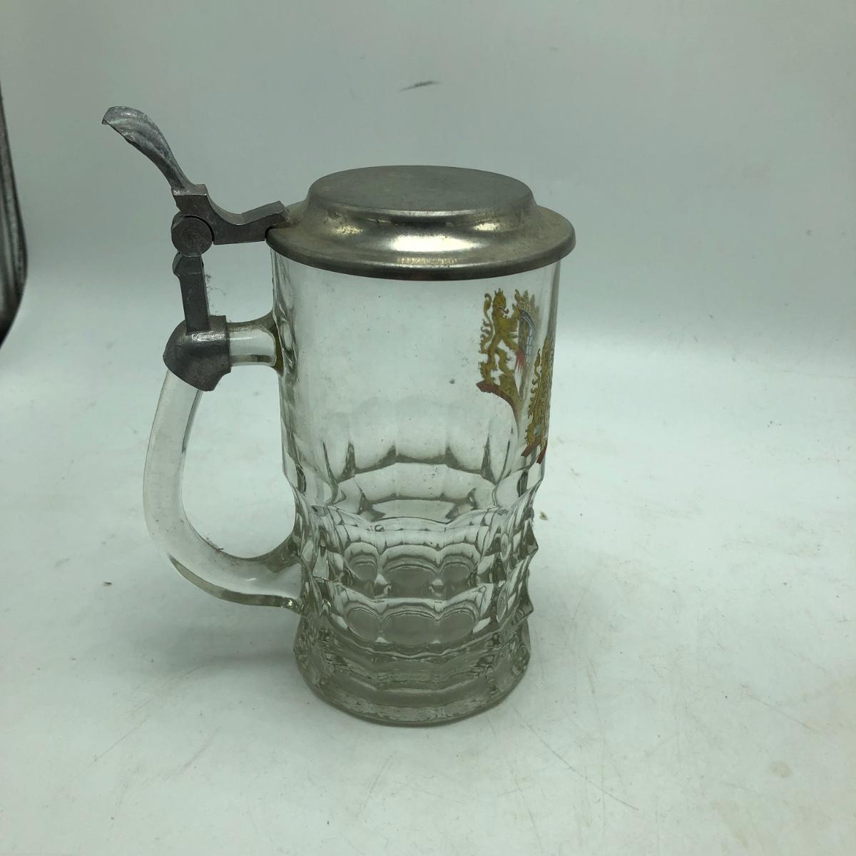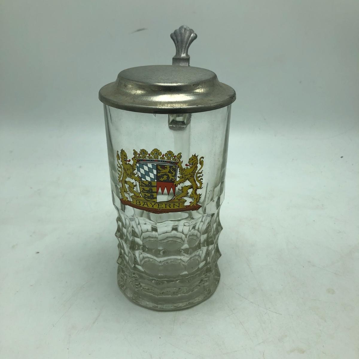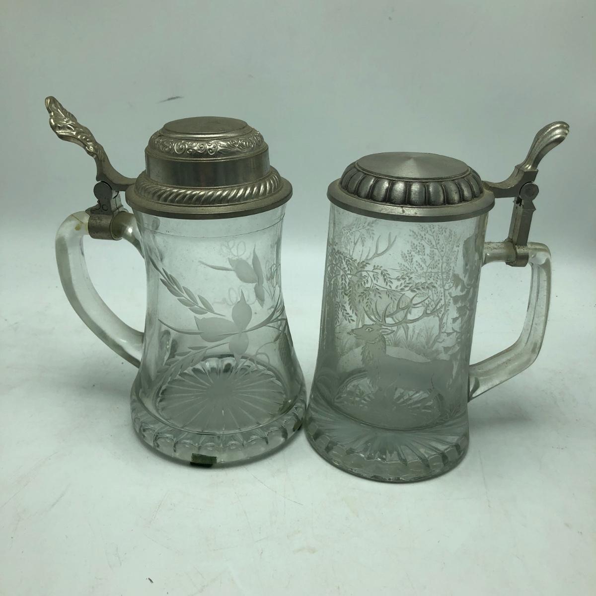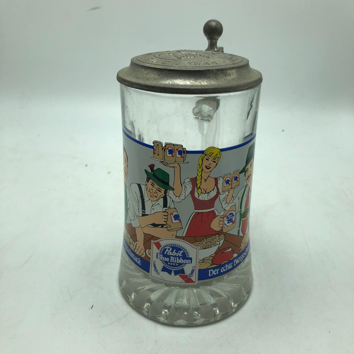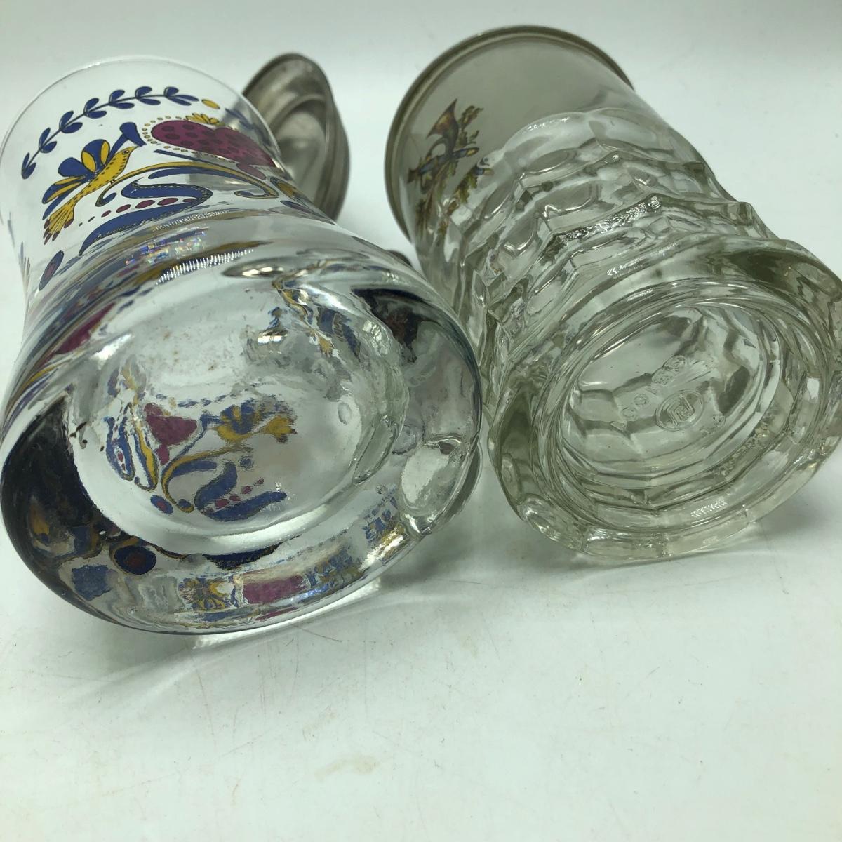 Lot contains two etched glass steins, Pabst and Miller stein and three with decals. The one with Bayern decal has top broken off, see pictures. Tallest stein measures 3.5” x 5” x 8.5”.