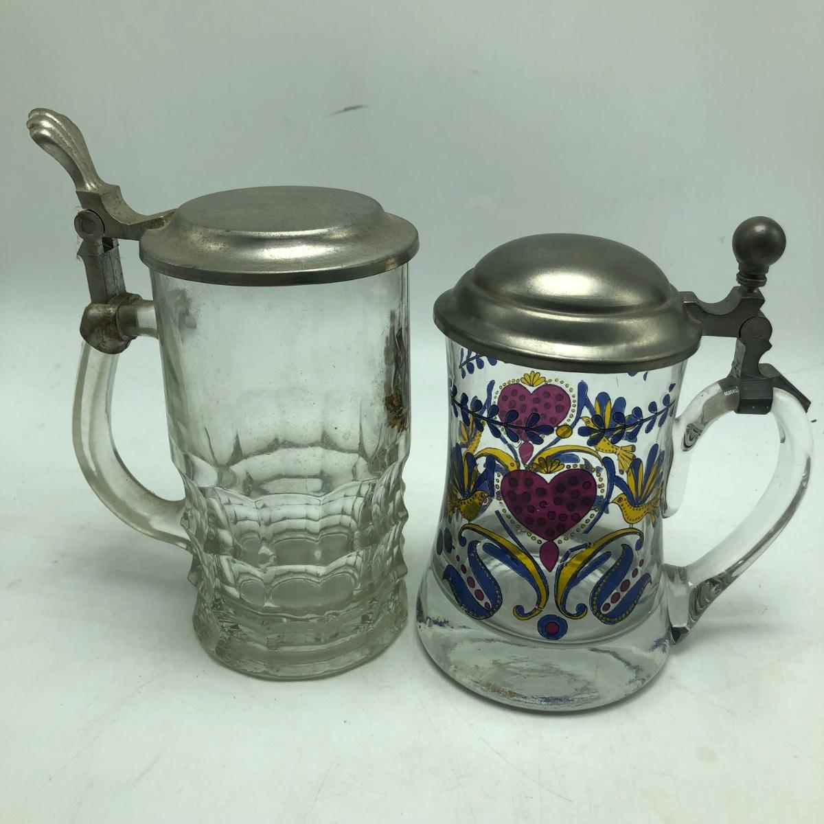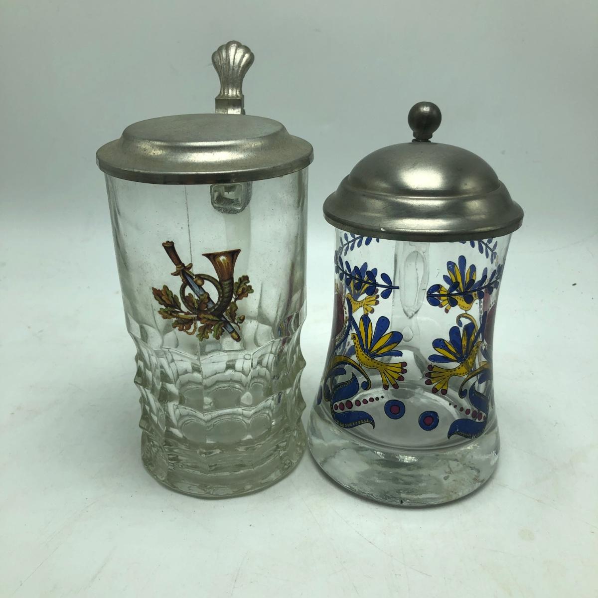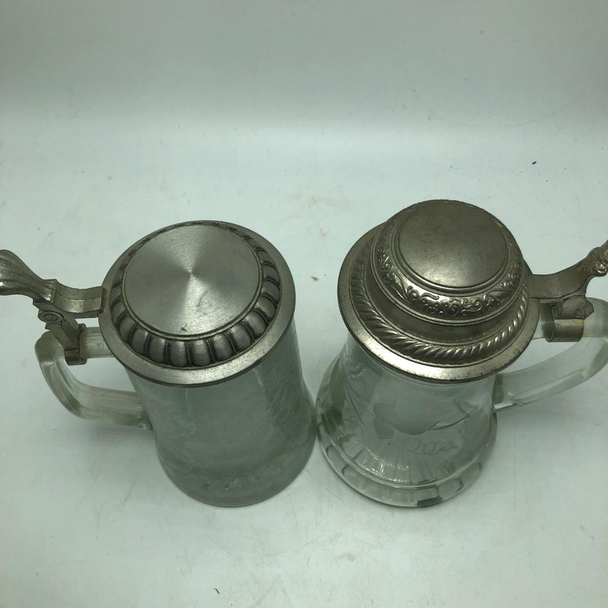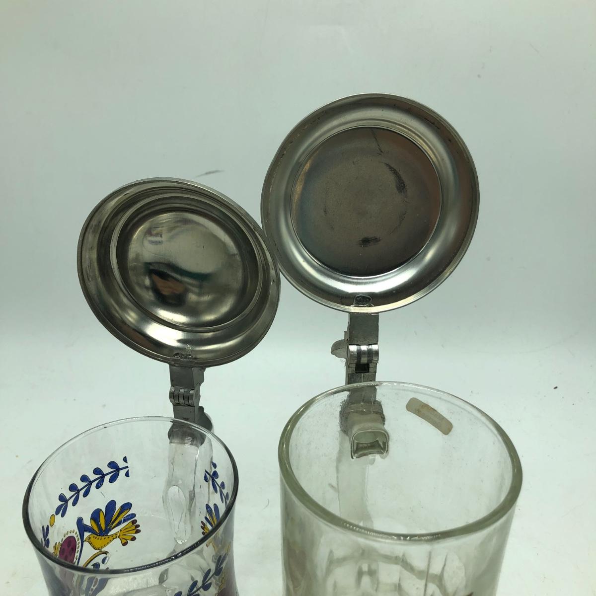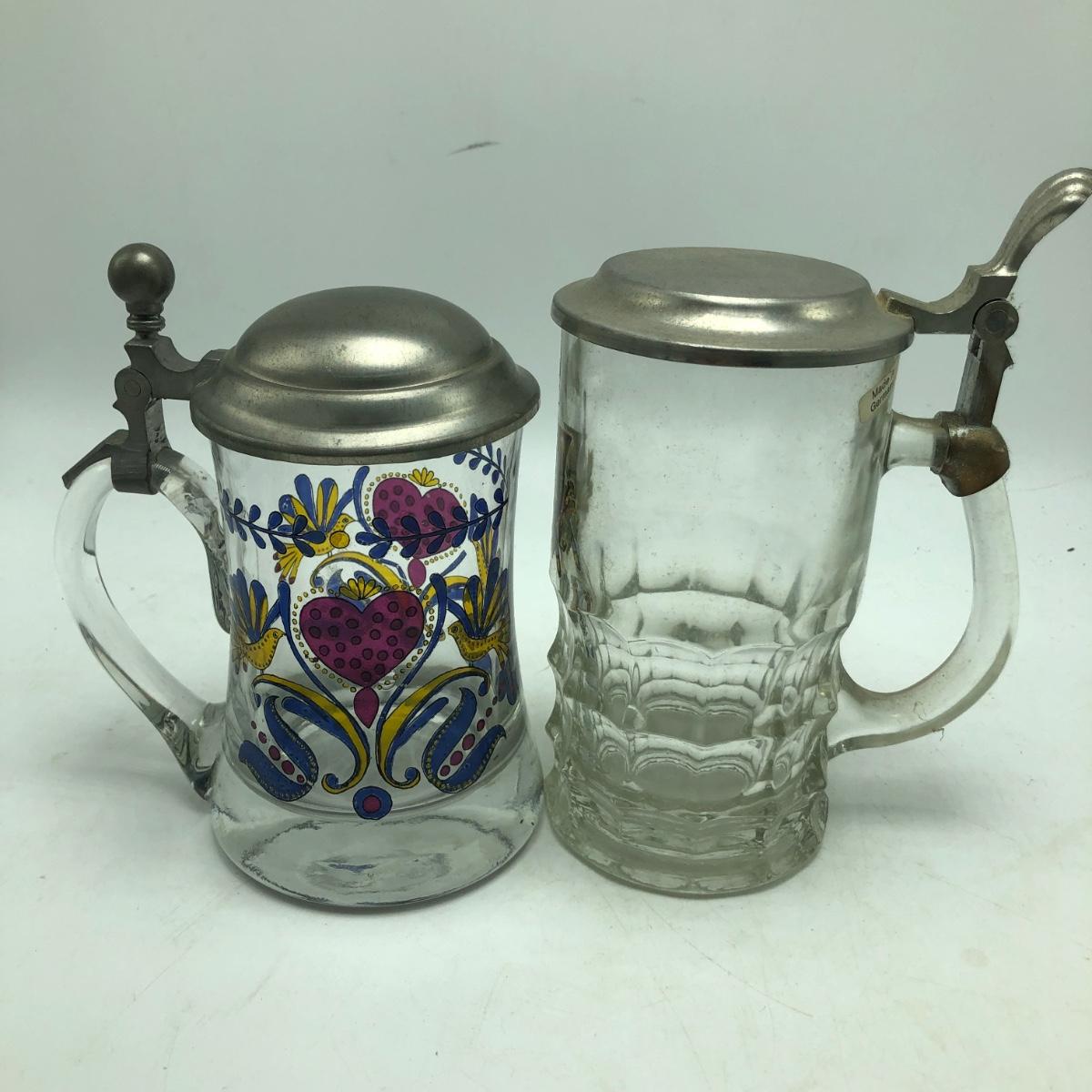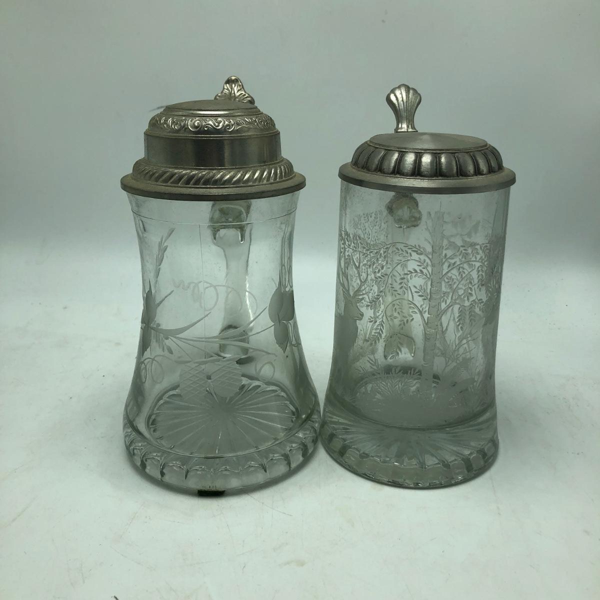 Lot contains two etched glass steins, Pabst and Miller stein and three with decals. The one with Bayern decal has top broken off, see pictures. Tallest stein measures 3.5” x 5” x 8.5”.