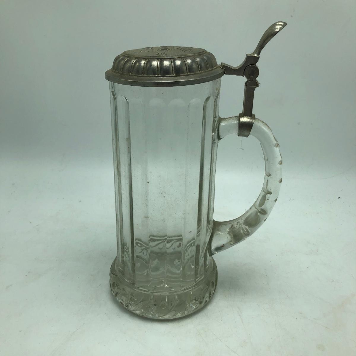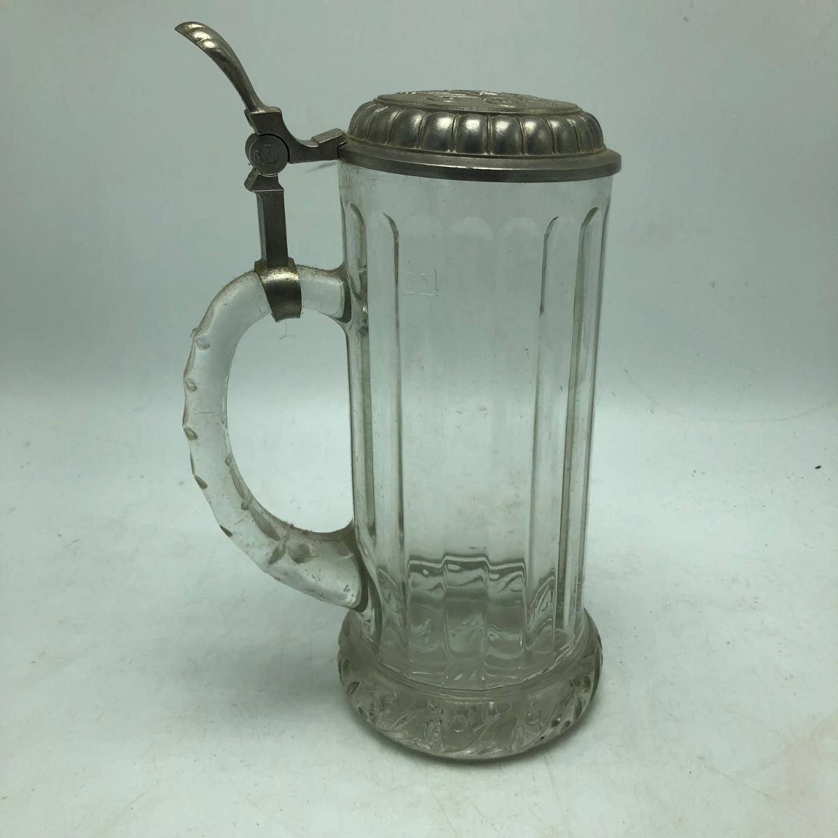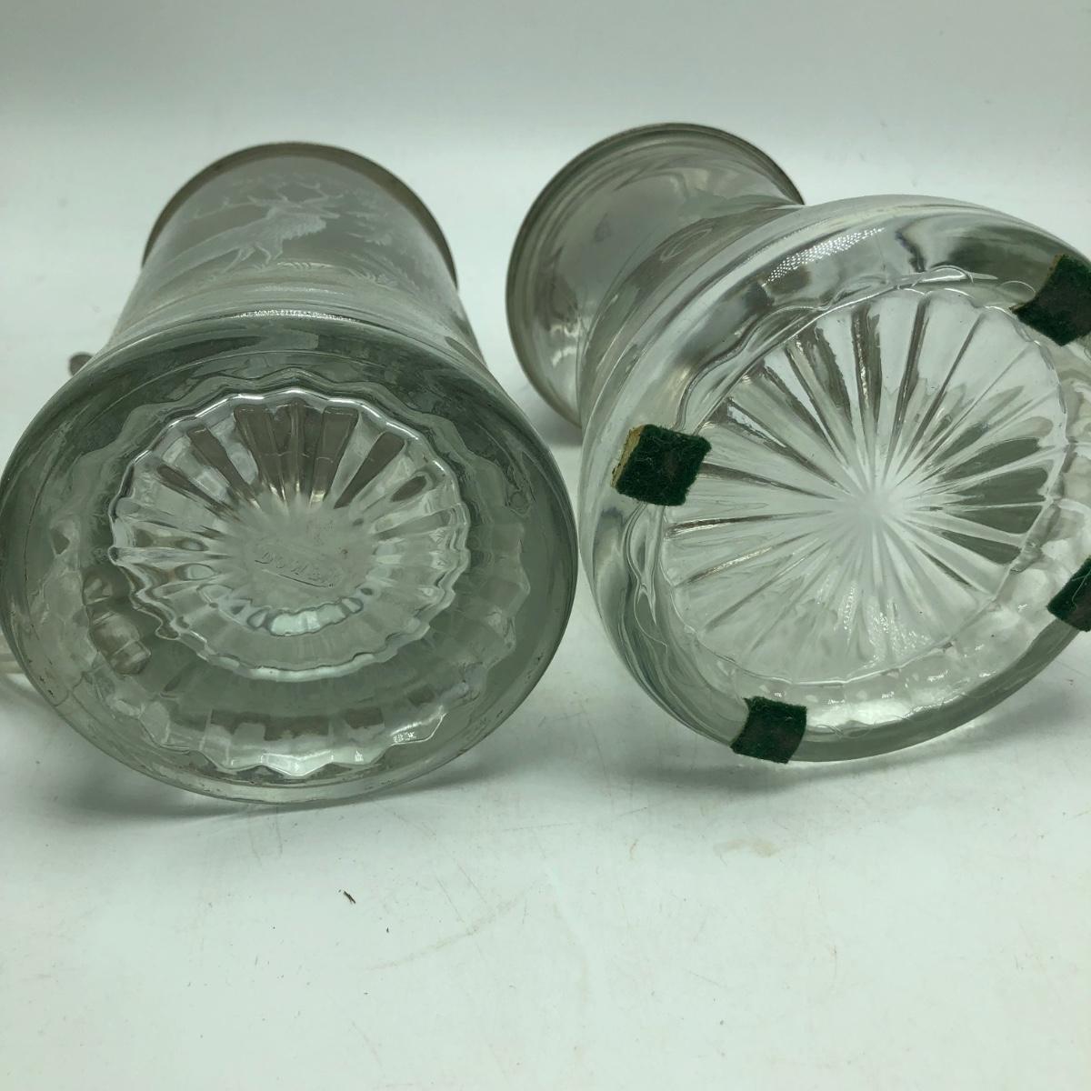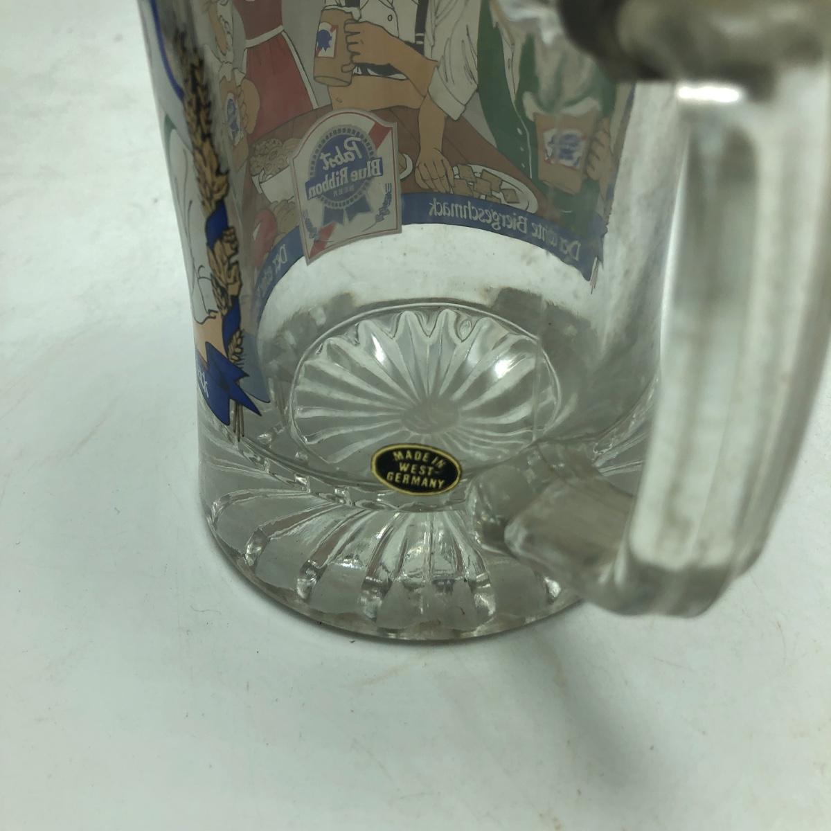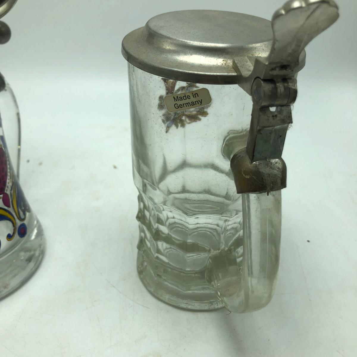 Lot contains two etched glass steins, Pabst and Miller stein and three with decals. The one with Bayern decal has top broken off, see pictures. Tallest stein measures 3.5” x 5” x 8.5”.