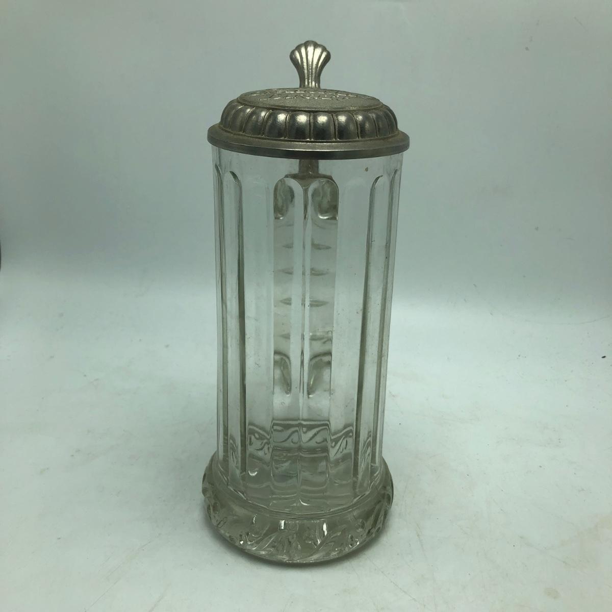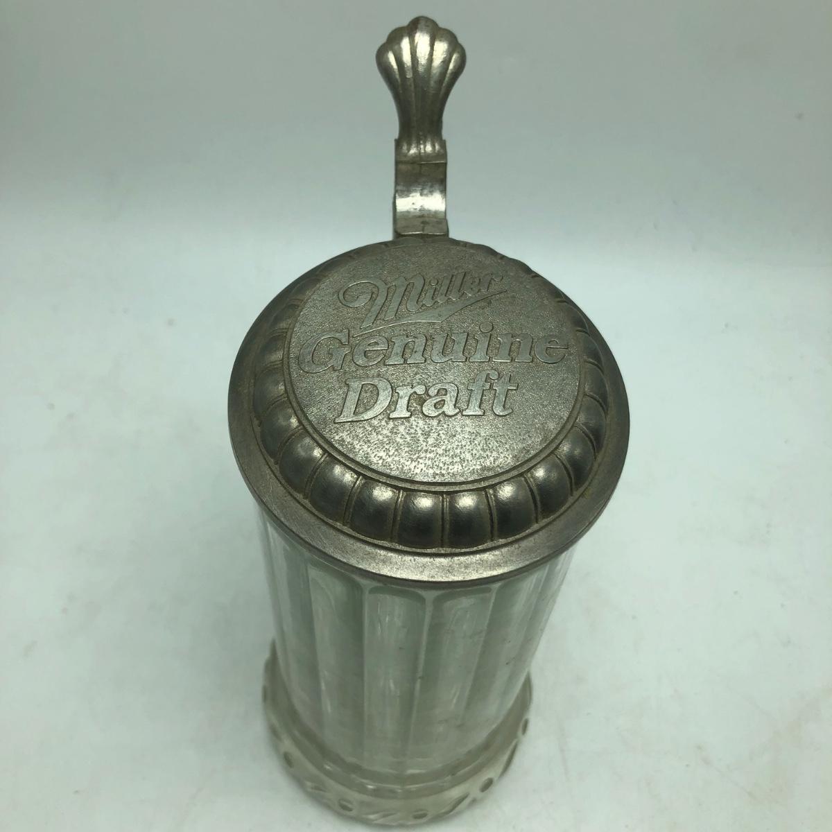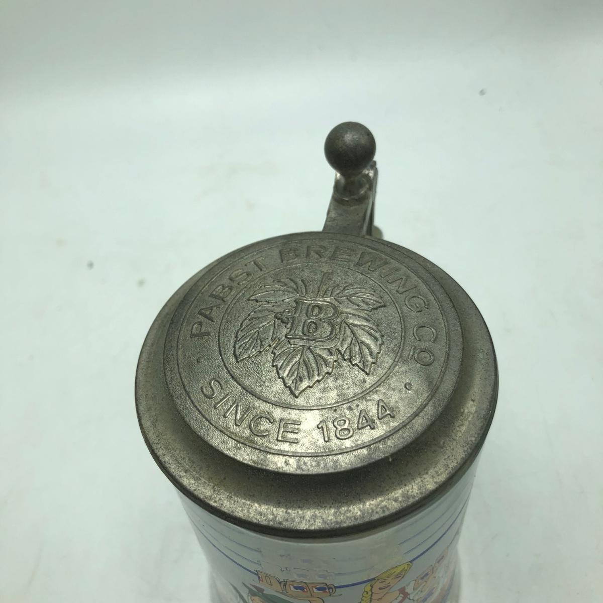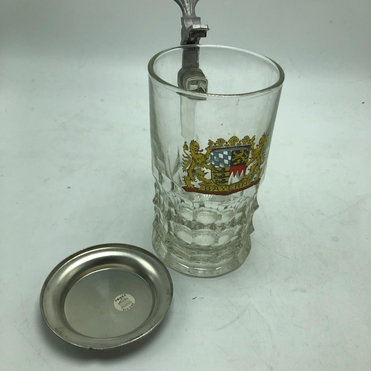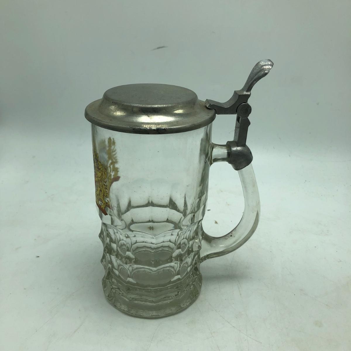Lot contains two etched glass steins, Pabst and Miller stein and three with decals. The one with Bayern decal has top broken off, see pictures. Tallest stein measures 3.5” x 5” x 8.5”.