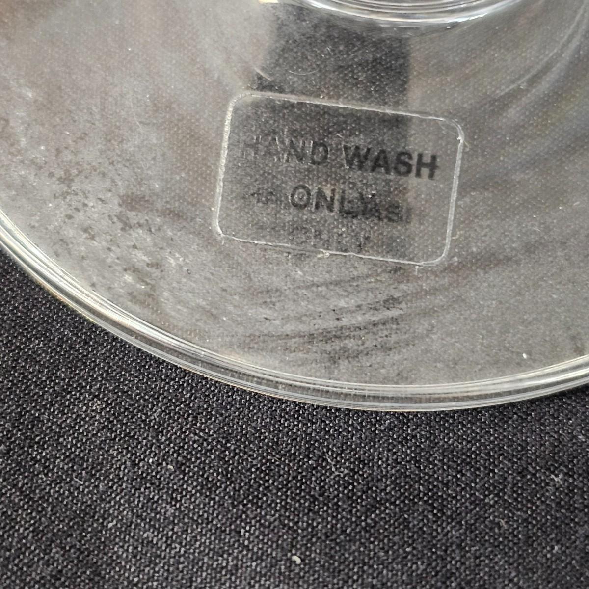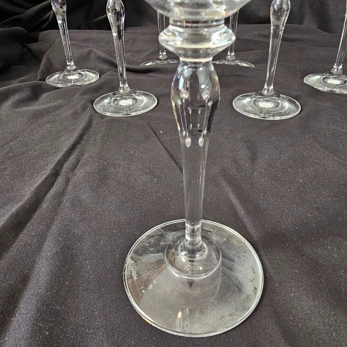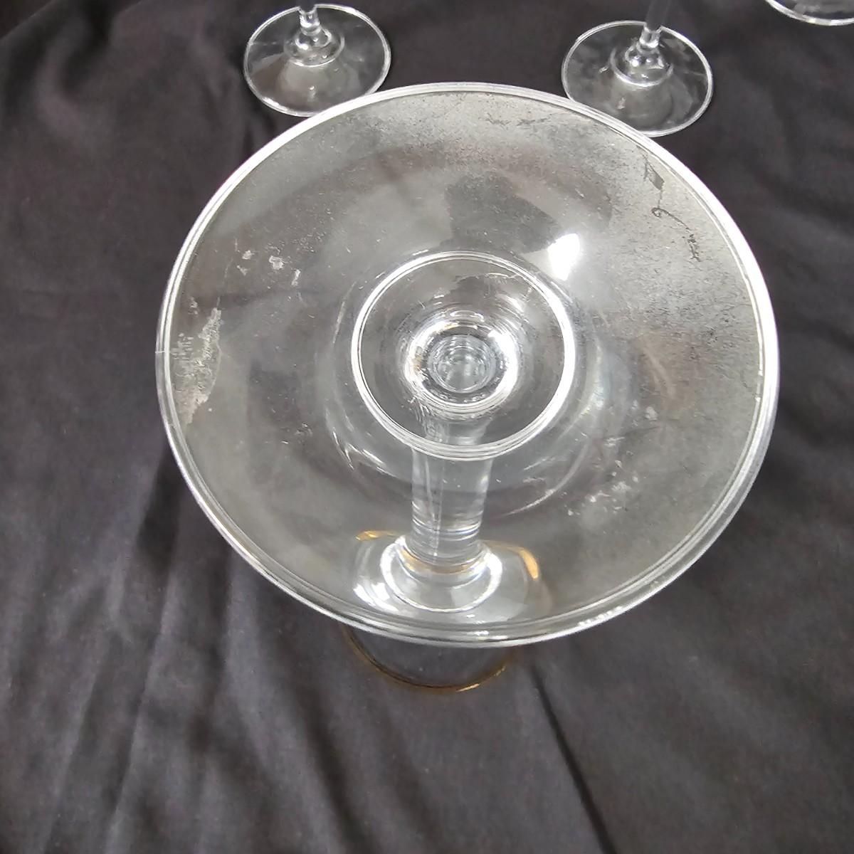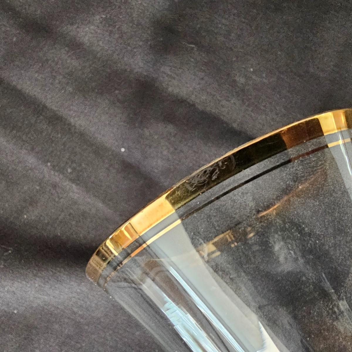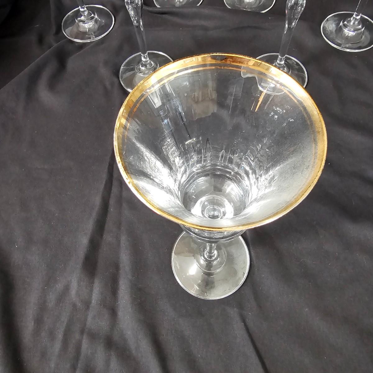 Tapered tops and slender stems, these Mikasa wine glasses have a subtle banding of gold around the rims. Measures 3"D x 9"H. Small areas of gold rim have discoloration and missing gold. Matching flutes and stemware are available elsewhere in this auction. See photos for details. Shipping available.
