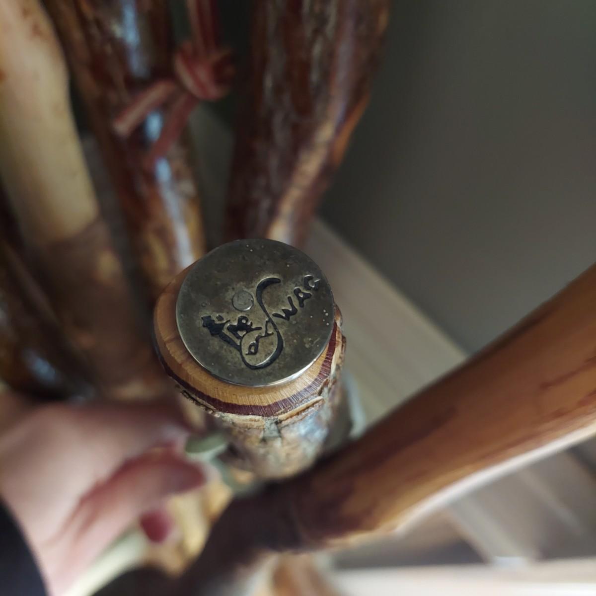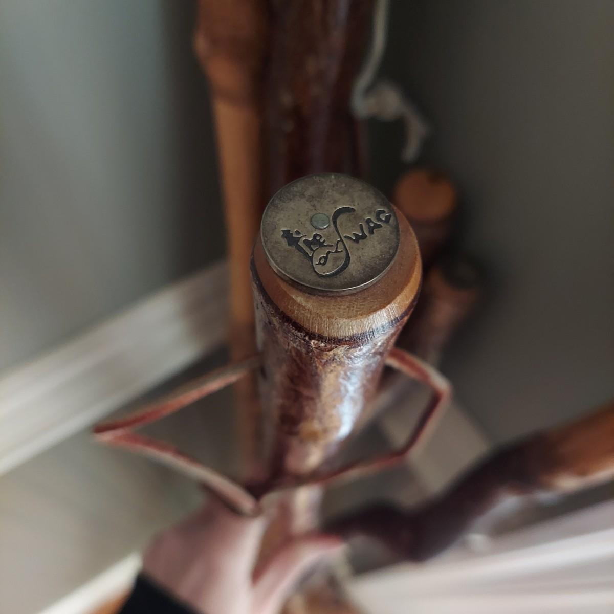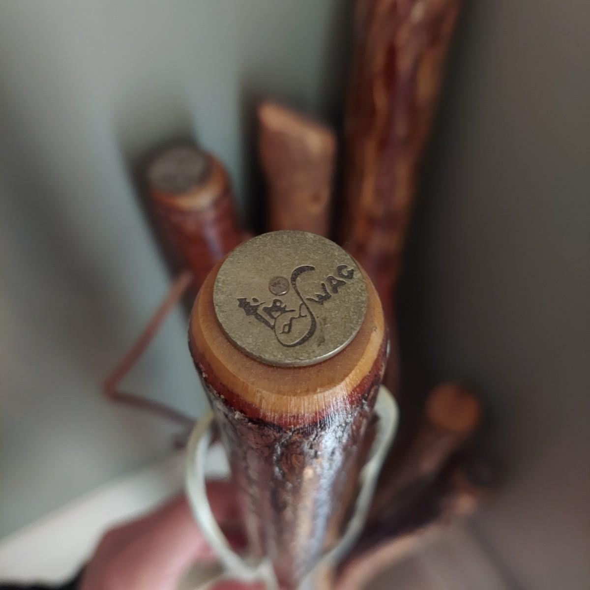 A collection of seven hiking sticks that appear to be lacquered and five have rubber bottoms. The longest stick measures approximately 54" in length. Some sticks have metal markings from North Carolina's own The Swag resort. Local pickup only