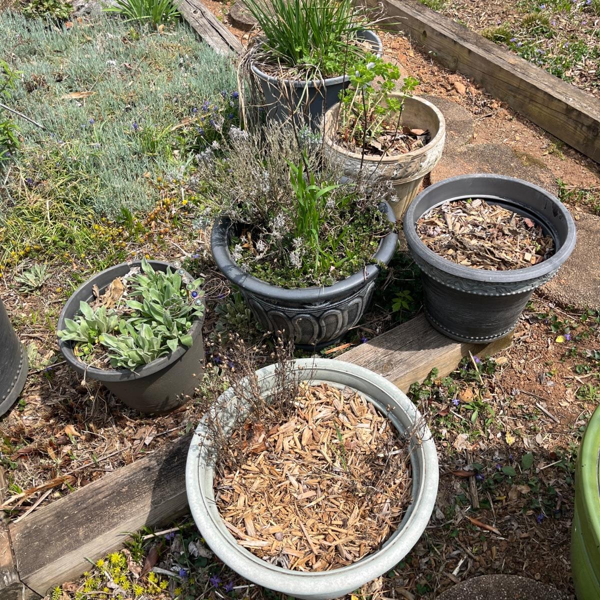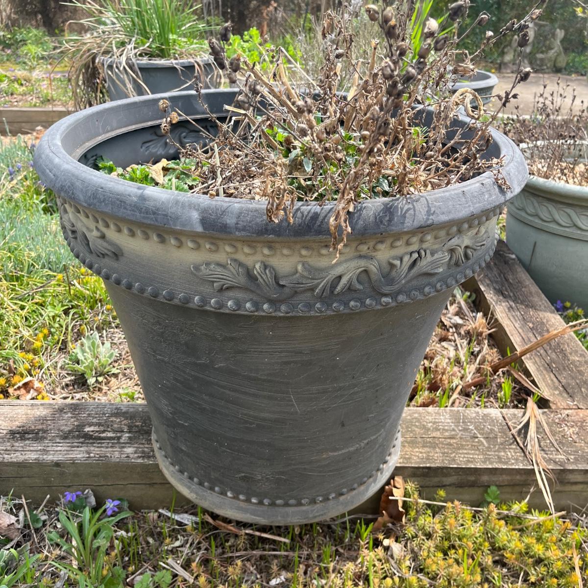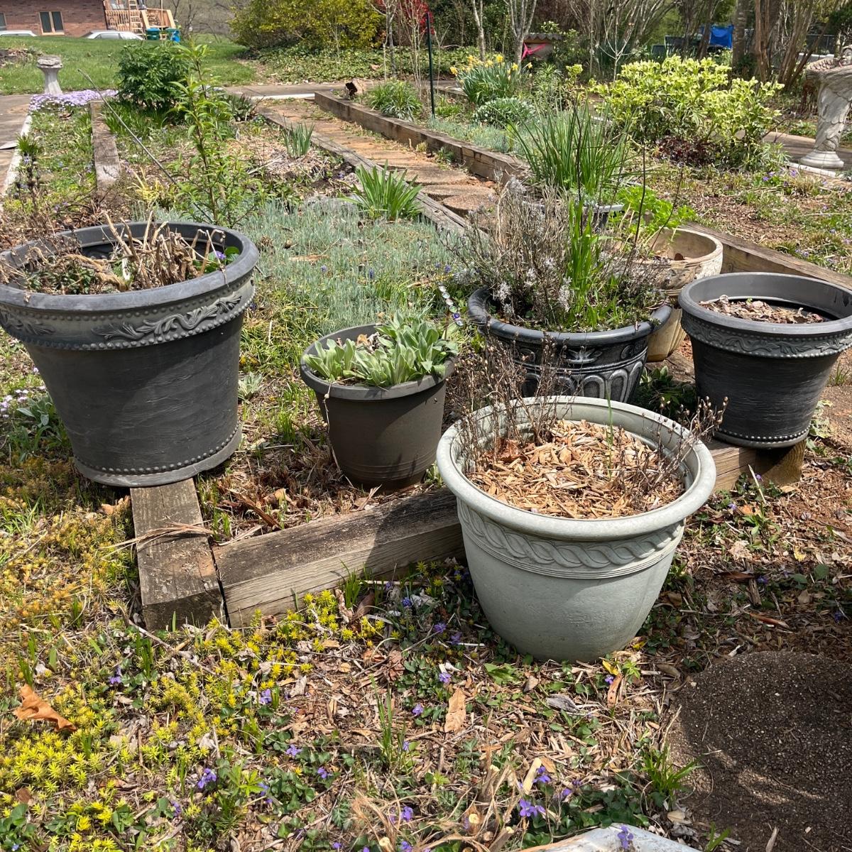 Lot includes seven plastic plant pots in a variety of sizes with soil and mulch in them. Largest pot measures 23” x 19”H.