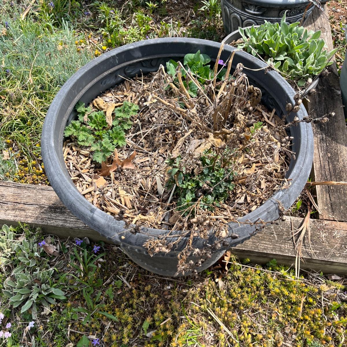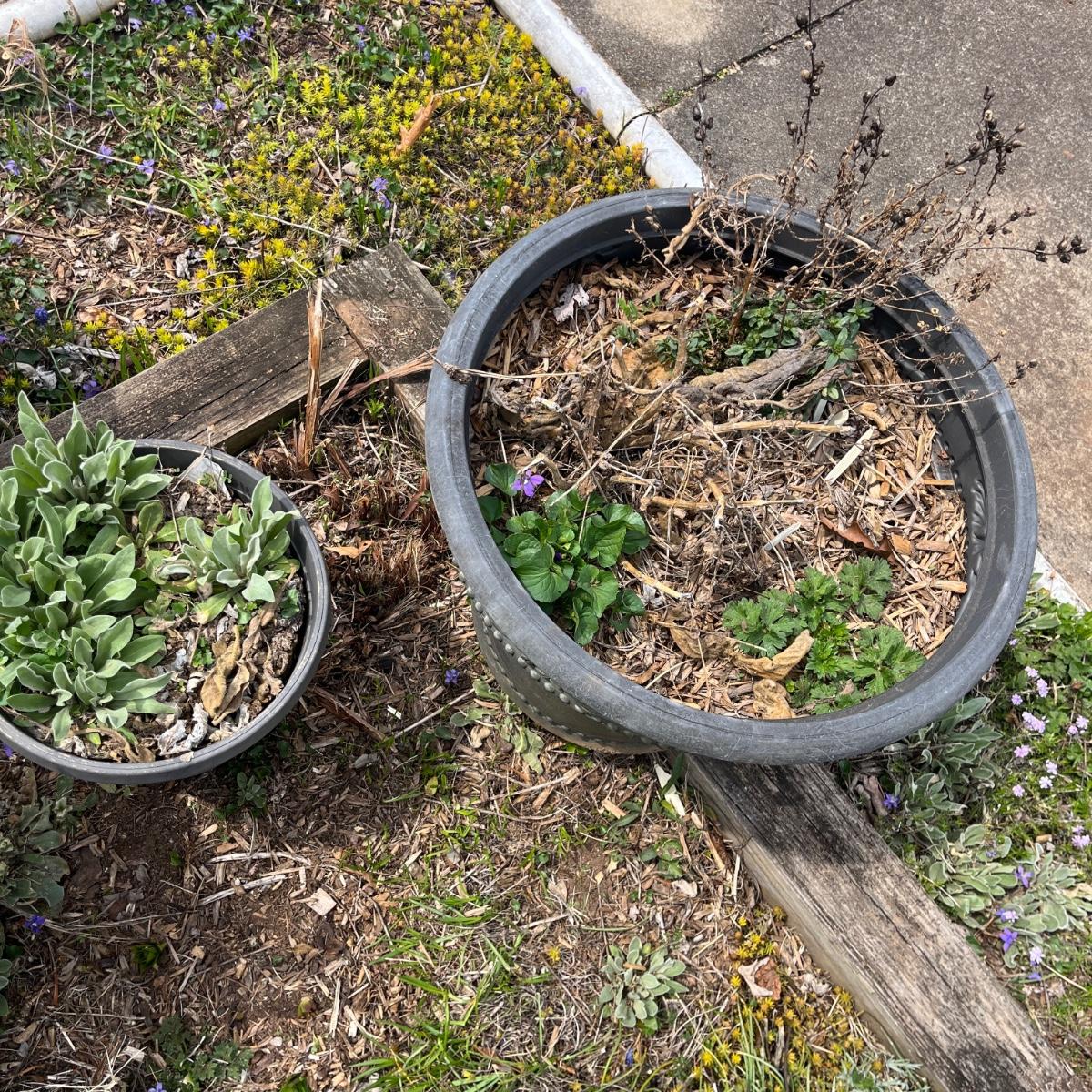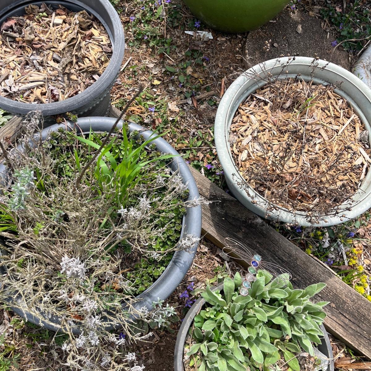 Lot includes seven plastic plant pots in a variety of sizes with soil and mulch in them. Largest pot measures 23” x 19”H.