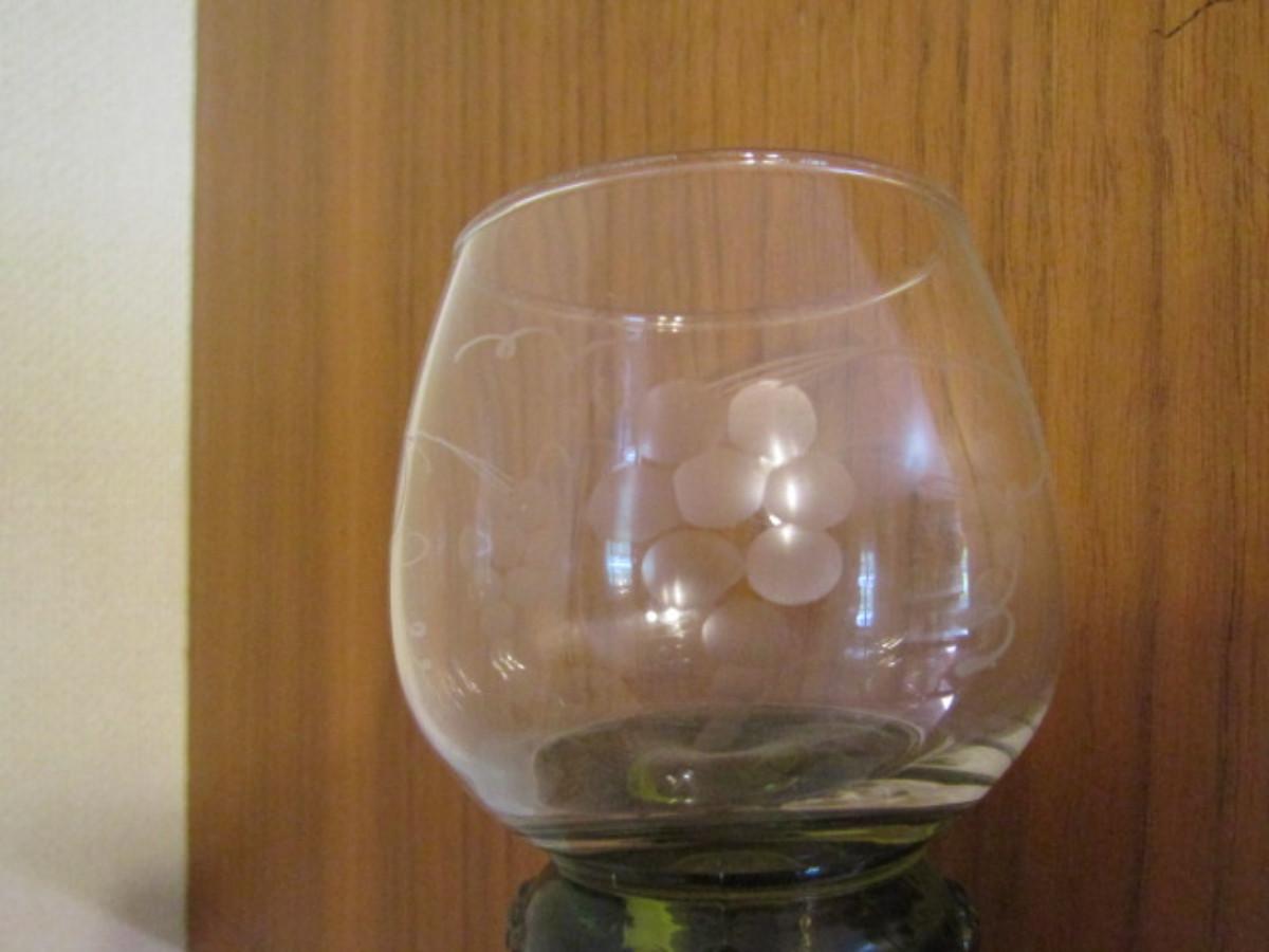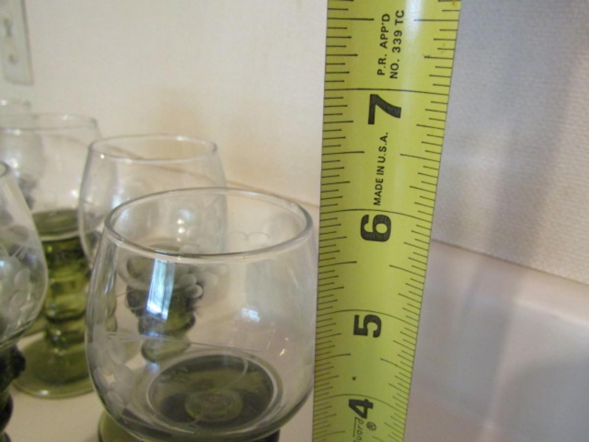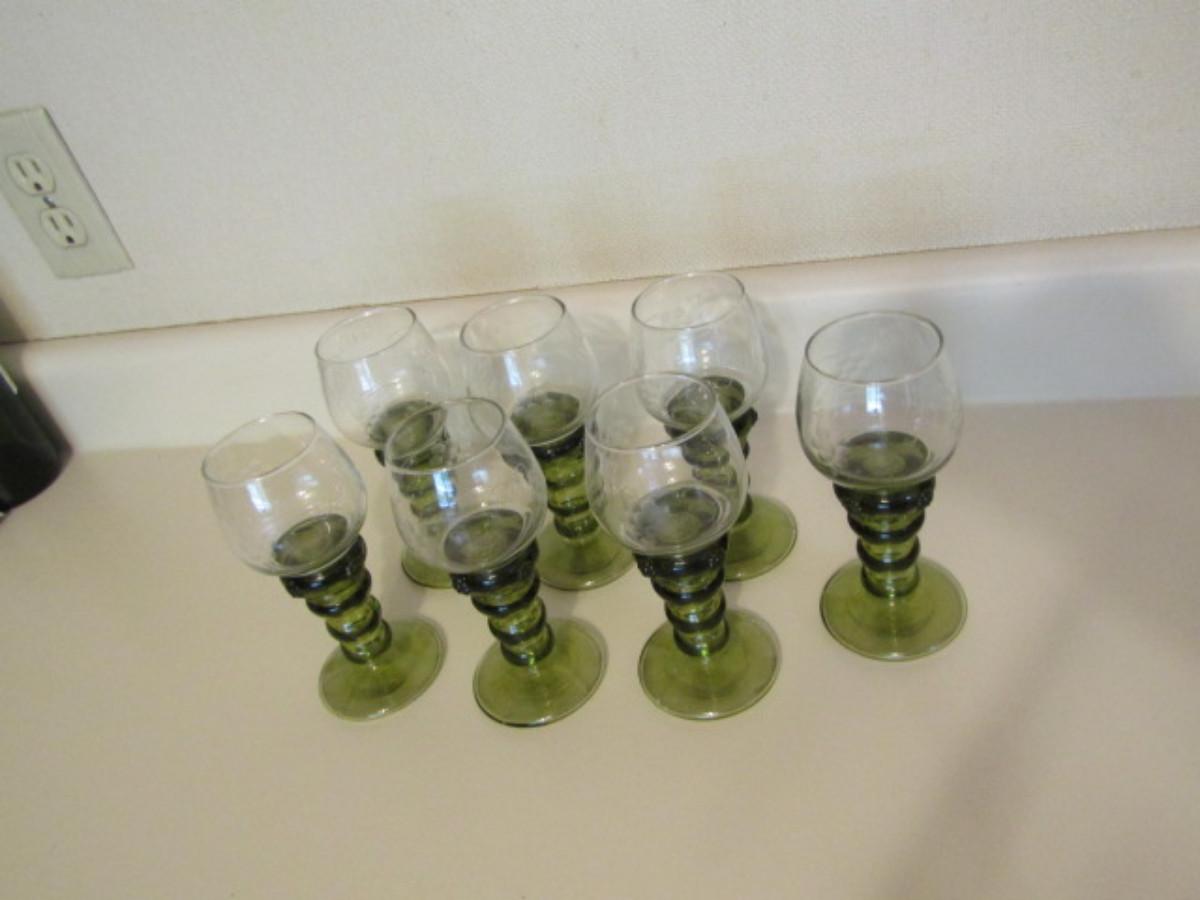 Seven Mid Century Style Green Stemmed Wine/Cordial Glasses