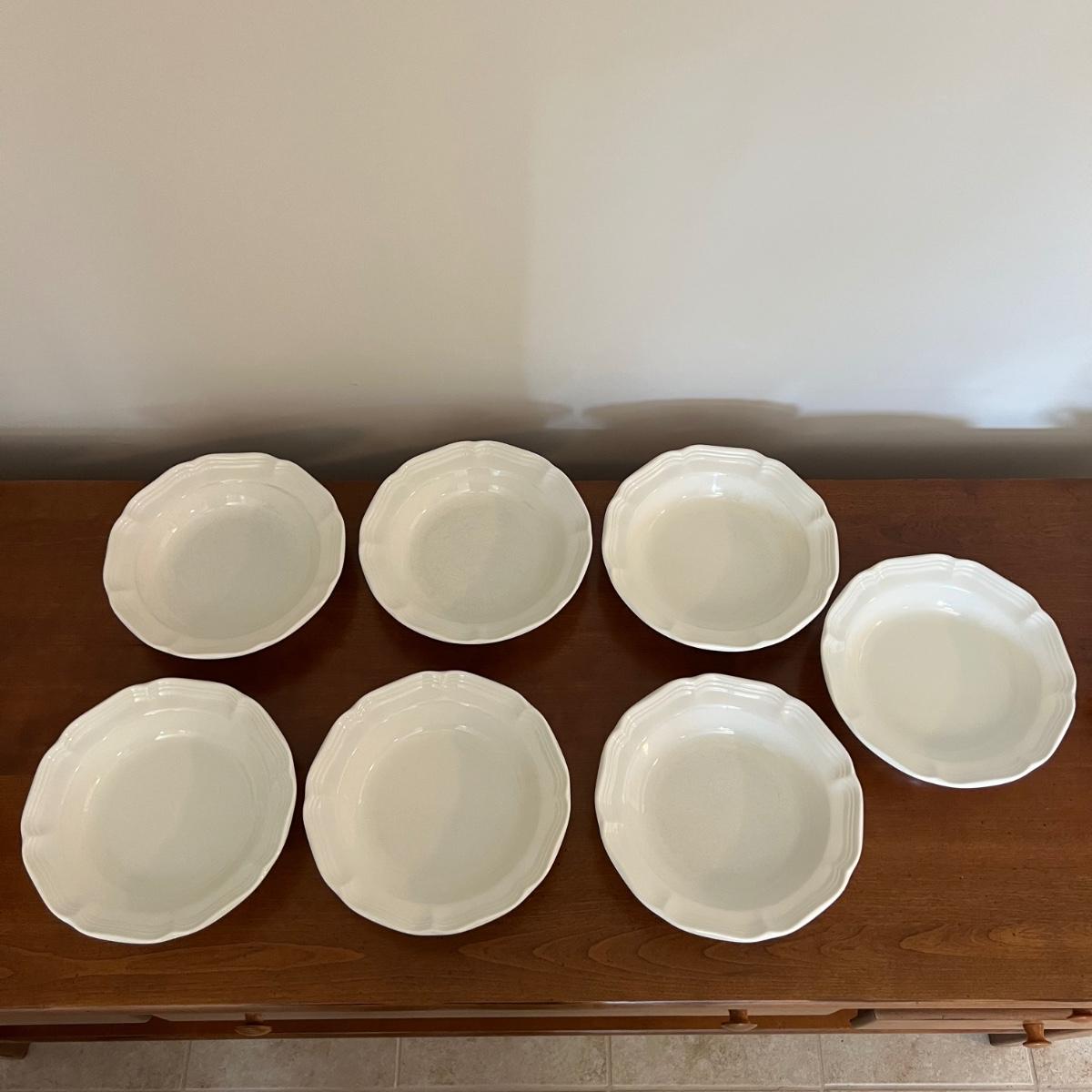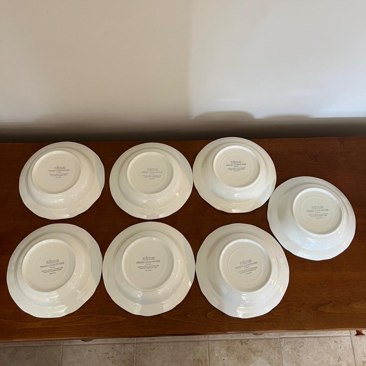 Seven matching soup bowls and plates in Mikasa French Countryside pattern. The bowls are 8.5”D x 2”H and the plates are 8”D x 1”H.
