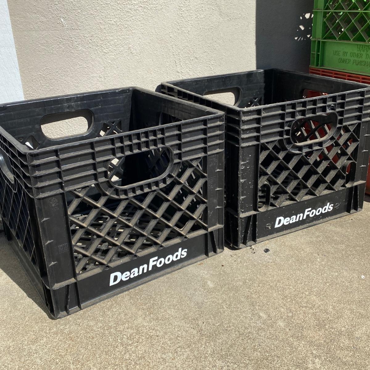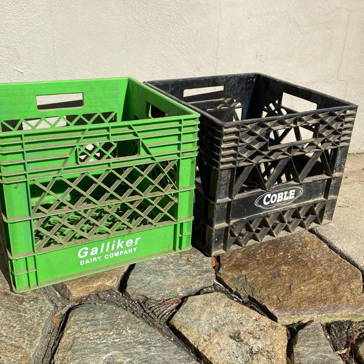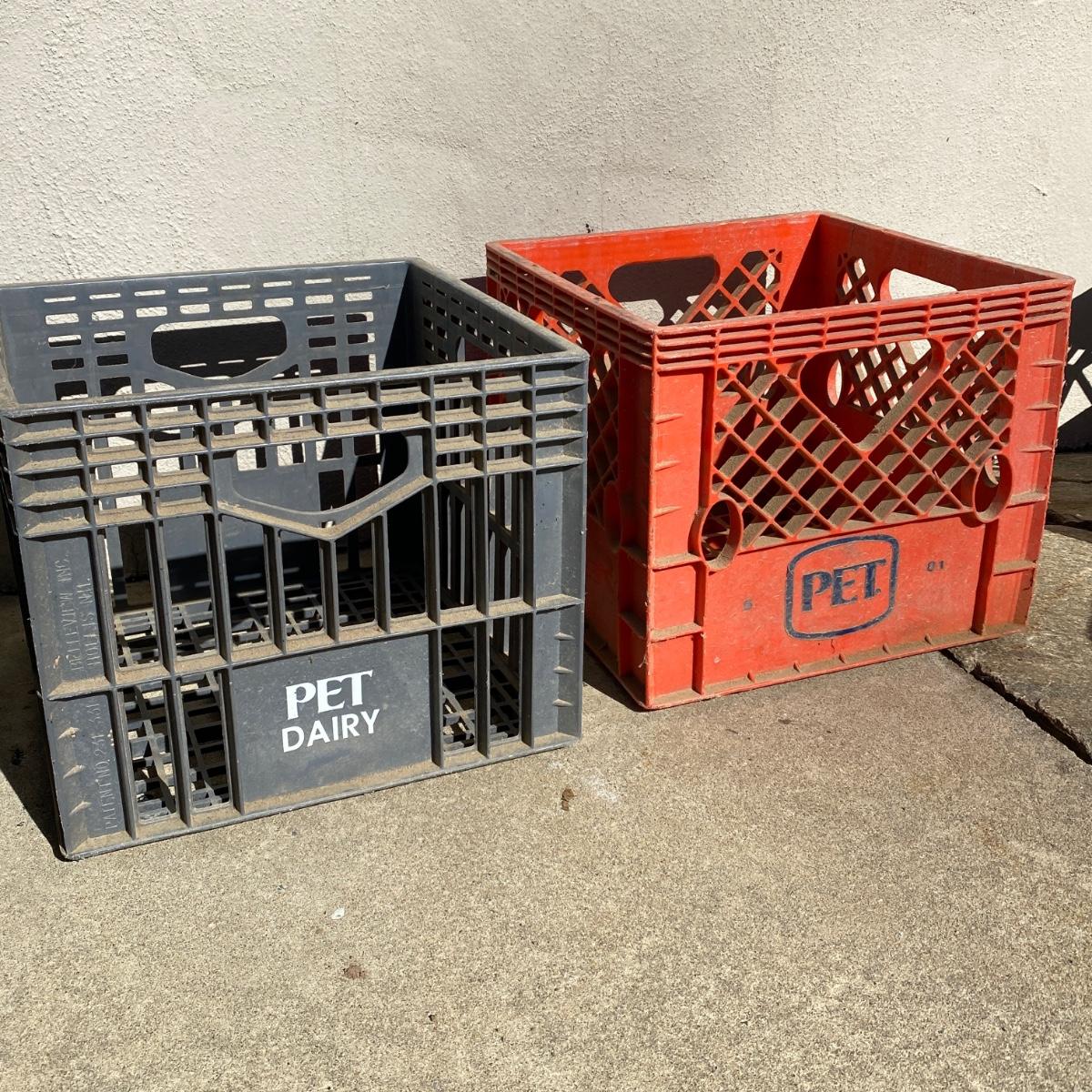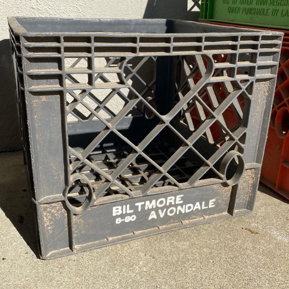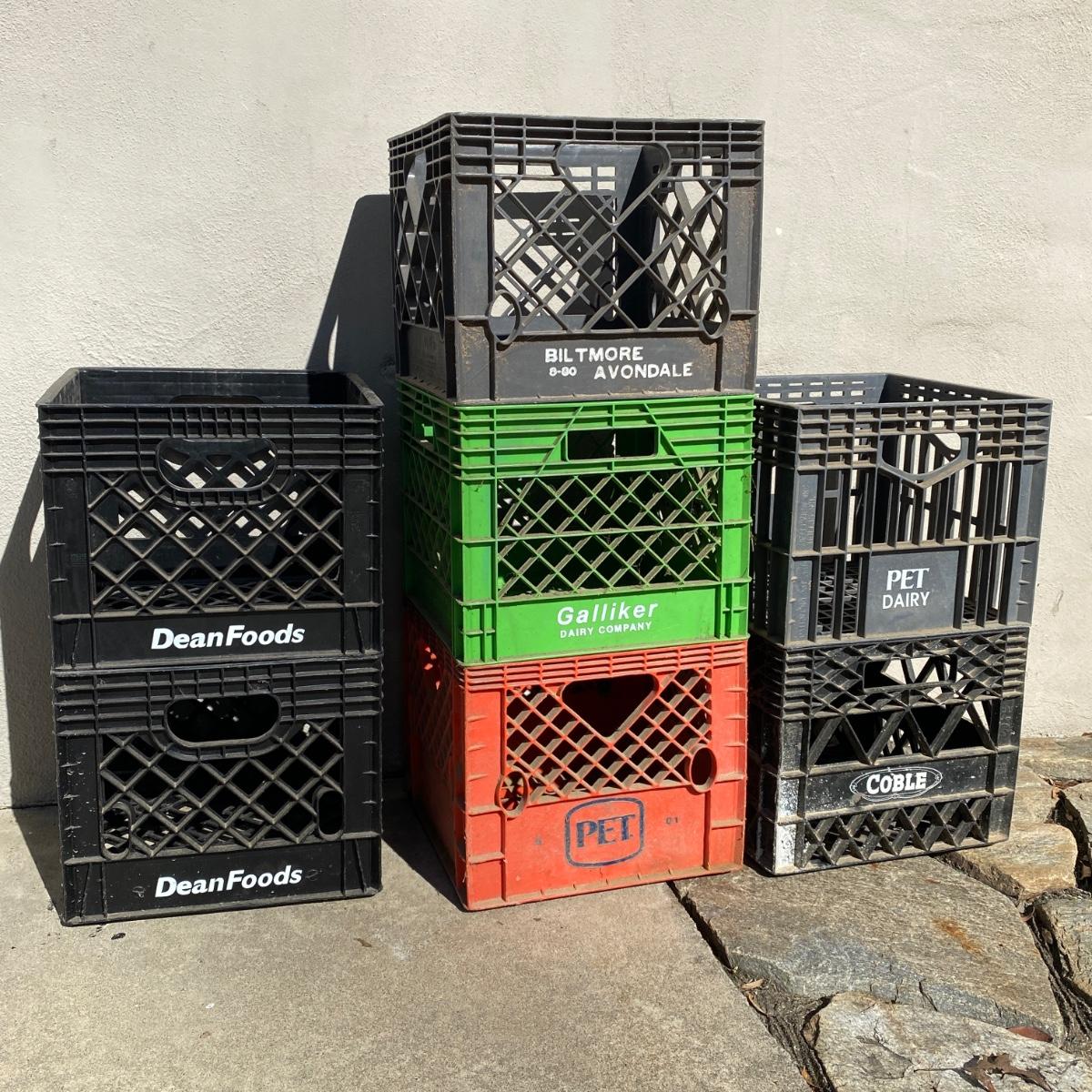 Seven plastic milk crates measuring 13” x 13” x 11” high. Stackable. Please note the fun to find Biltmore and Pet Dairy crates. All could be hosed down to remove dirt. Local pick up only