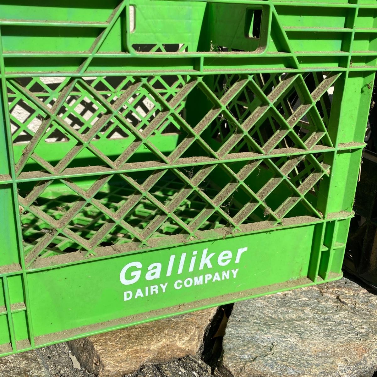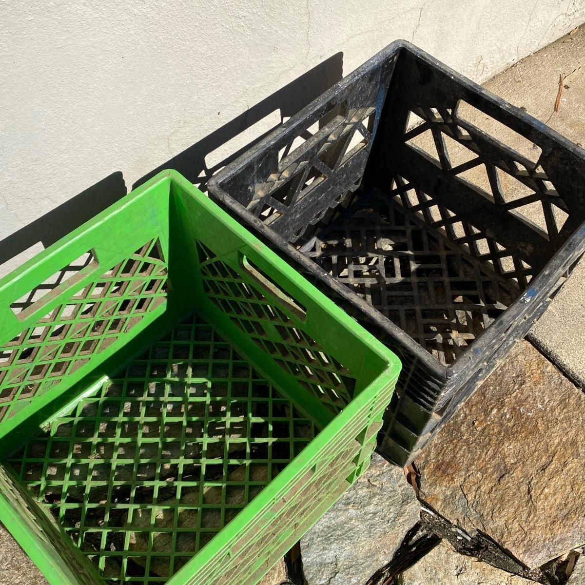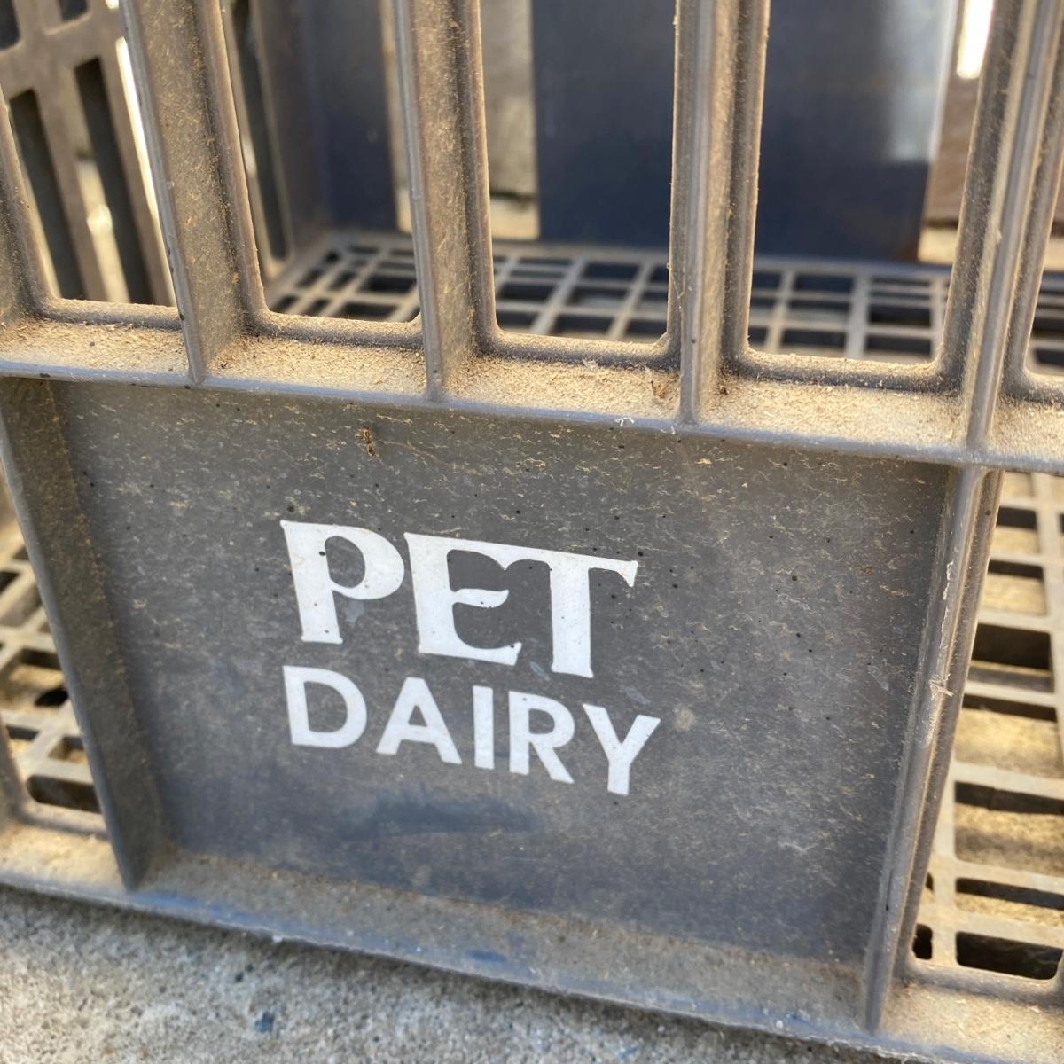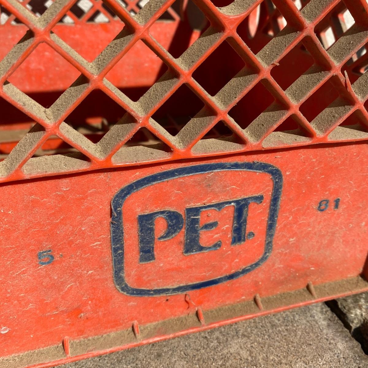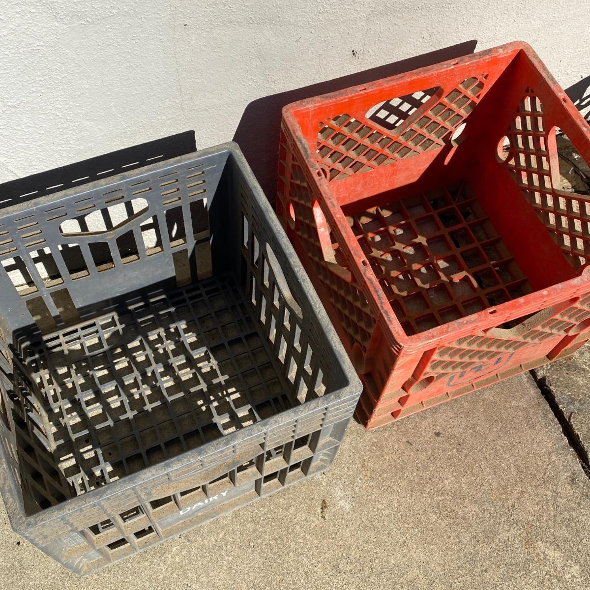 Seven plastic milk crates measuring 13” x 13” x 11” high. Stackable. Please note the fun to find Biltmore and Pet Dairy crates. All could be hosed down to remove dirt. Local pick up only