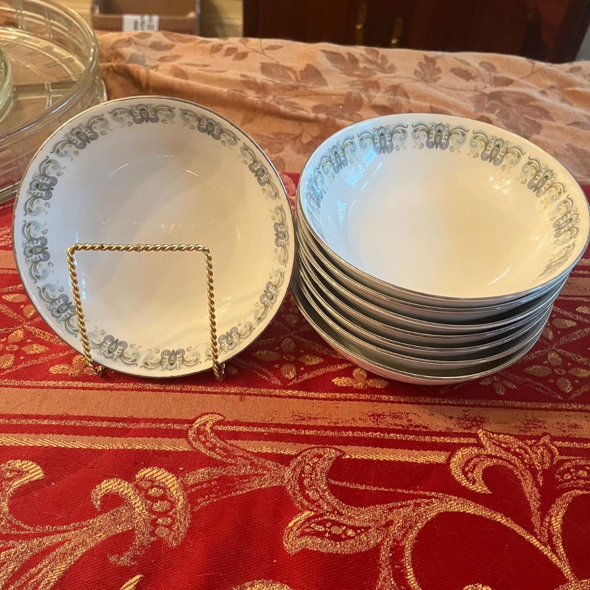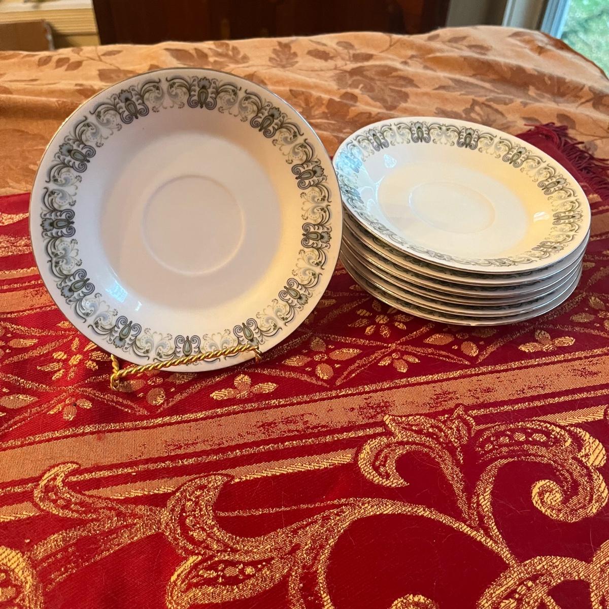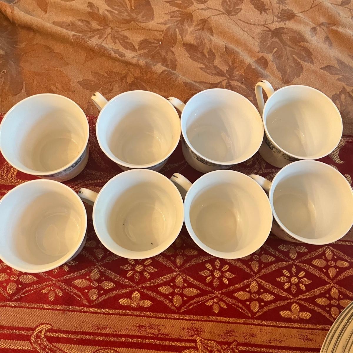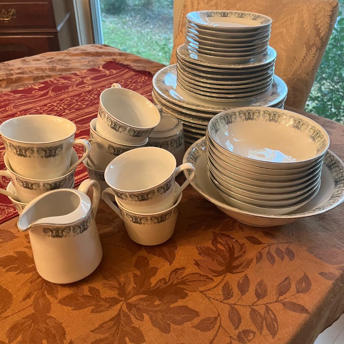 lot includes a seven person setting China set. Includes eight dinner plates, bowls, small plates and tea cups. Also includes one large bowl creamer and sugar bowl and seven saucers.