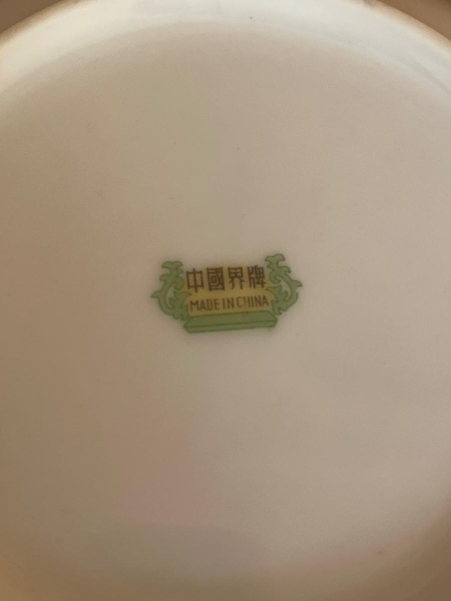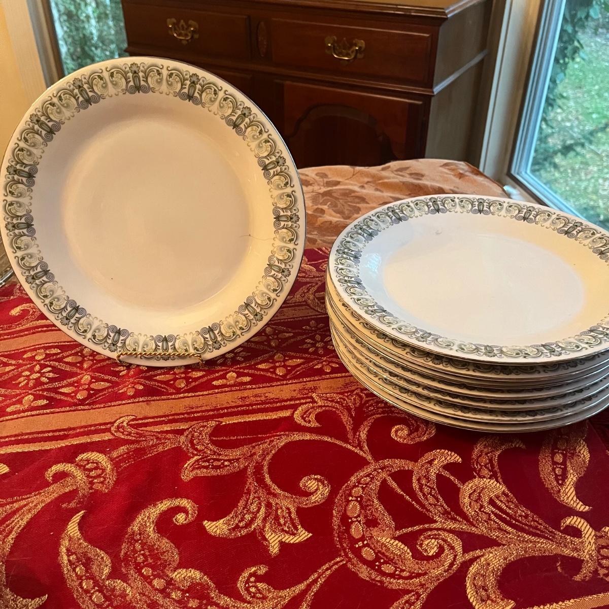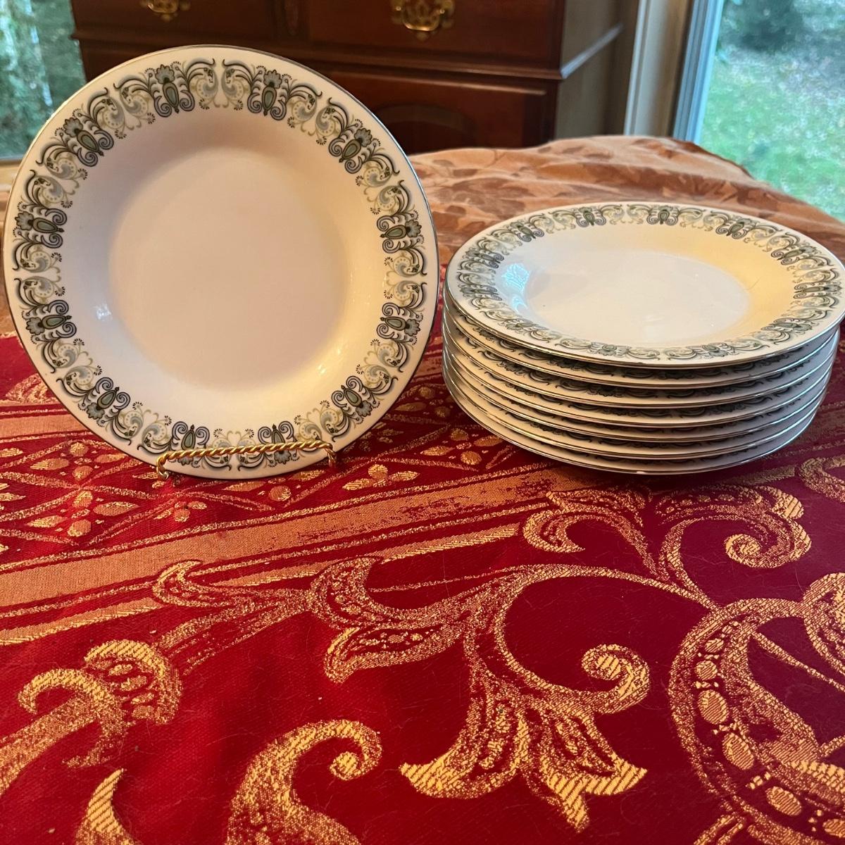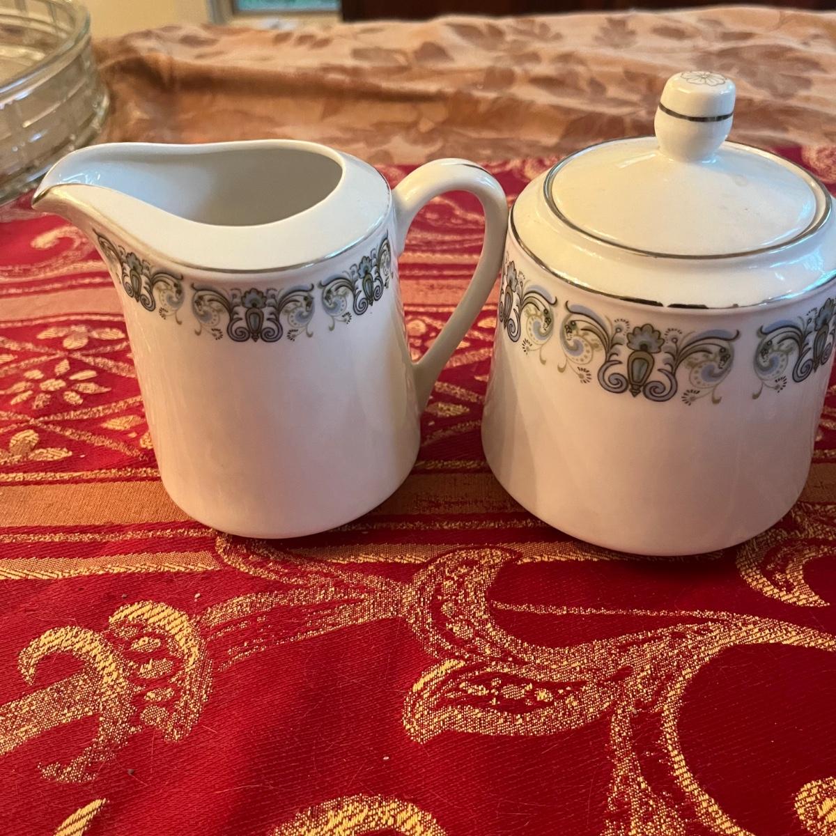 lot includes a seven person setting China set. Includes eight dinner plates, bowls, small plates and tea cups. Also includes one large bowl creamer and sugar bowl and seven saucers.