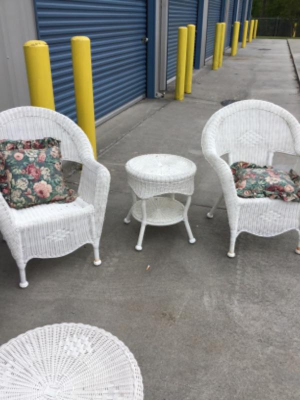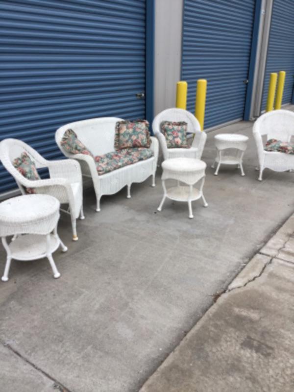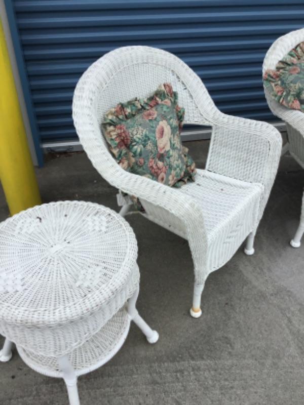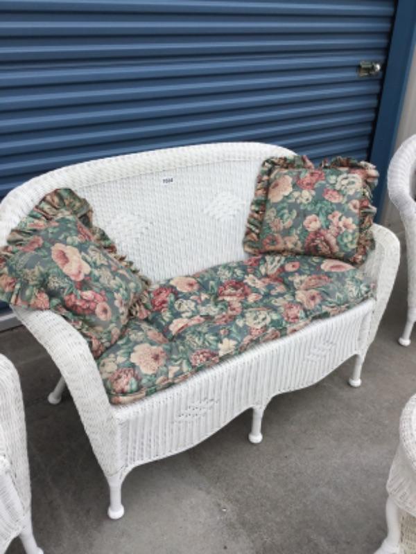 Seven piece plastic wicker set three chairs, loveseat, three tables, with cushions and pillows Lot No. 1034
