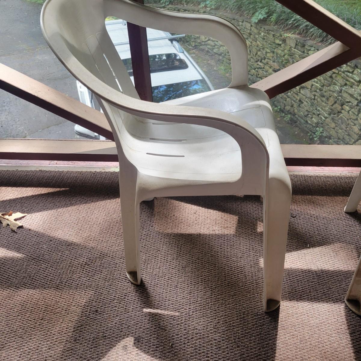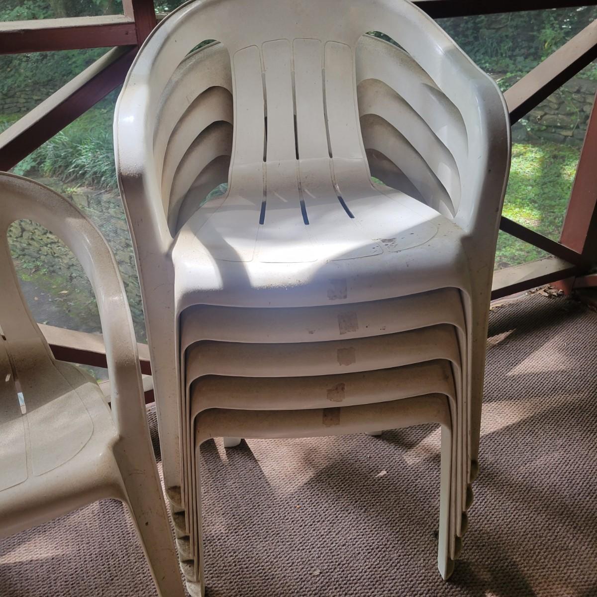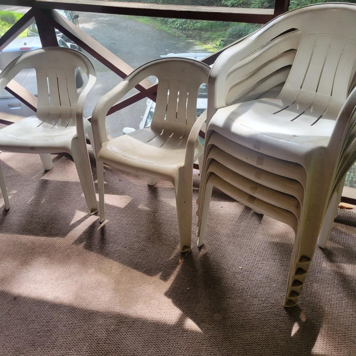Seven white, plastic patio chairs in good condition. They could use a good washing, but show no notable damage. Chairs measure approximately 21.5" x 16" x 29". Seat height is approximately 16.5 " Local pickup only