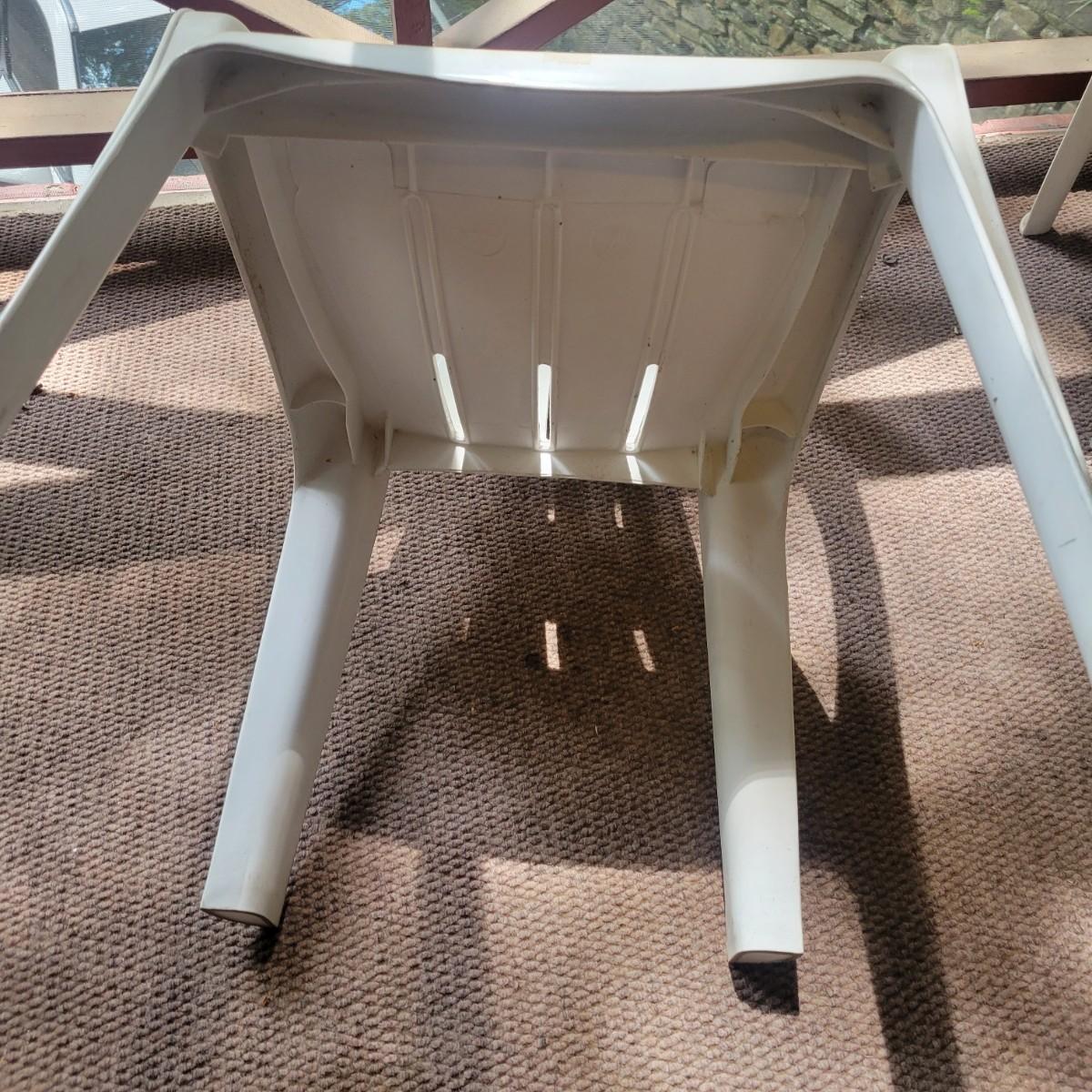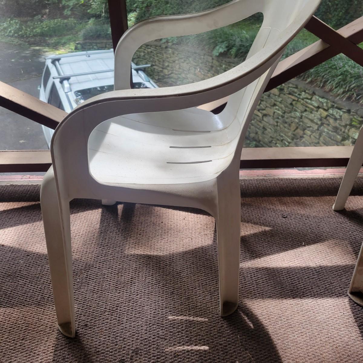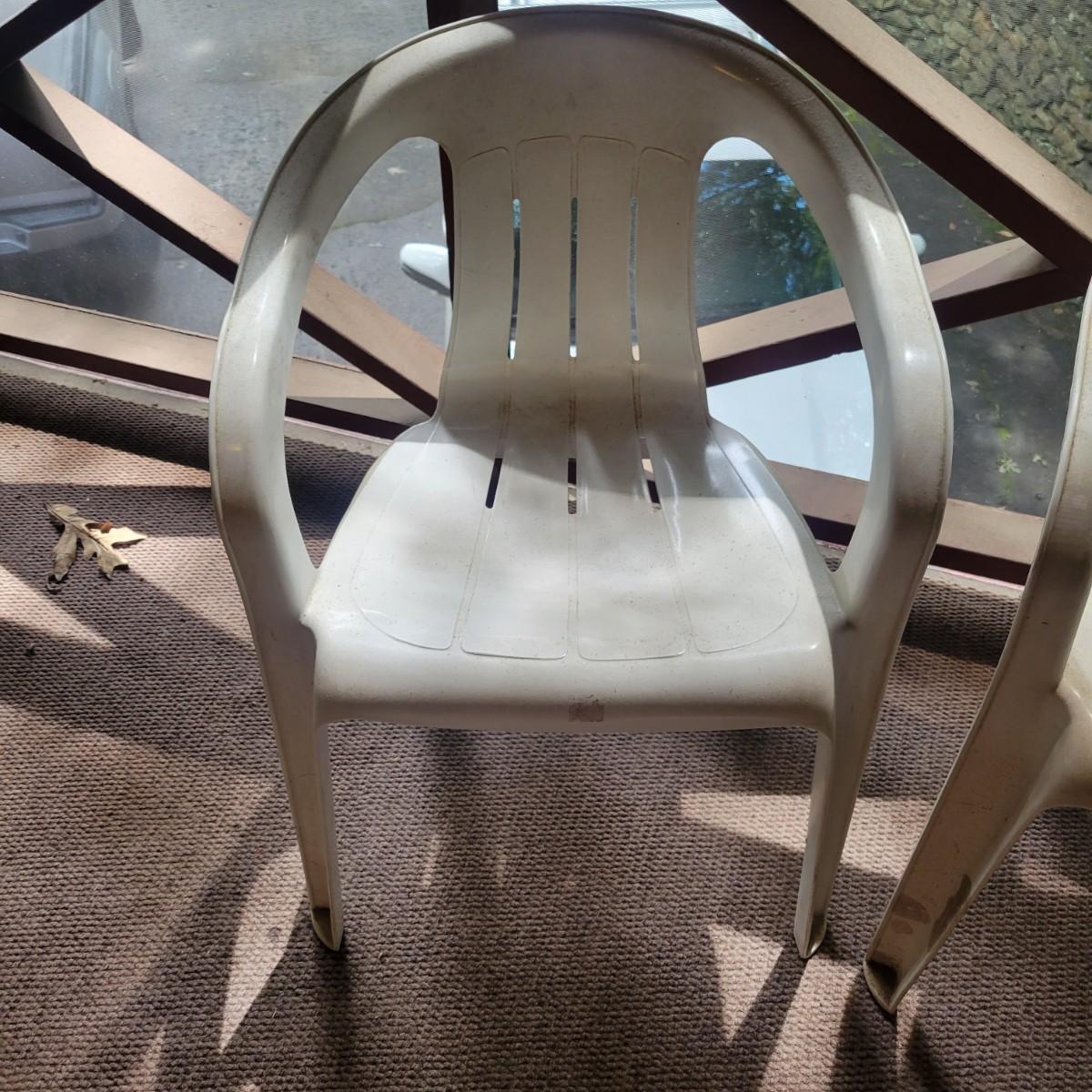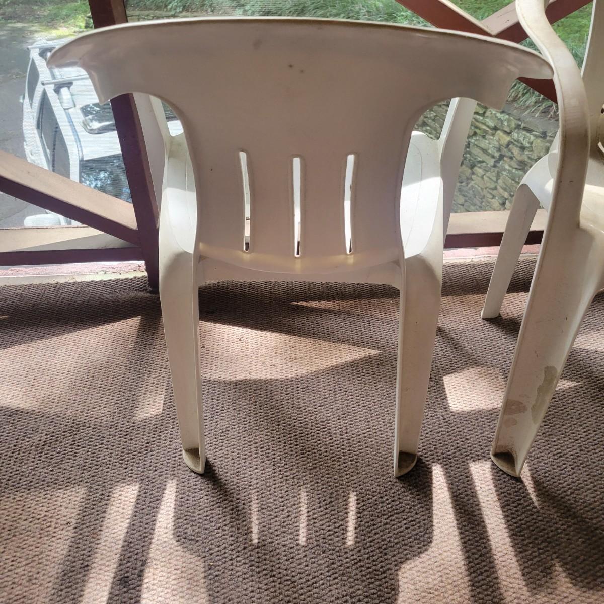 Seven white, plastic patio chairs in good condition. They could use a good washing, but show no notable damage. Chairs measure approximately 21.5" x 16" x 29". Seat height is approximately 16.5 " Local pickup only
