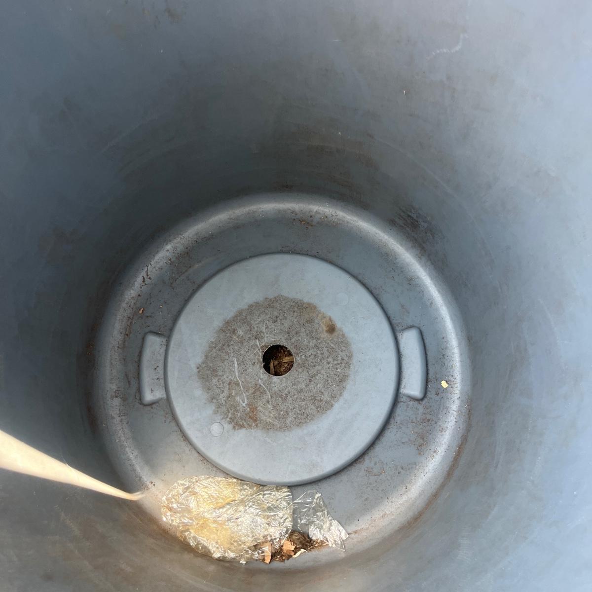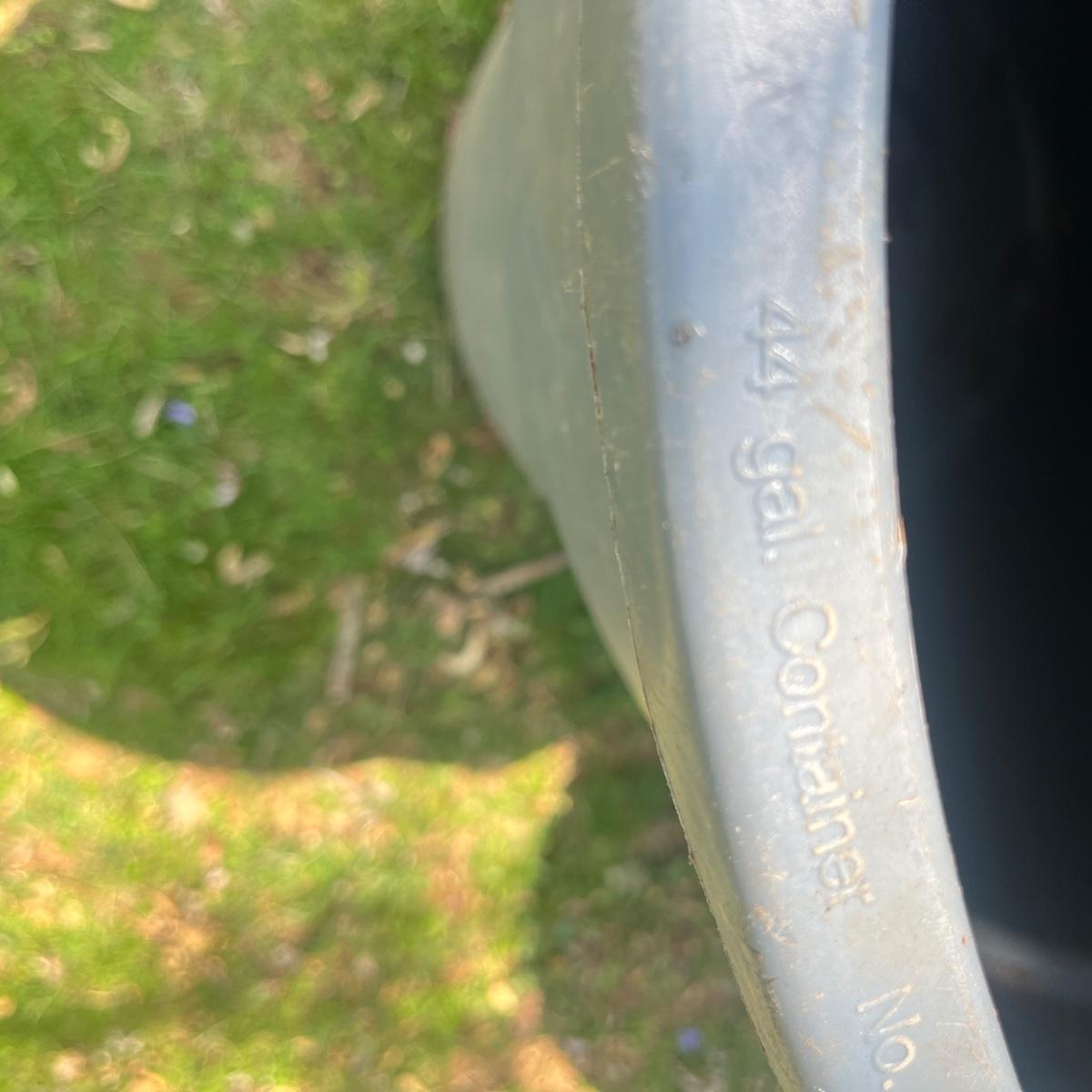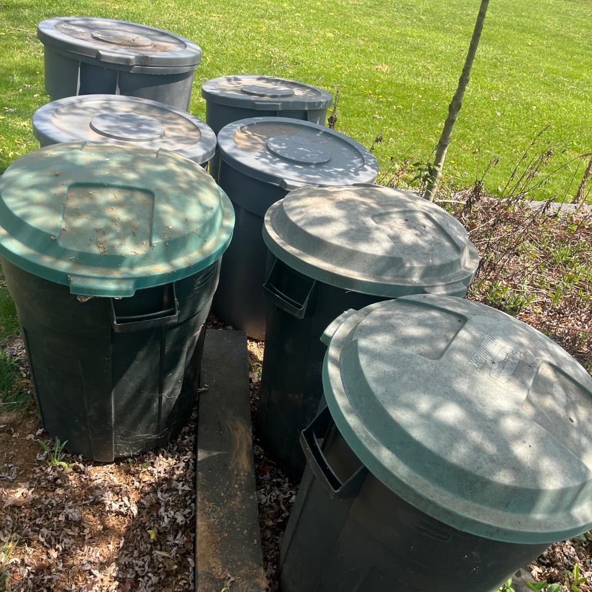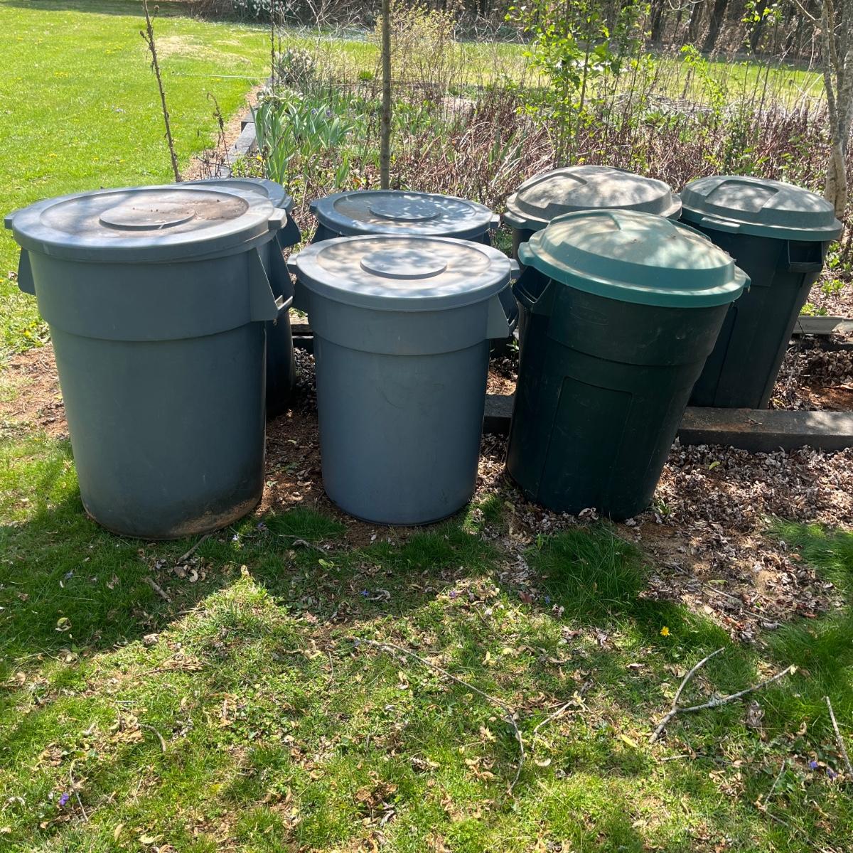 Lot includes one 44 gallon can and six 32 gallon cans. All cans have lids and most have a hole in the bottom, see pictures.